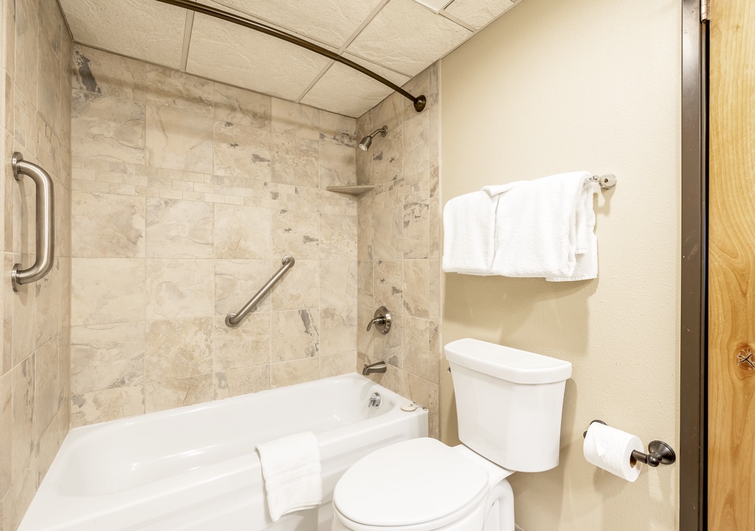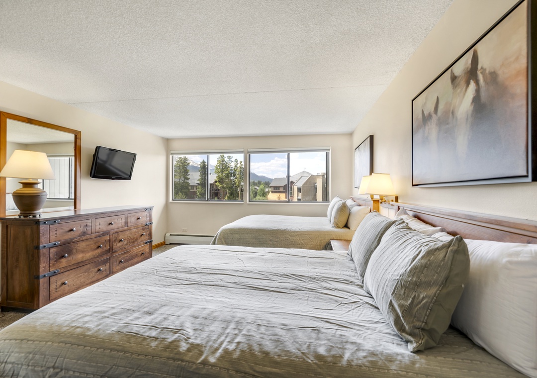 The spacious primary suite includes a king-sized bed and private ensuite bathroom, while the second bedroom offers two queen beds—ideal for families or groups. With two full bathrooms and a queen sleeper sofa in the living room, the condo comfortably accommodates up to six guests.