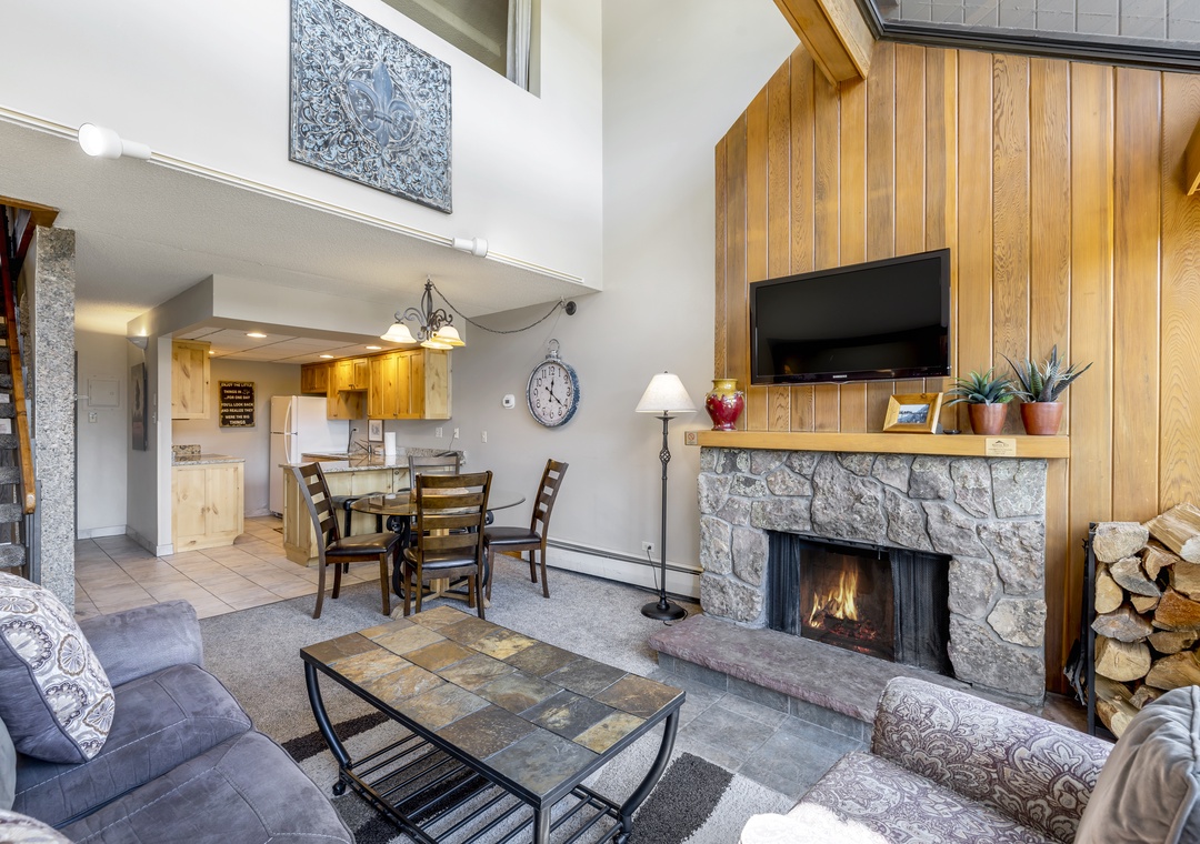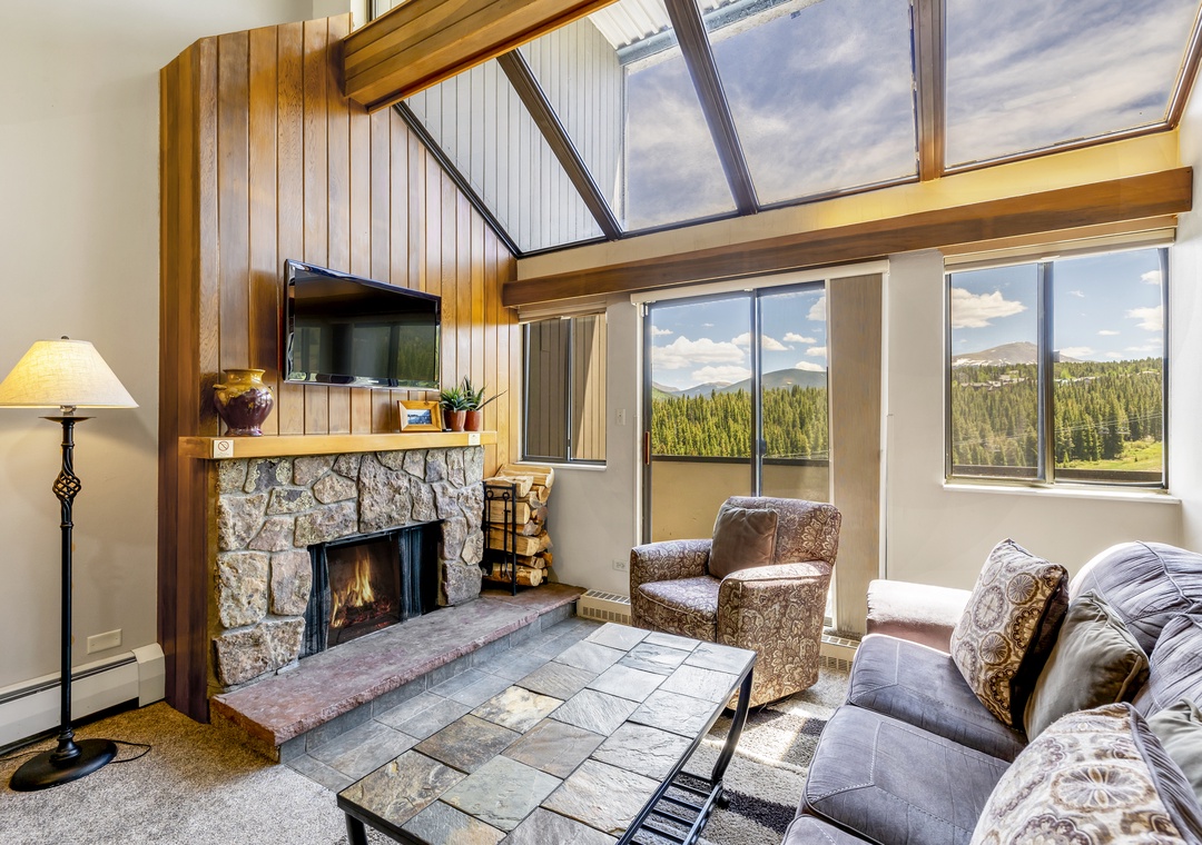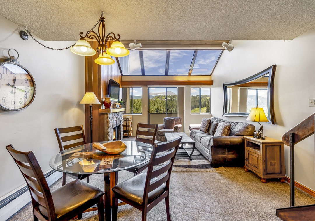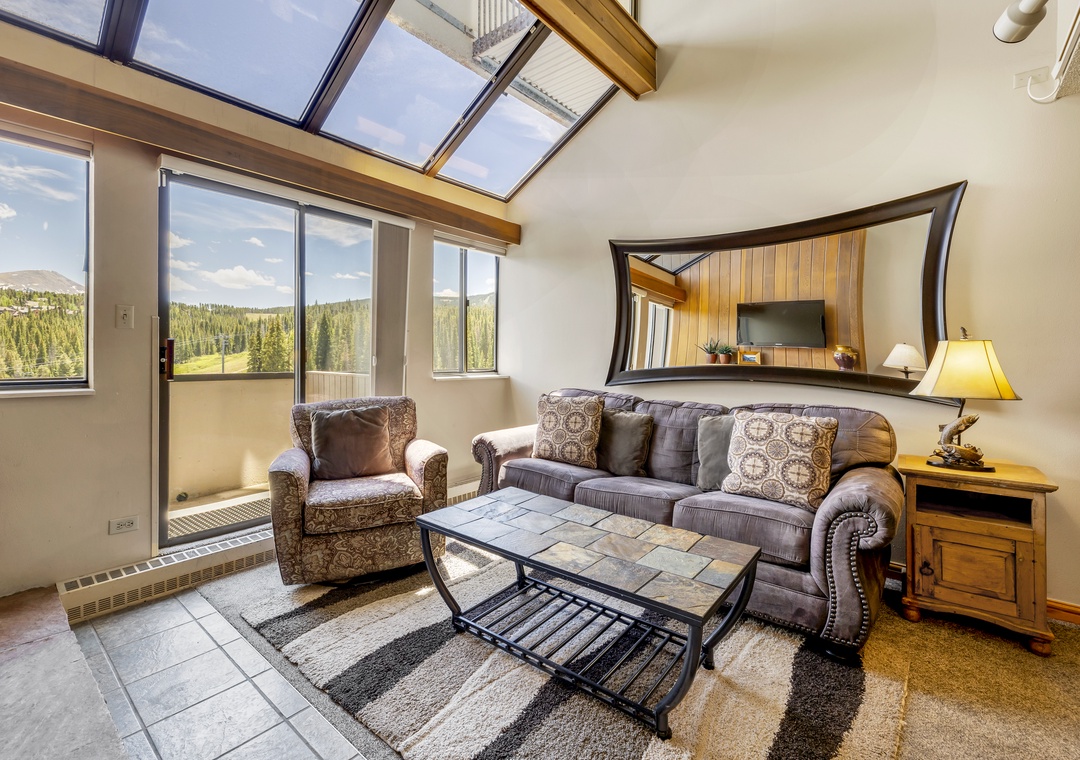 Stay slope-side at Beaver Run Resort in this unique 2-bedroom, 2-bathroom atrium-style condo that perfectly blends comfort, convenience, and resort ambiance. The open-concept living area features soaring ceilings, interior windows, and plenty of natural light. A cozy seating area and private balcony provide the perfect spots to relax after a day on the mountain. The fully equipped kitchen with full-size appliances and dining area makes it easy to enjoy meals at home.