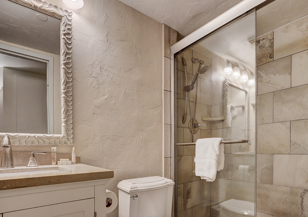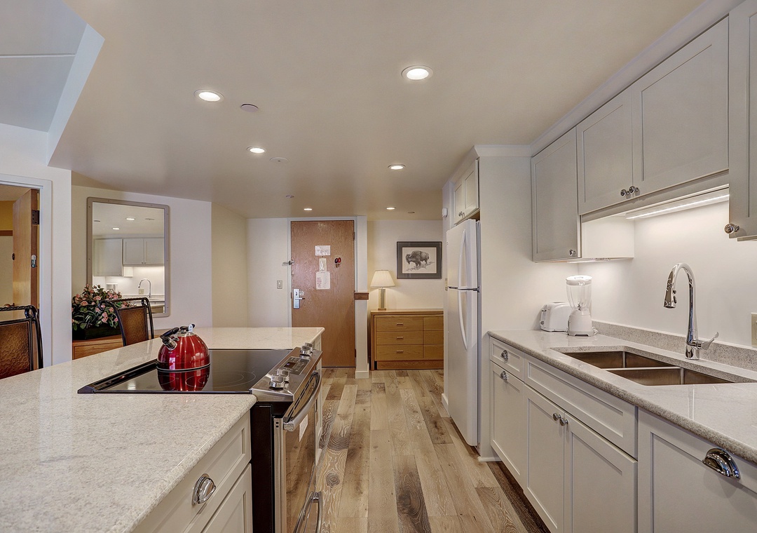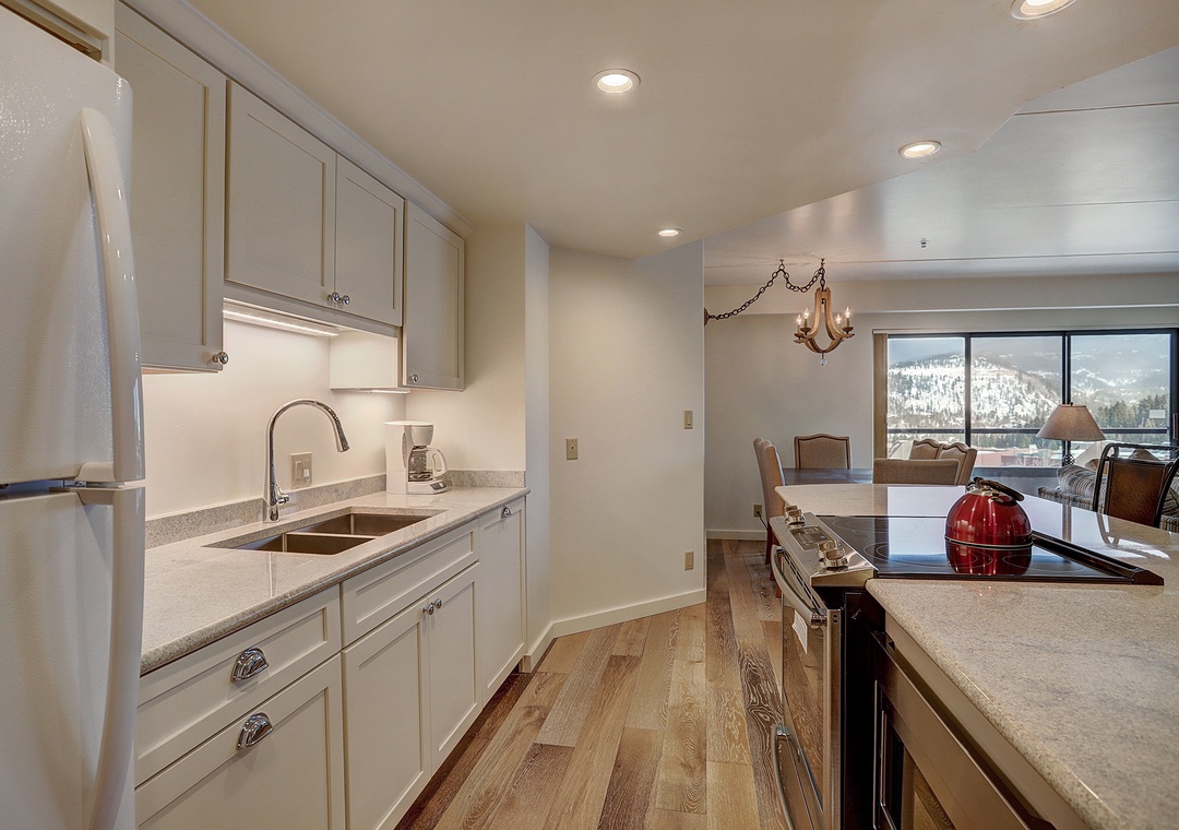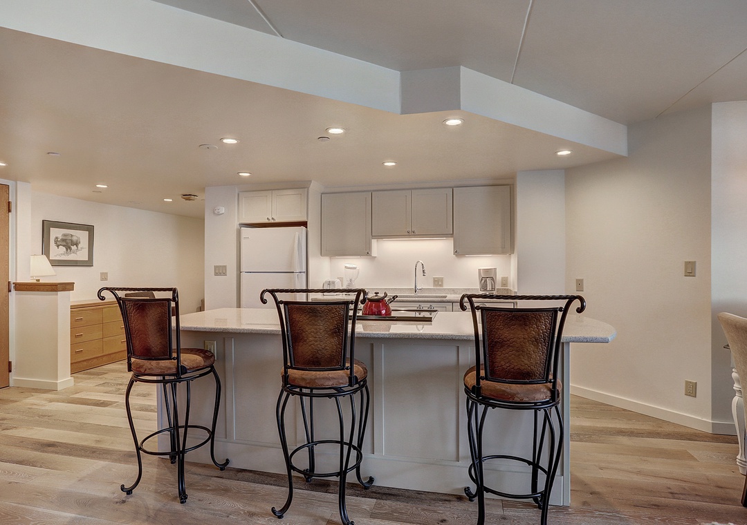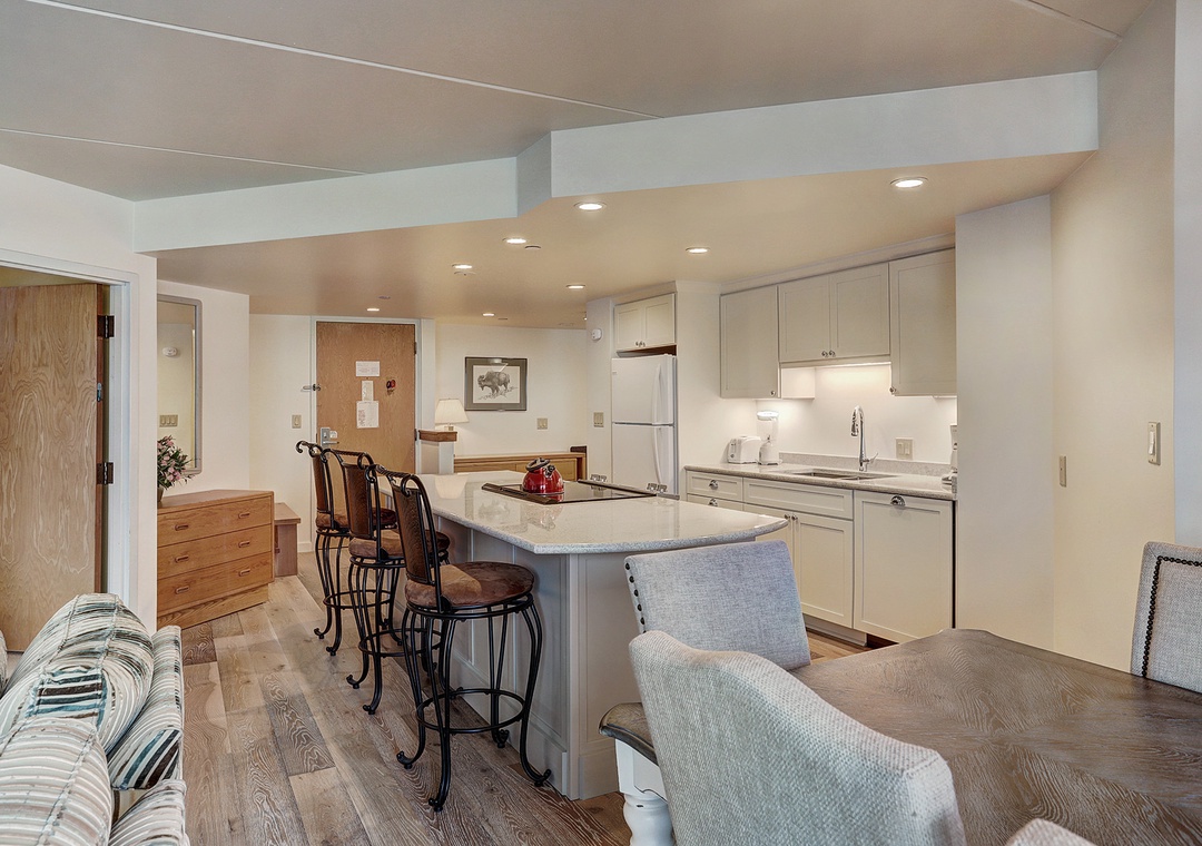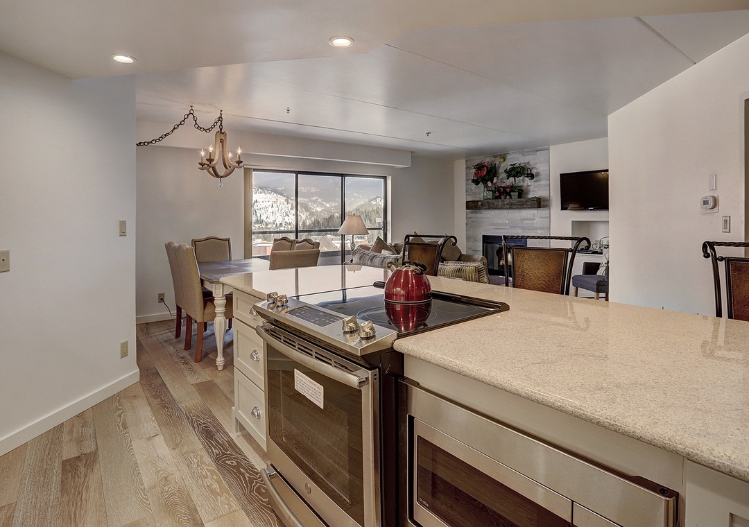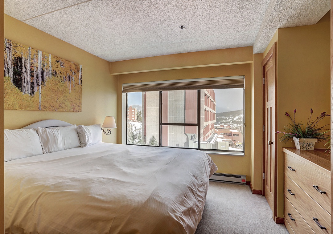 This beautiful two-bedroom, one-level condo at Beaver Run offers a stylish alpine retreat with abundant natural sunlight and modern finishes. The living area features a cozy stone fireplace, while the fully equipped kitchen makes it easy to prepare meals for family and friends. Guests can enjoy the private balcony with breathtaking mountain views or unwind next to the fireplace on snowy days. Both bedrooms are comfortably appointed with king beds, and the queen sofa sleeper provides additional sleeping space for a total of six guests.