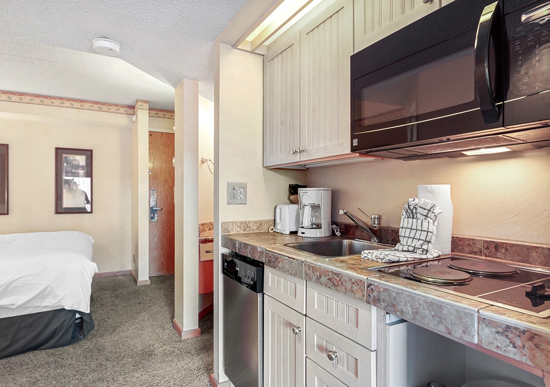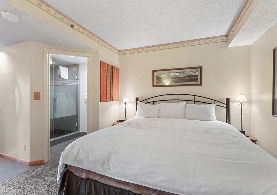 This cozy Studio Suite at Beaver Run offers a comfortable alpine retreat for up to four guests. The suite features a king bed and a queen sleeper sofa, with a split amenity bathroom and walk-in shower for added privacy. Guests will enjoy a convenient kitchenette, a flatscreen TV, and a private balcony to relax while taking in the mountain air and scenery. The suite is located entirely on one level, providing an open and functional layout perfect for a short stay or extended getaway.