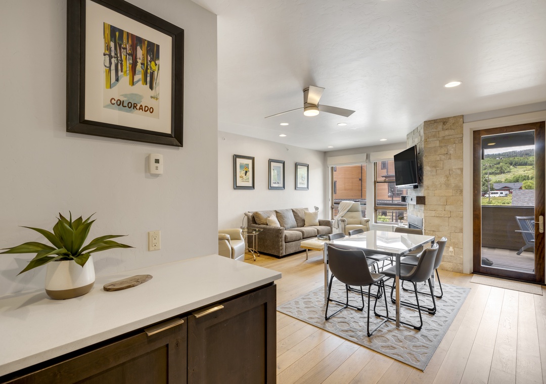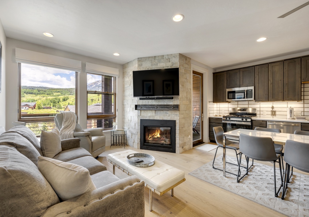 Step inside to find an open concept living space filled with natural light and warm mountain touches. The spacious living room features a gas fireplace, comfortable seating, and large windows that frame the tranquil views that surround you. It’s the perfect spot to relax after a day of skiing, hiking, or exploring all that Summit County has to offer.