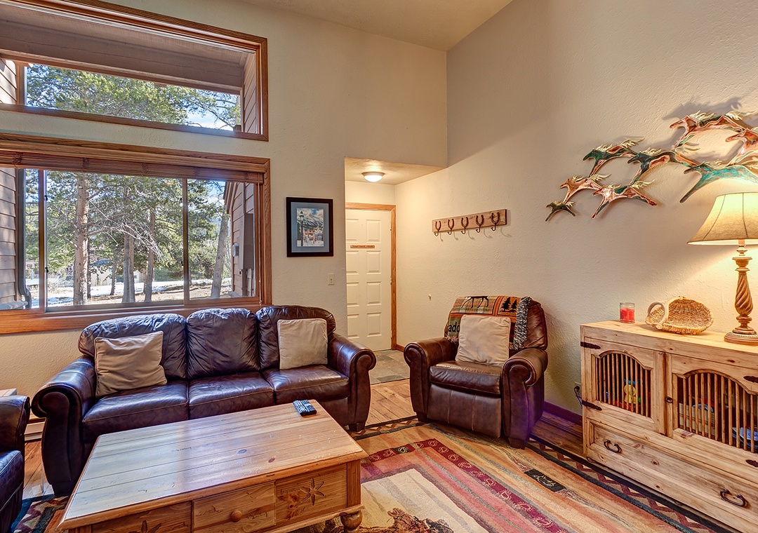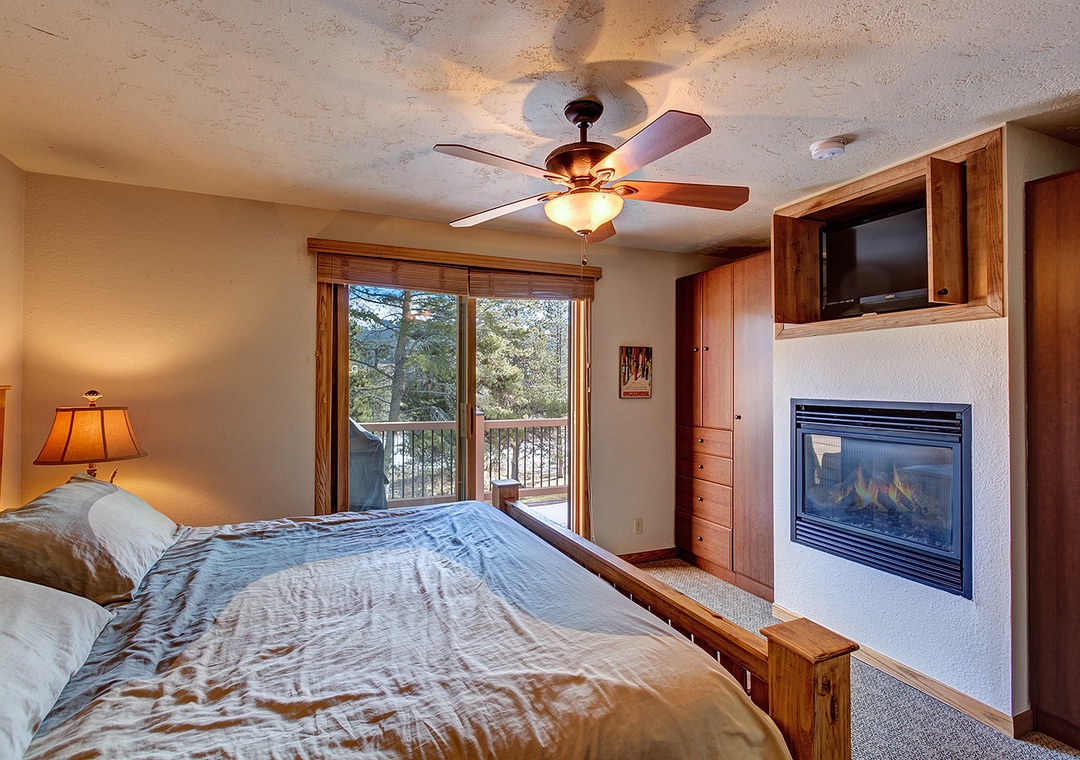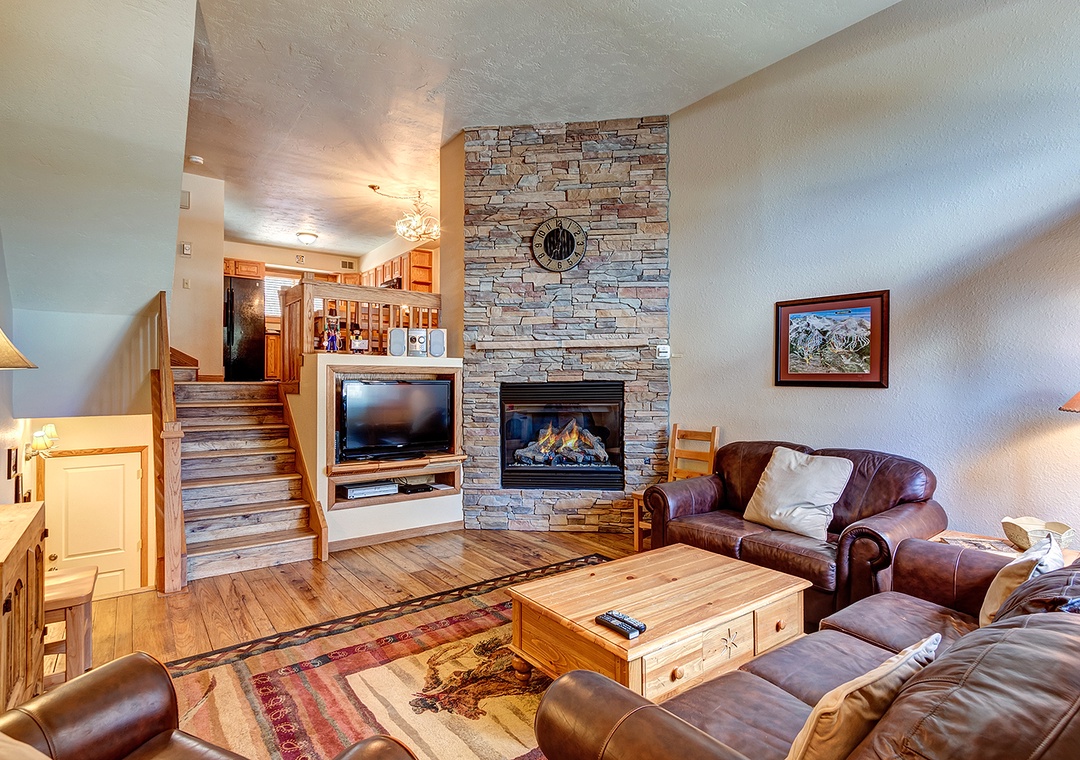 This Cedars two bedroom plus den townhome is in the coveted "front row" location at the base of Peak 9 just steps above the Quicksilver chairlift. This property has been recently refurbished with beautiful hardwood flooring in the living and dining levels. Additionally, each bedroom features its own gas fireplace and flatscreen TVs. There is also a small deck accessible from the primary bedroom. There is an additional sleeping area on the lowest level, furnished with a bunk bed and TV. This property also features a gas-burning fireplace in the living room, washer/dryer, Wi-Fi, a sunny deck, and beautiful mountain furnishings. Guests will also have use of the Upper Village outdoor heated pool and hot tubs approximately 150 yards off-site.