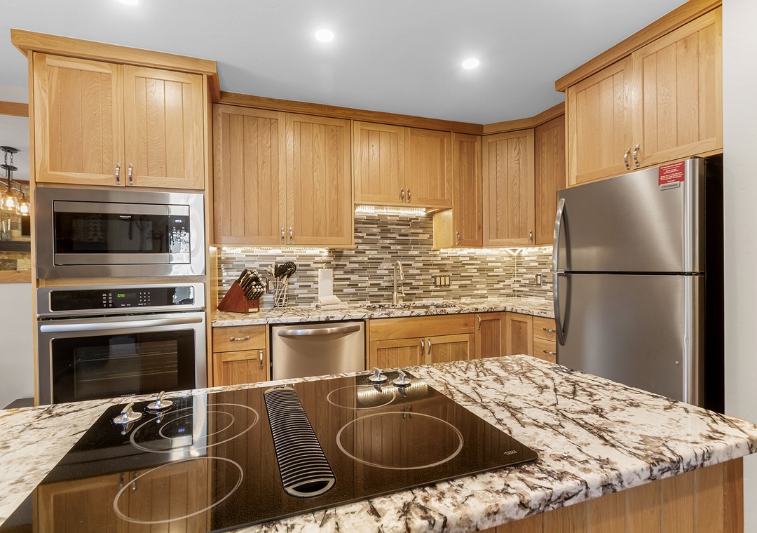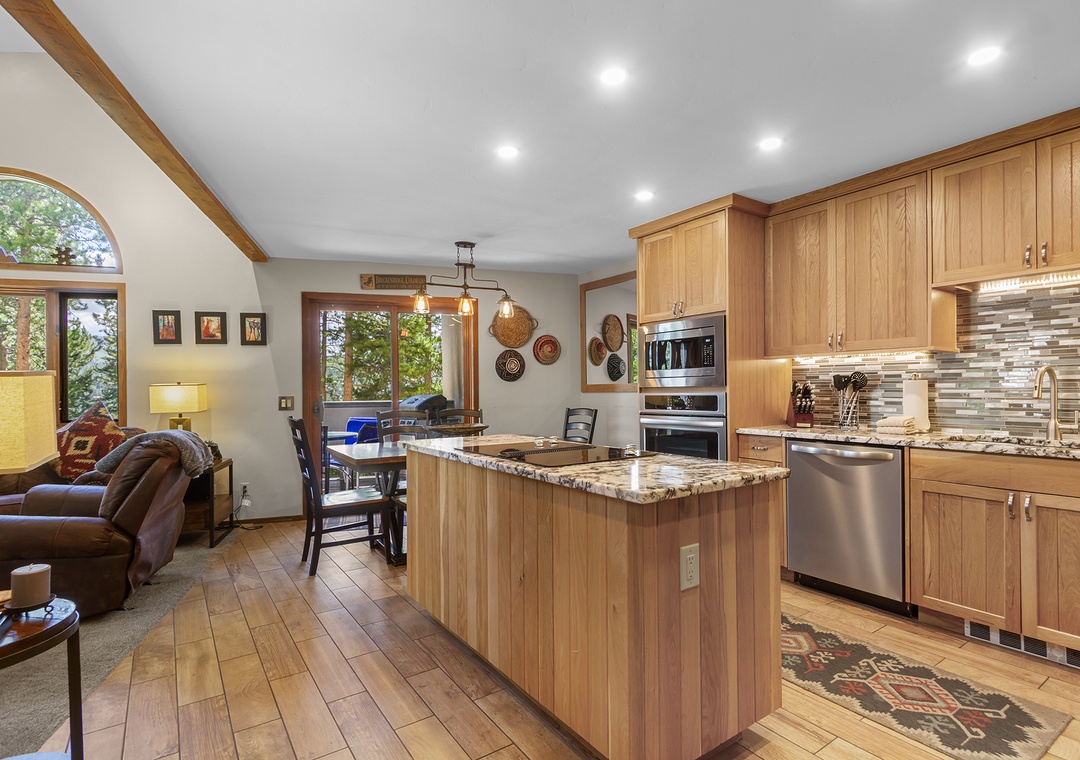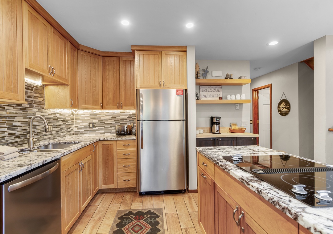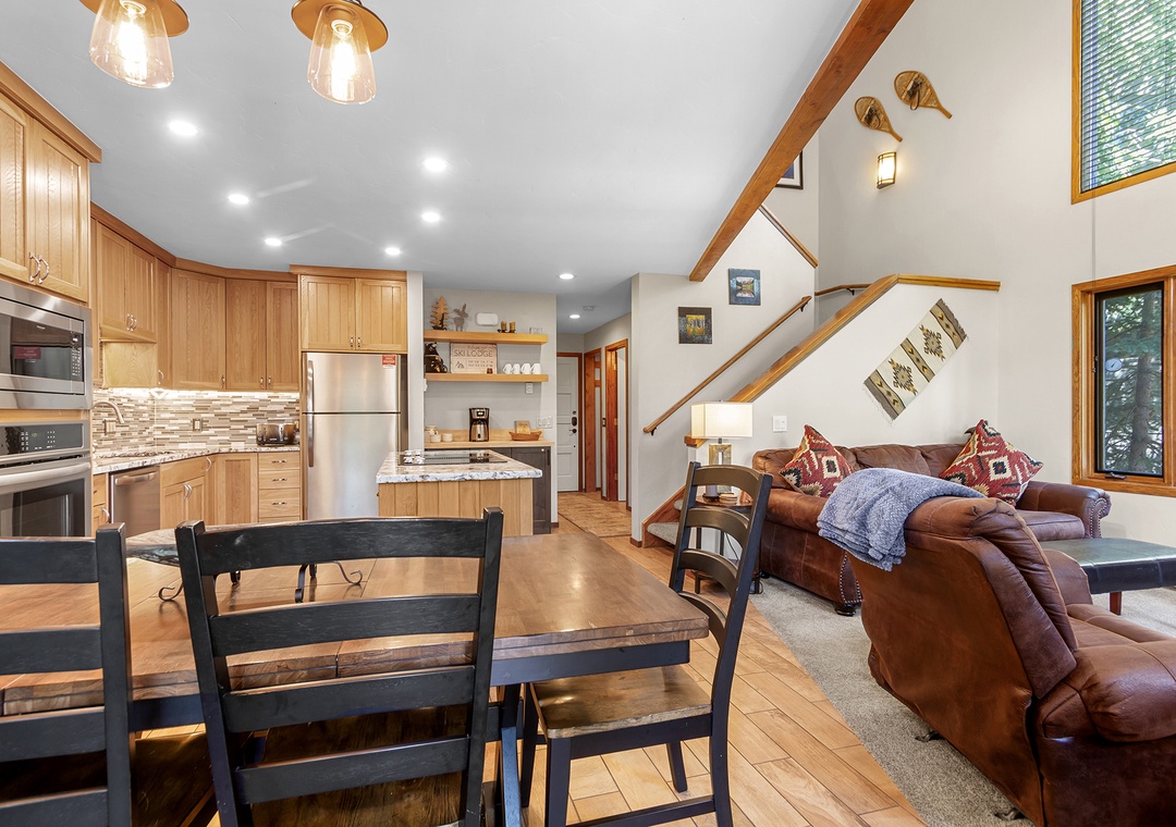 One of the standout features is the well-stocked kitchen, thoughtfully outfitted with high-end cookware and appliances. You'll find everything needed to cook full meals with ease. Whether you're whipping up breakfast before first chair or hosting a group dinner, this kitchen is ready for serious home chefs.