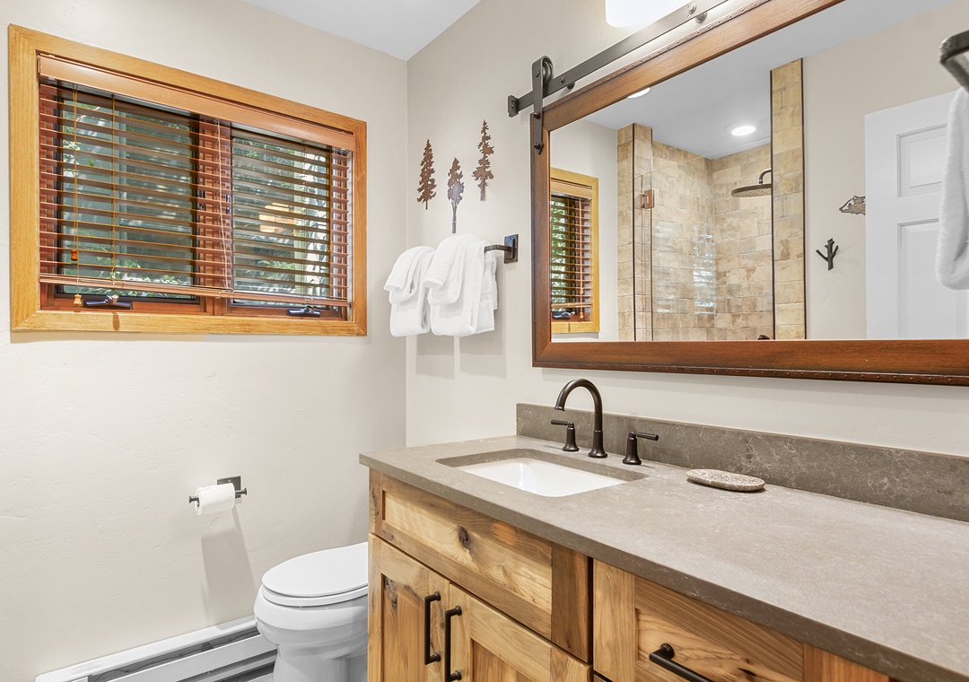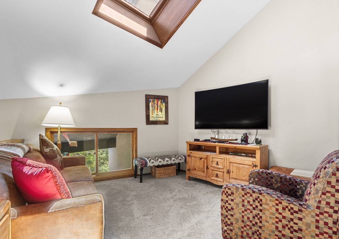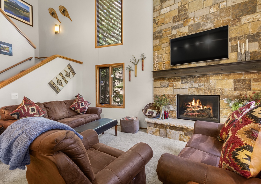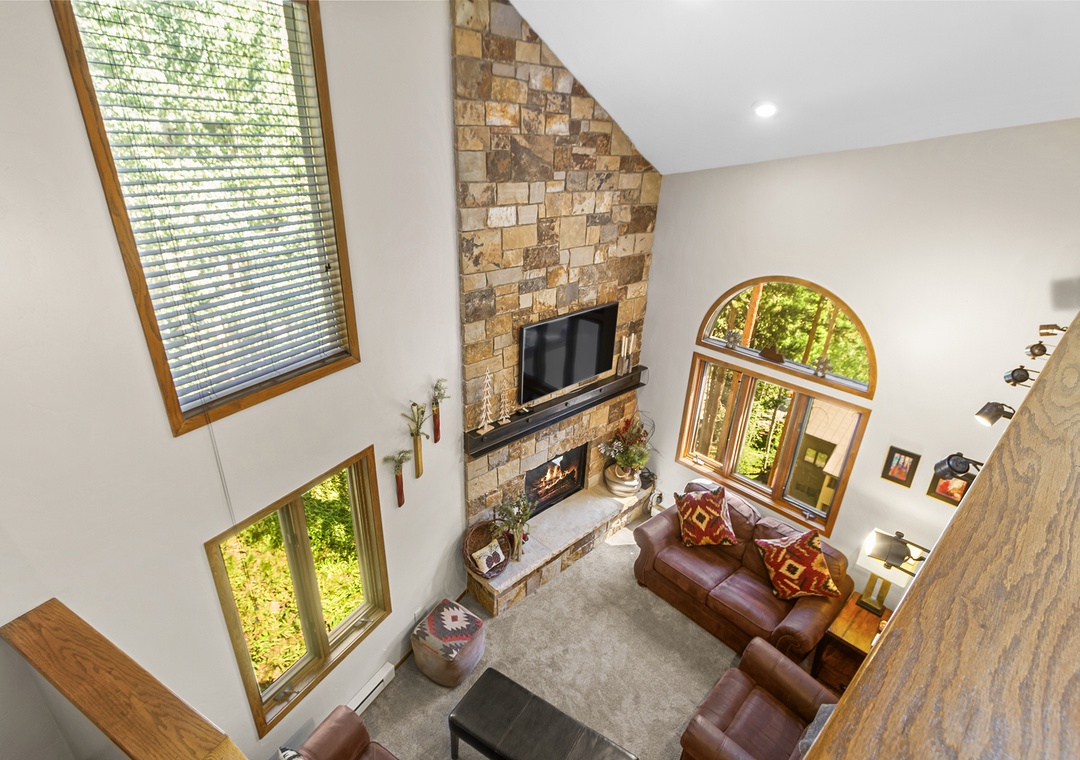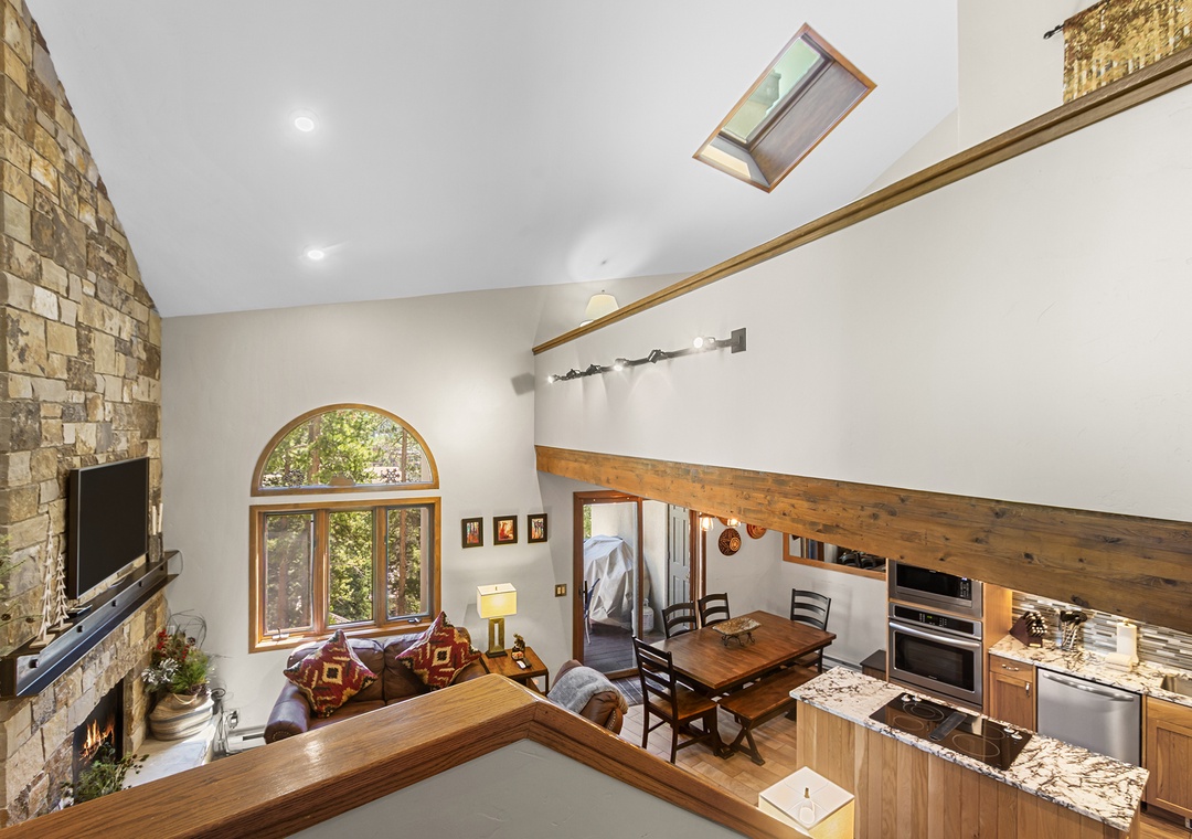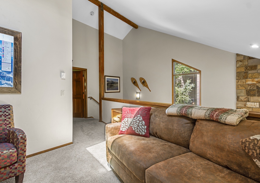 With three bedrooms, a spacious loft, and three full bathrooms, the home comfortably hosts up to 10 guests. Its multilevel layout offers a balance of privacy and shared space, ideal for families or groups traveling together. Vaulted ceilings, big windows, and a cozy stone fireplace set the tone for relaxing evenings after your mountain adventures.