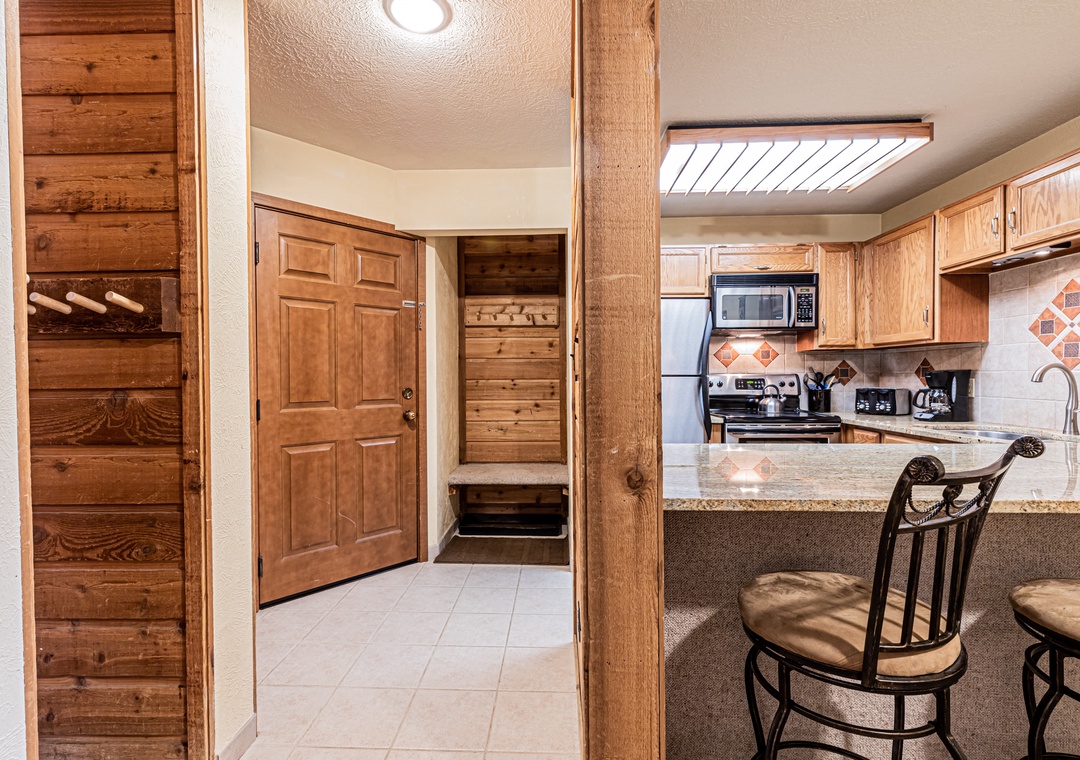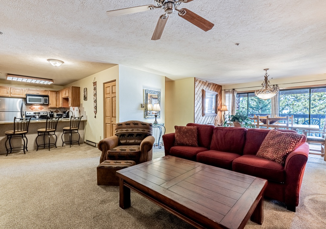 This two bedroom condominium offers a large living area. The rustic decor of both the complex and the unit will make you feel at home in the Rocky Mountains. In addition to the complex hot tubs, you will also enjoy the close proximity to both Main Street and the Quicksilver Super Chairlift. This unit has a fireplace and a full kitchen.