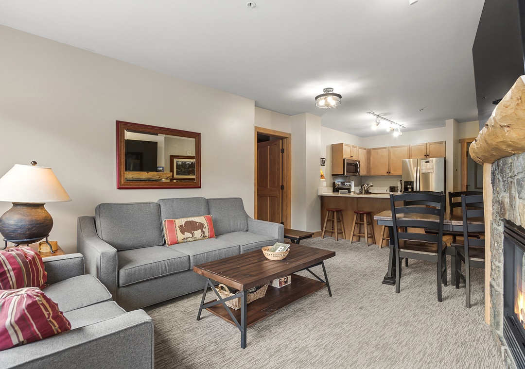 Just steps away from the Super Bee Lift, this two bedroom - two bathroom condo comfortably sleeps up to six guests. You'll appreciate the modern decor, hardwood floors, and ample natural light throughout the unit. The living room is the perfect spot to relax after a day of skiing or hiking, with a comfortable furniture, large flat-screen TV and gas fireplace.
