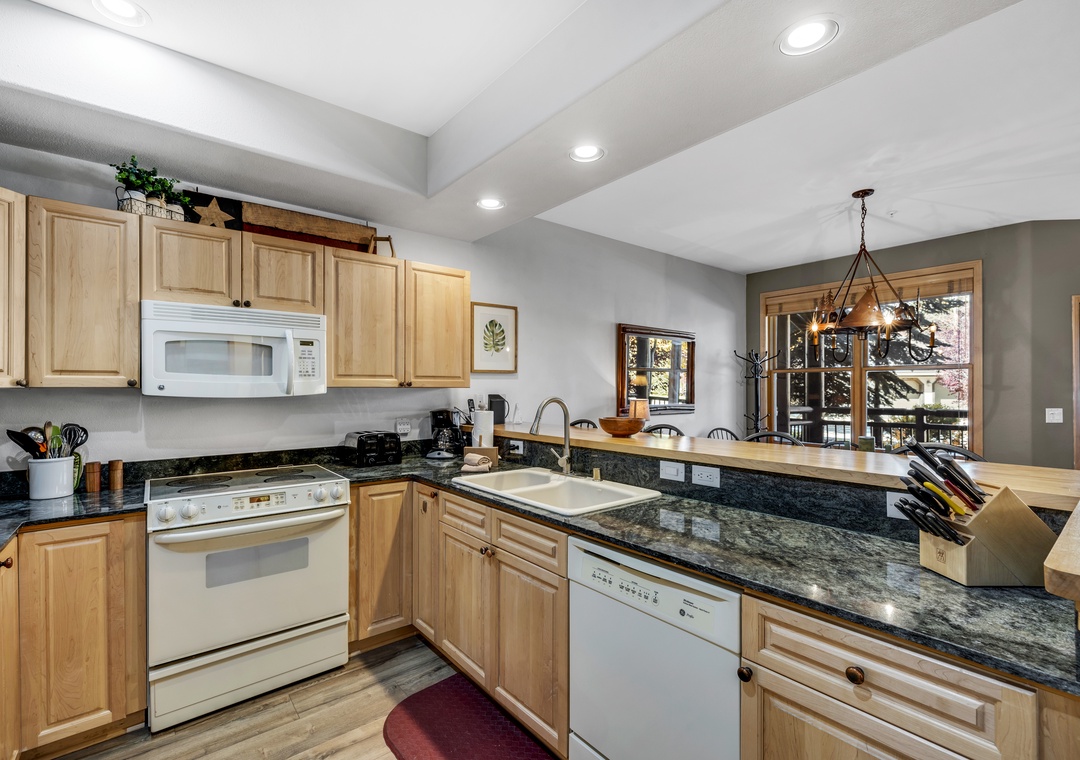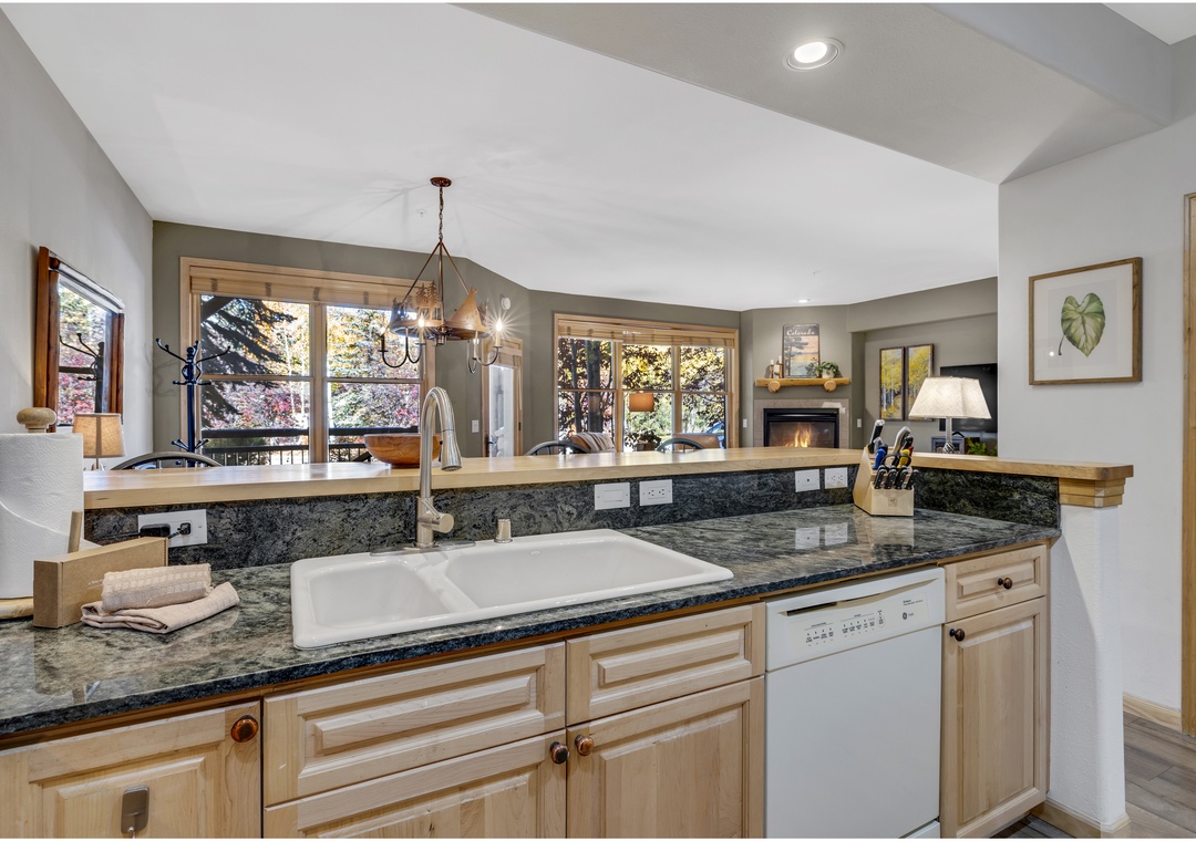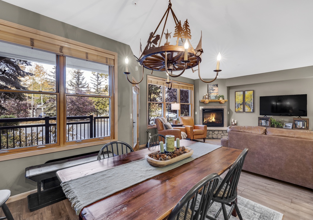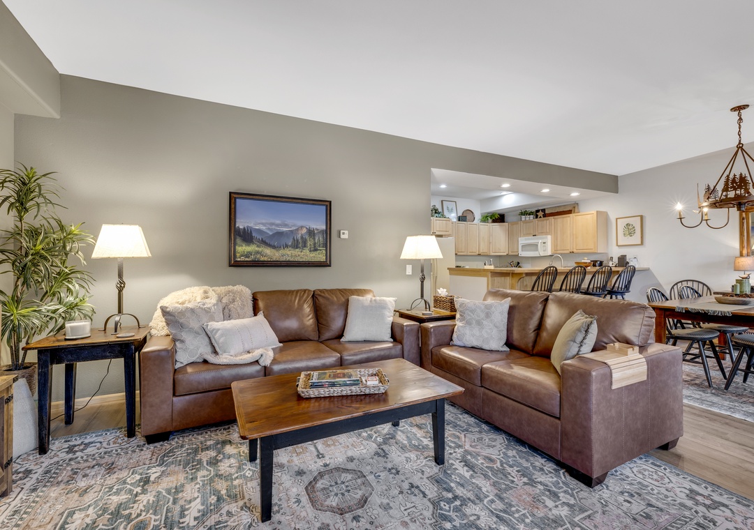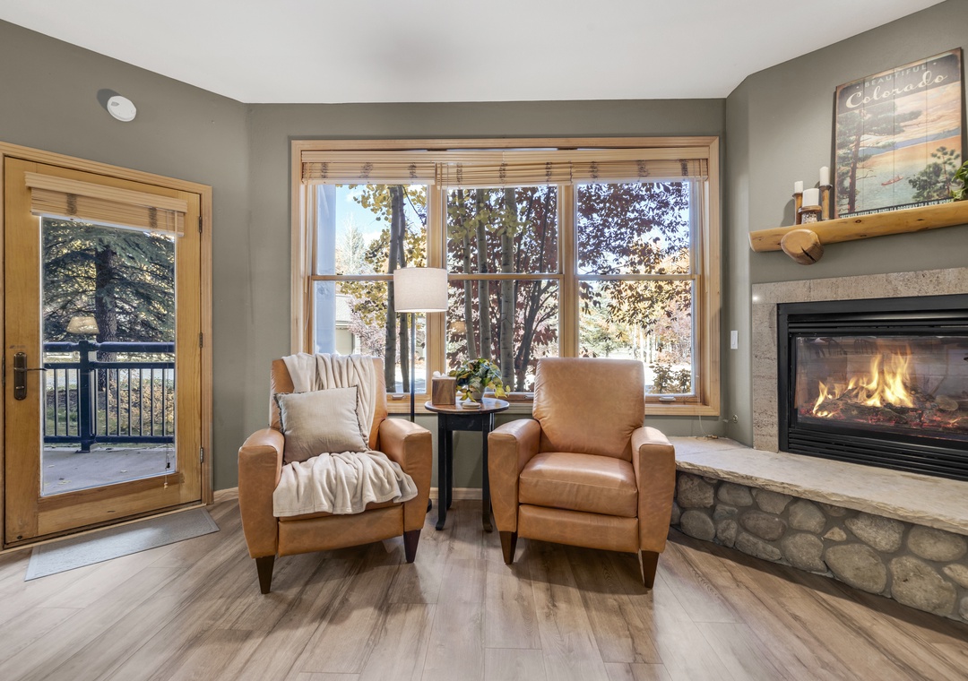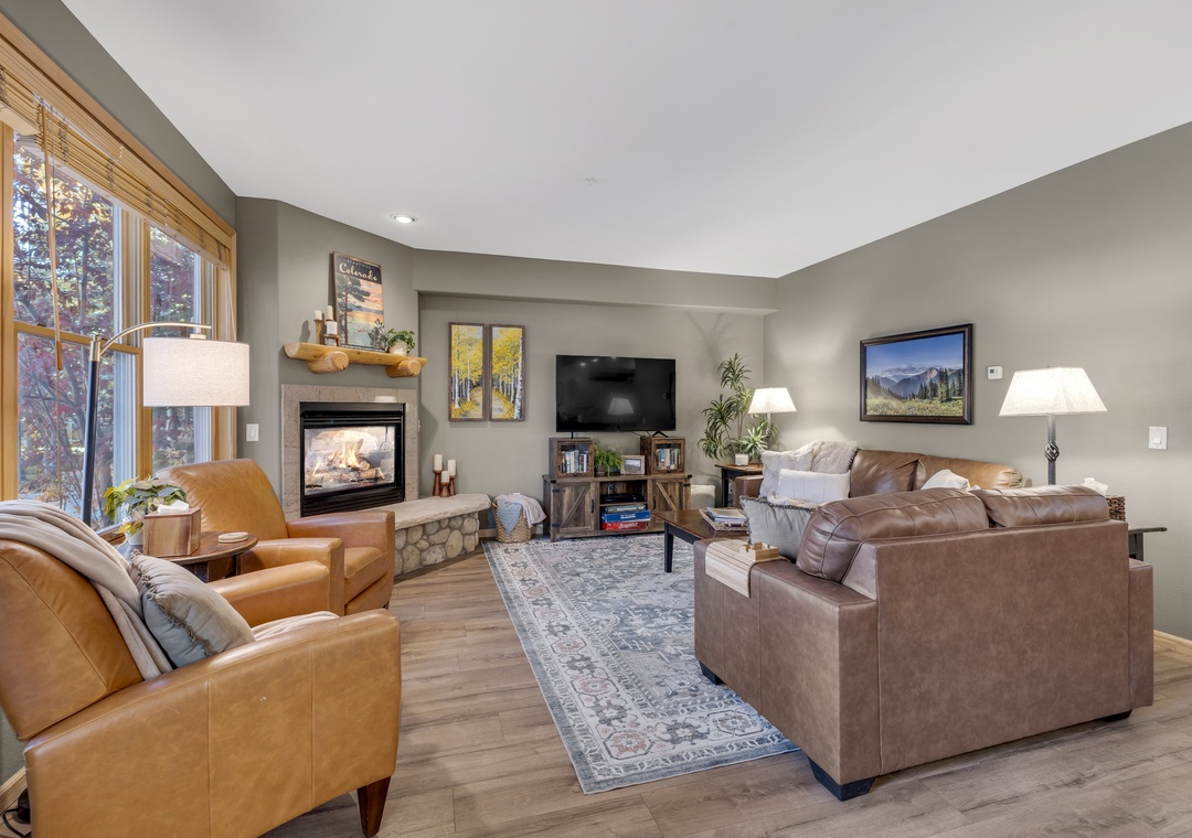 The unit features a thoughtfully designed interior with a spacious and open floor plan that ensures comfort and functionality. The living area is a warm and inviting space with plush seating centered around a gas fireplace, perfect for unwinding after a day of exploring the slopes or hiking trails. You’ll enjoy lots of windows with natural light and a patio that opens up right to the surrounding walkways.