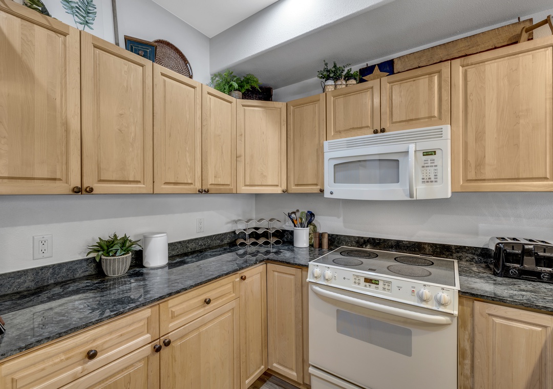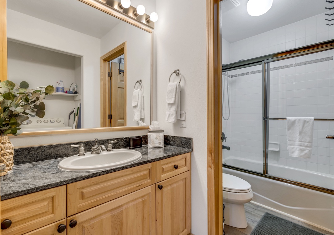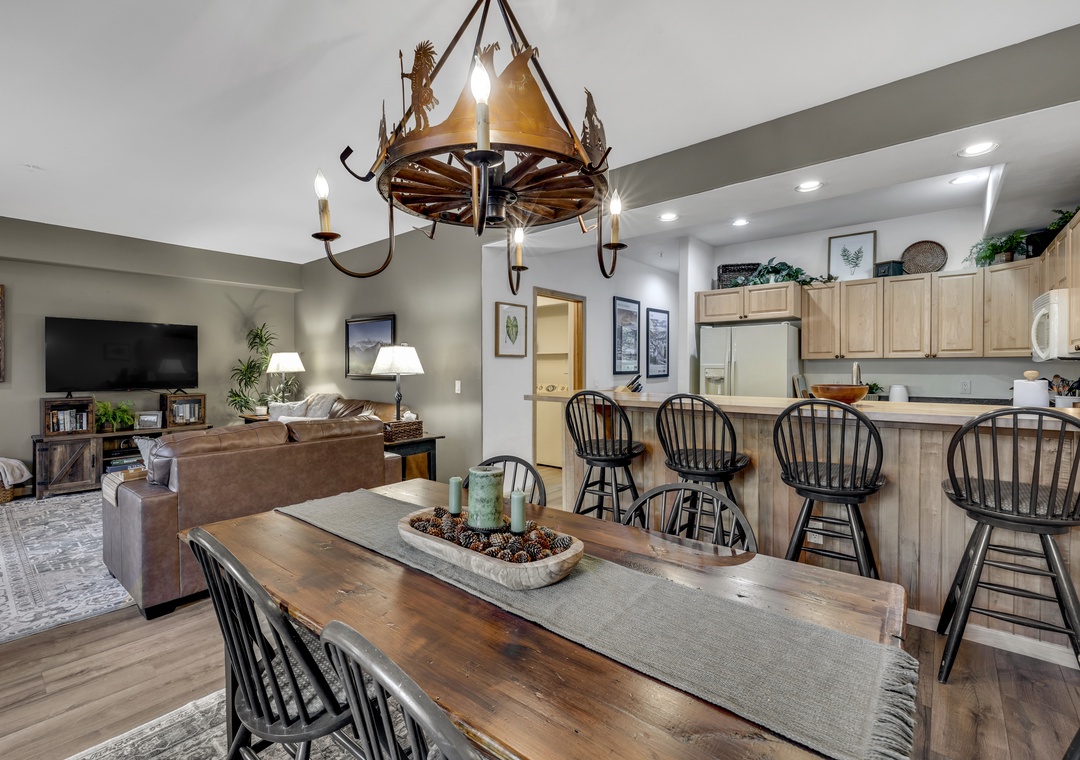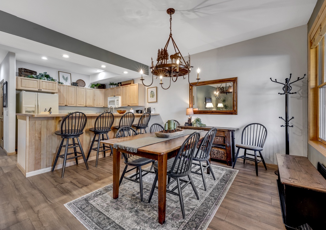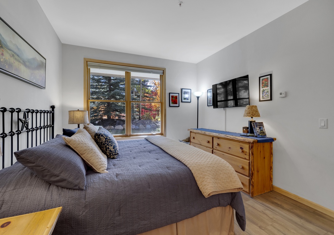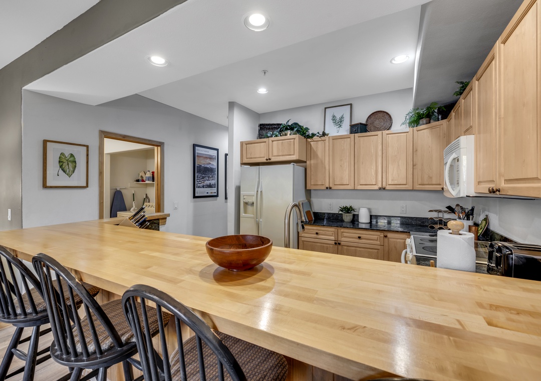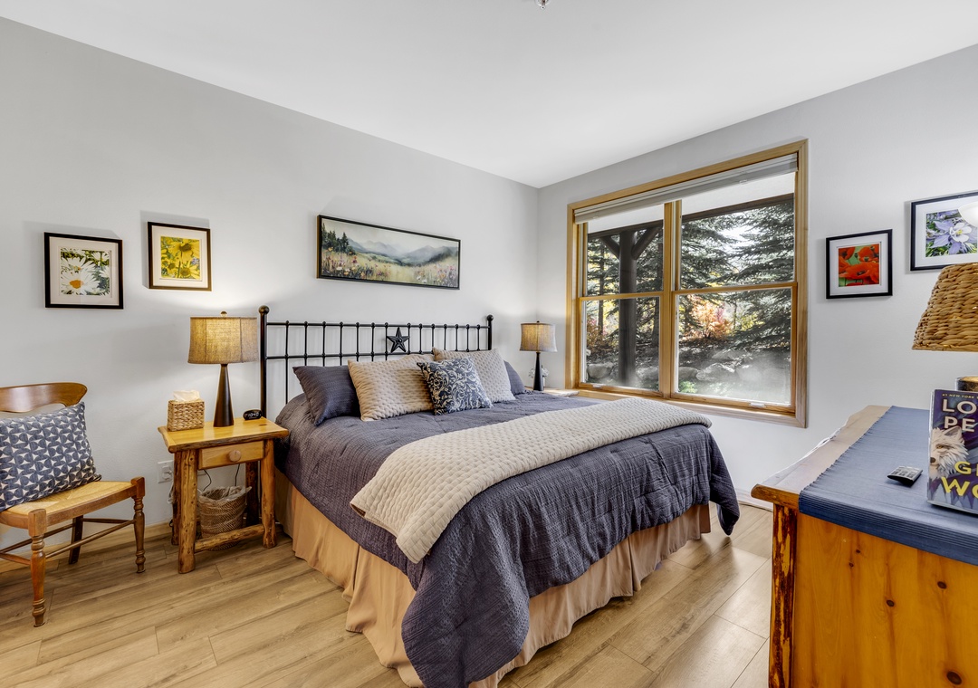 The unit features a thoughtfully designed interior with a spacious and open floor plan that ensures comfort and functionality. The living area is a warm and inviting space with plush seating centered around a gas fireplace, perfect for unwinding after a day of exploring the slopes or hiking trails. You’ll enjoy lots of windows with natural light and a patio that opens up right to the surrounding walkways.