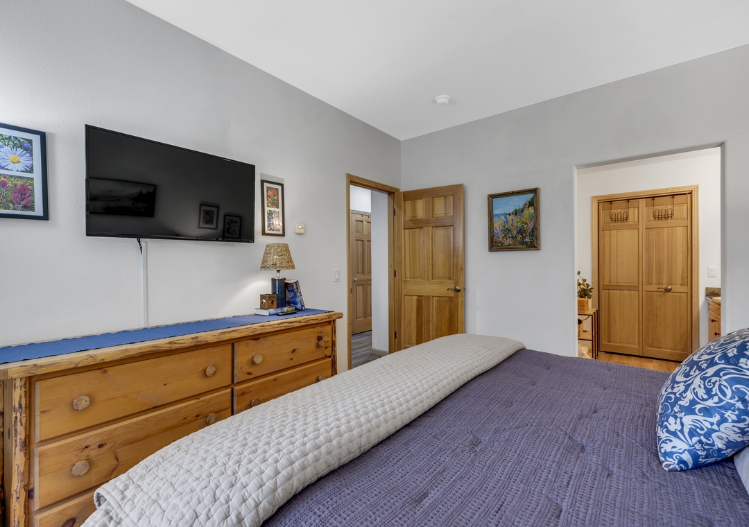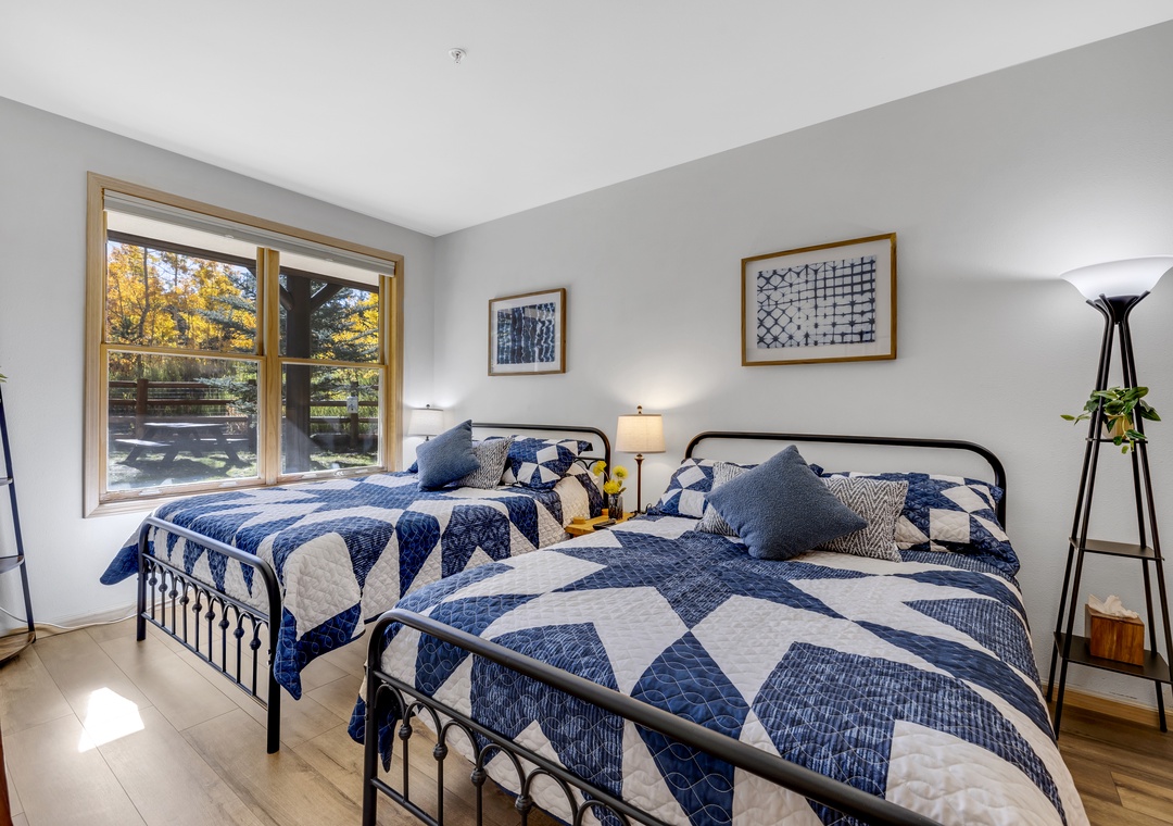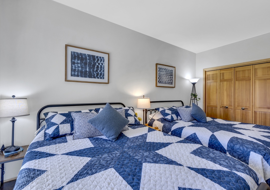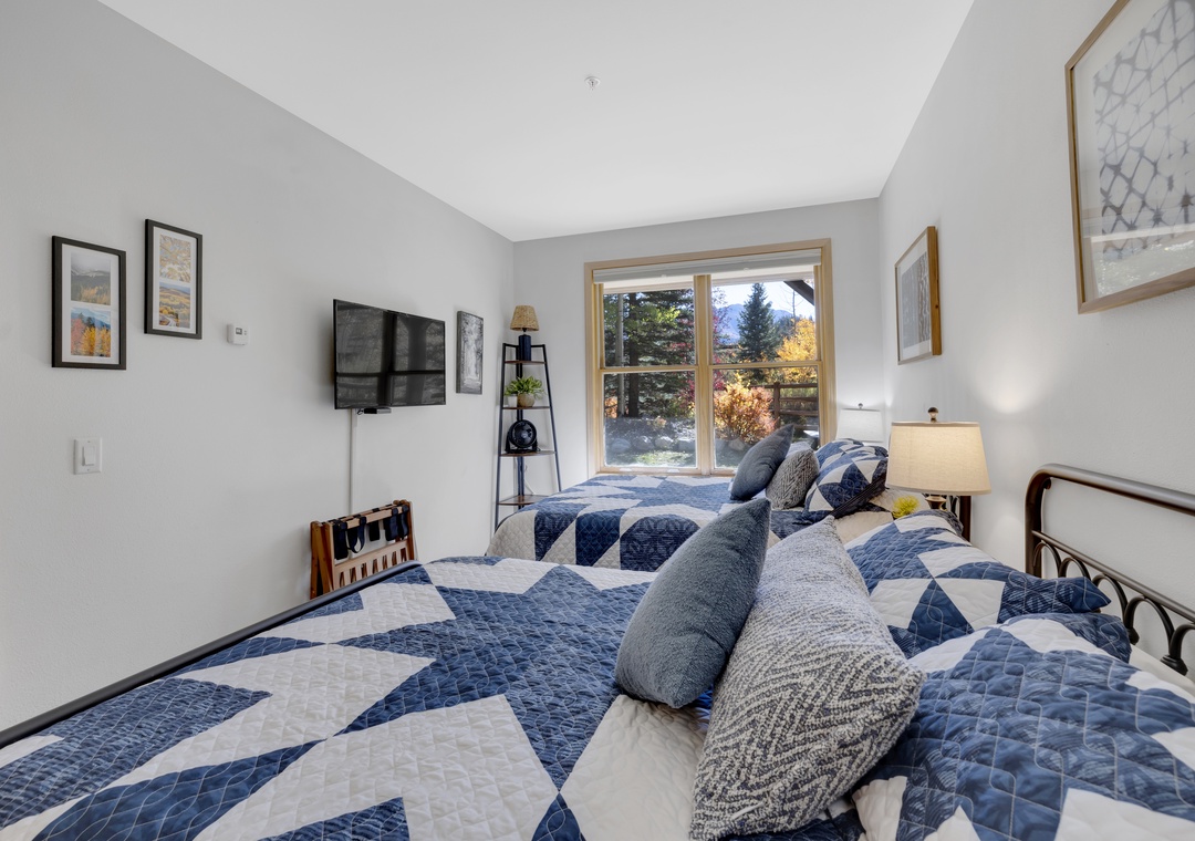 The primary bedroom is a tranquil retreat with a comfortable bed, soft linens, and plenty of storage to accommodate your belongings. The secondary bedroom is charming and cozy with great views of the snowy landscape. The modern bathrooms are outfitted with quality fixtures and provide a refreshing space to start or end your day. Additional conveniences include high-speed internet and cable TV, ensuring you stay connected and entertained throughout your stay.