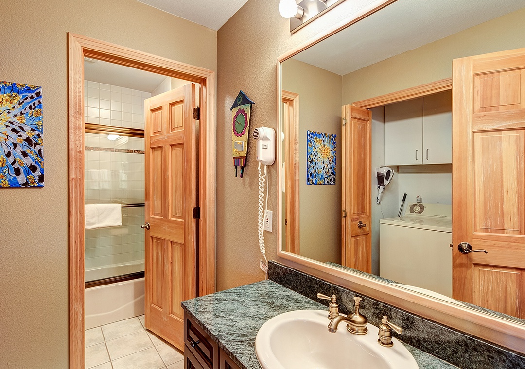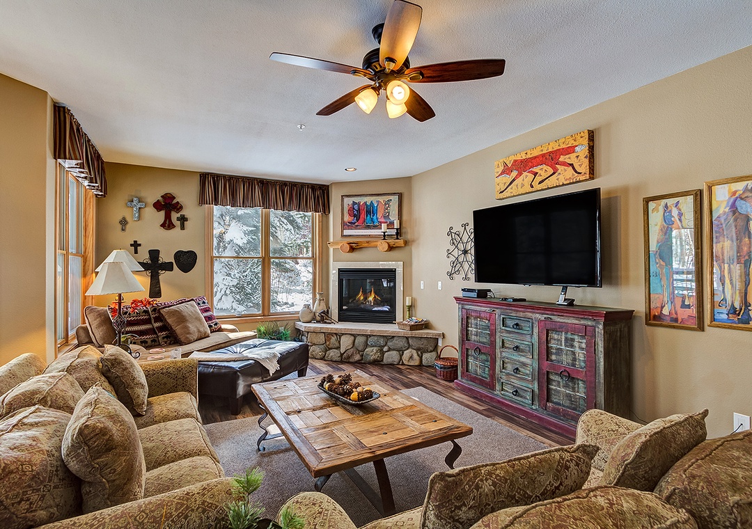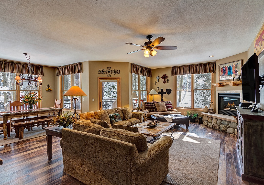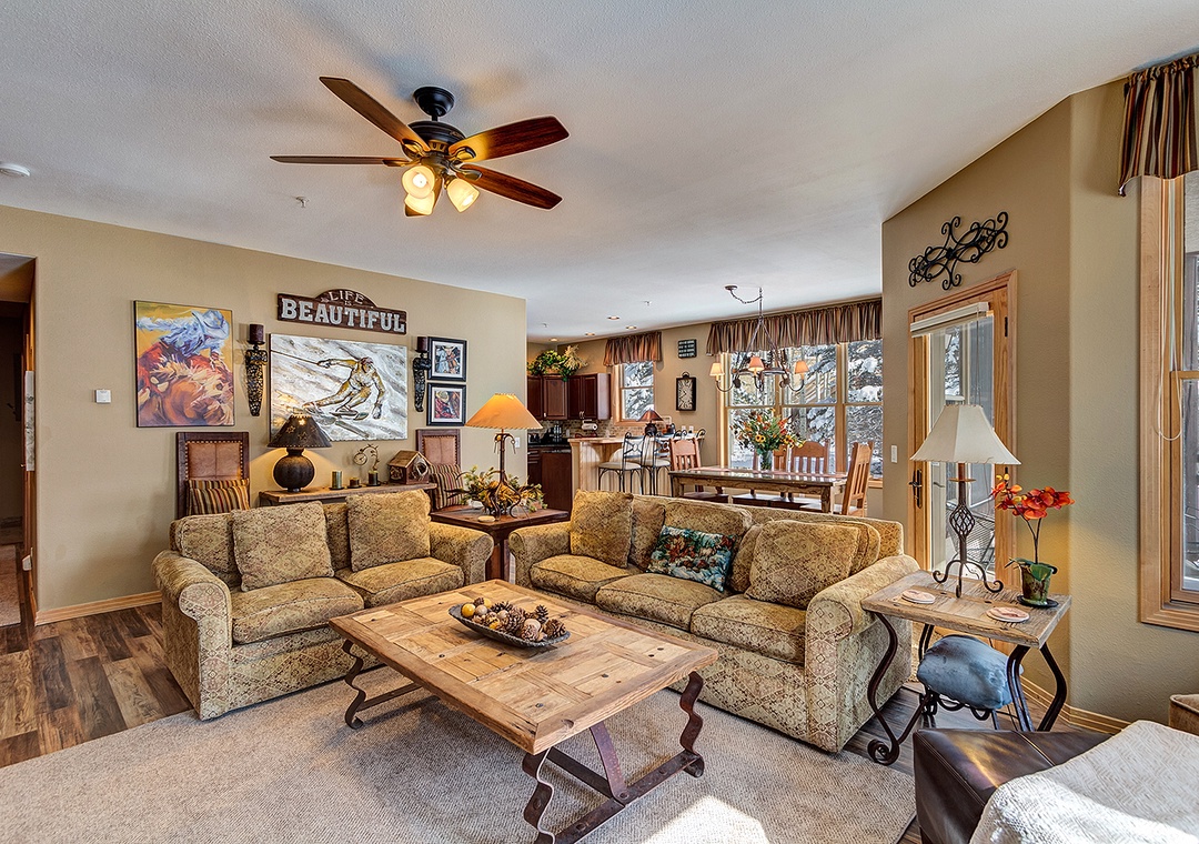 The heated drive leads you to the heated garage equipped with bike racks, sleds, ample gear hooks, and a boot & glove dryer to keep everything warm and ready for your next adventure. Feel free to spend all your energy on the trails, as covered walkways lead you from the garage to the front door in less than 10 steps. The gear-friendly entryway is thoughtfully designed with bins and plenty of hooks to keep all your gear organized. The full sized washer and dryer are available to keep your gear fresh and clean. The private hot tub is great for soaking those sore muscles, and the private corner patio is ideal for viewing Peak 10 and Mount Baldy while having your morning coffee, enjoying afternoon snacks, or warming up the grill. The comfy sofas and gas fireplace are perfect for cozying up with a good book or watching a movie.