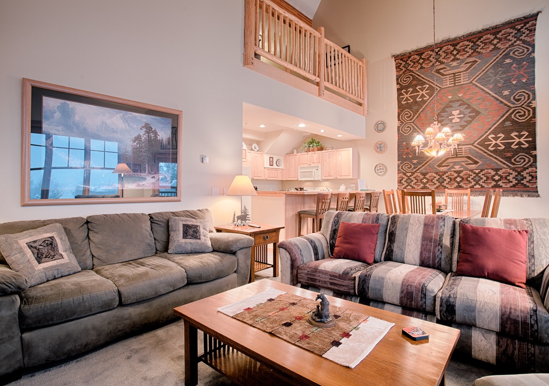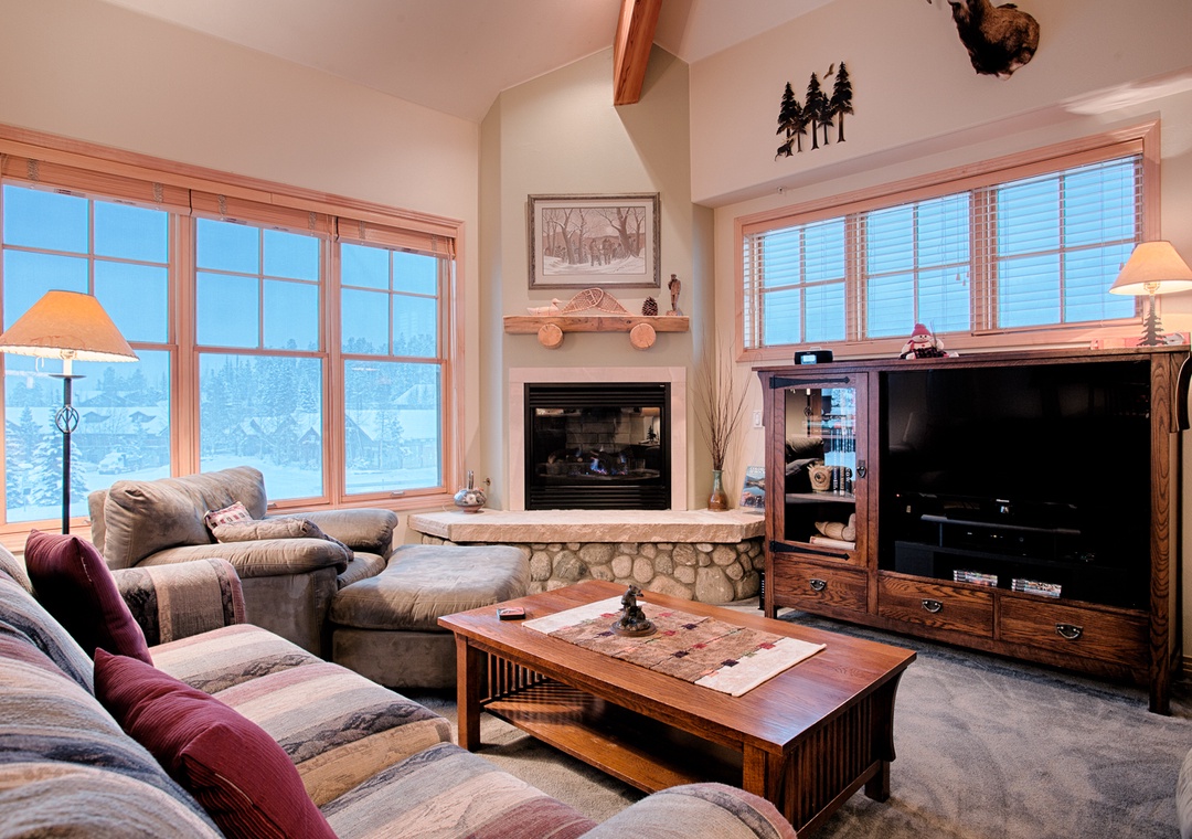 Located at the south end of Main Street within walking distance of the base of Peak 9, this Breckenridge condo is located on the free shuttle route, it is also just a 12 minute walk to the Quicksilver chairlift. This beautiful three bedroom + loft condo at the Corral features many fine amenities such as a gas river rock fireplace, a large flatscreen tv, tiled entry, vaulted ceilings, full washer/dryer, granite countertops, jetted bathtub and free wireless internet service. The north-facing living area and private deck offer nice views of Main Street, plus some of the Breckenridge Ski Area.