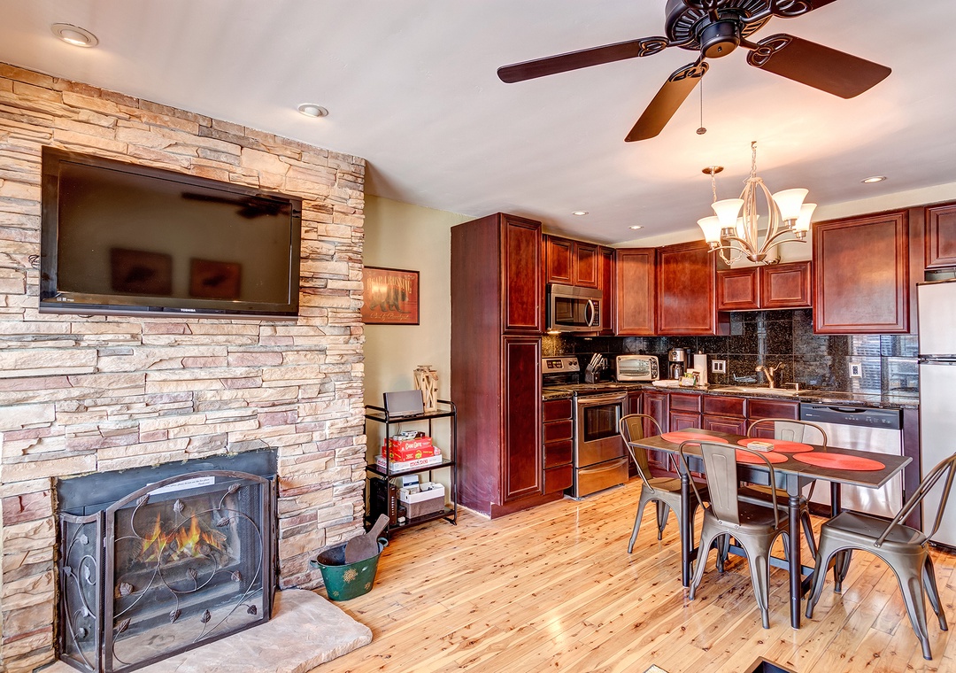 Step inside and be greeted by a cozy living area, complete with remodeled mountain decor and a flat-screen TV, perfect for unwinding after a long day of exploring the surrounding mountains. The modern kitchen boasts stainless steel appliances and ample counter space, making meal preparation a breeze.