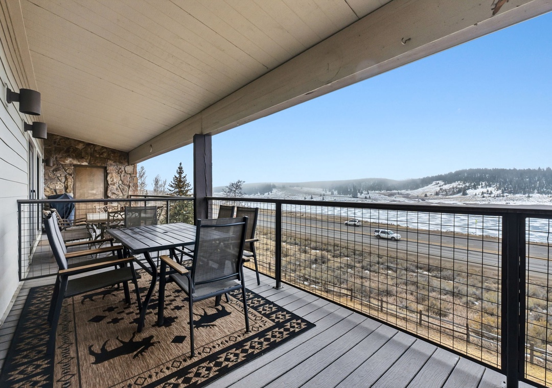 Step outside onto the oversized private deck—arguably home to the best view in Summit County. Guests look directly out to Buffalo Mountain and its surrounding peaks, and the scenery is nothing short of breathtaking. When the weather is nice, enjoy your meals outdoors, sip your morning coffee with fresh alpine air, or simply relax and take in the panoramic views—they’re truly that good.