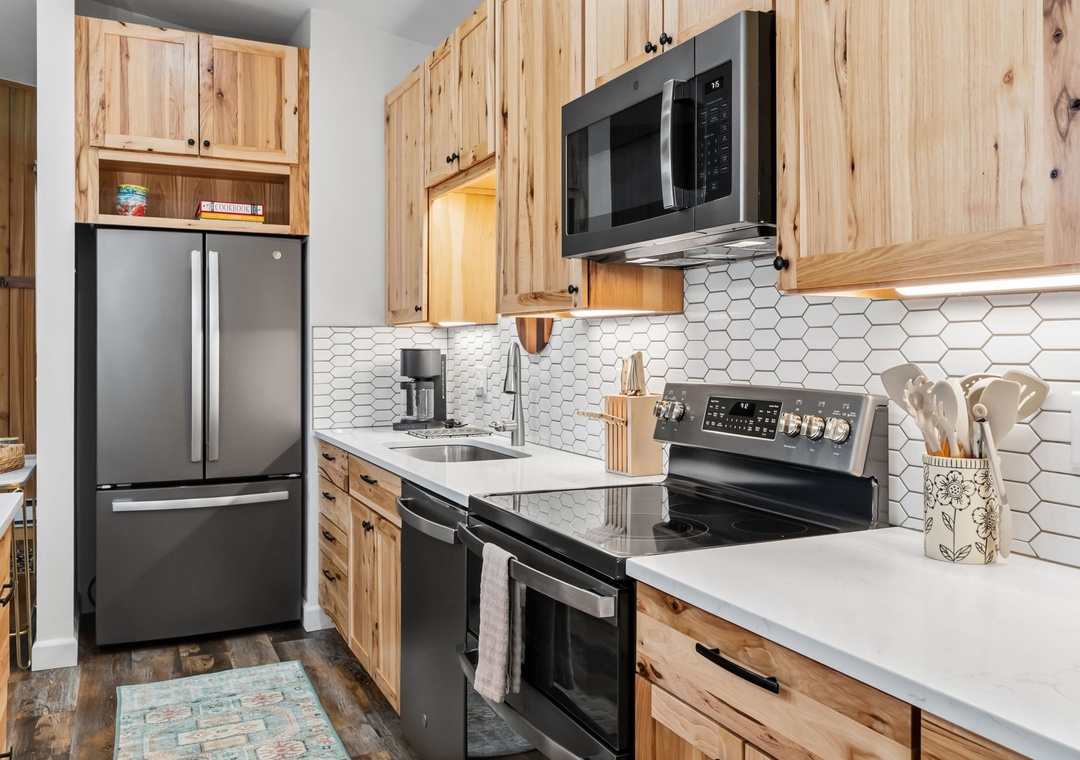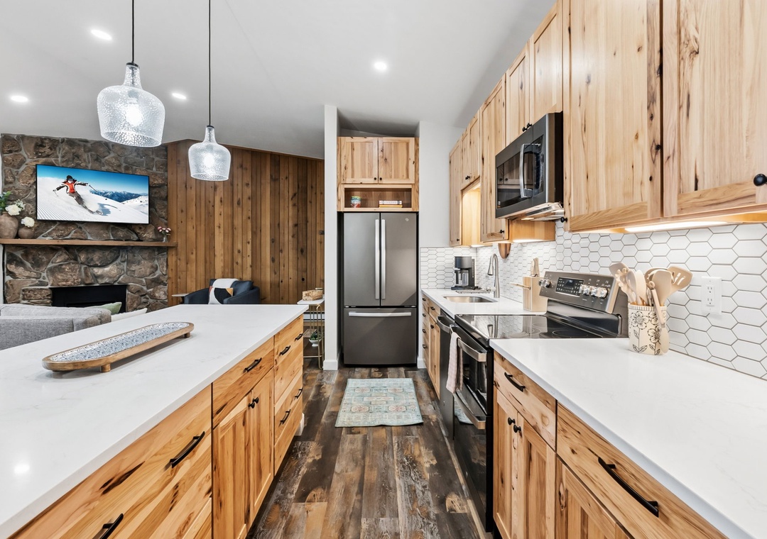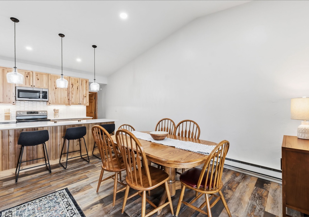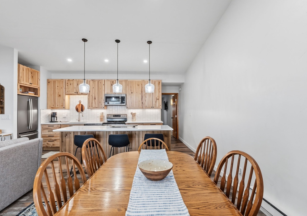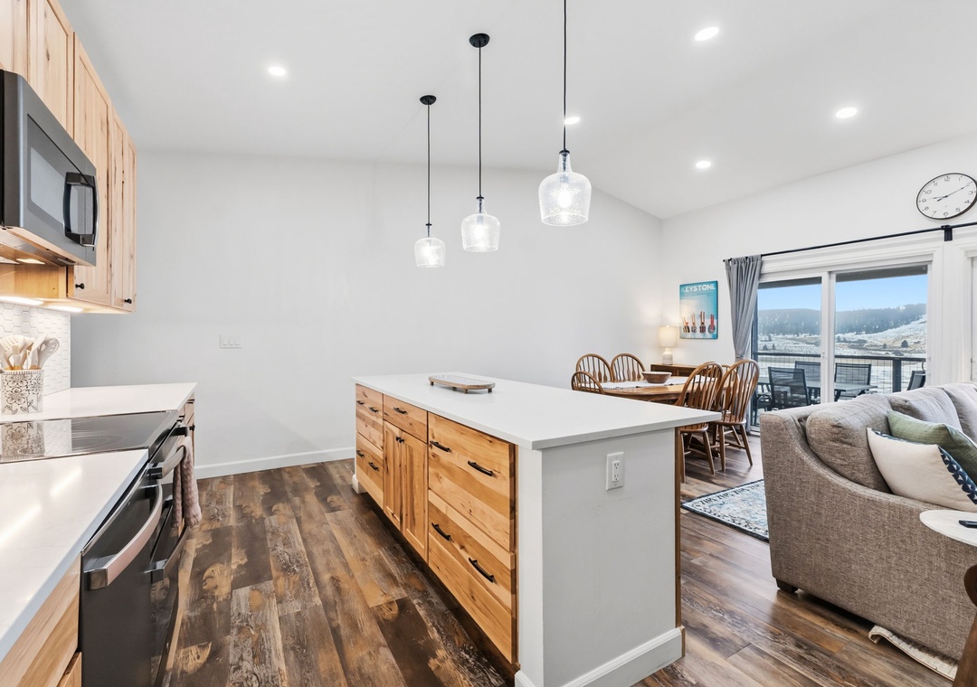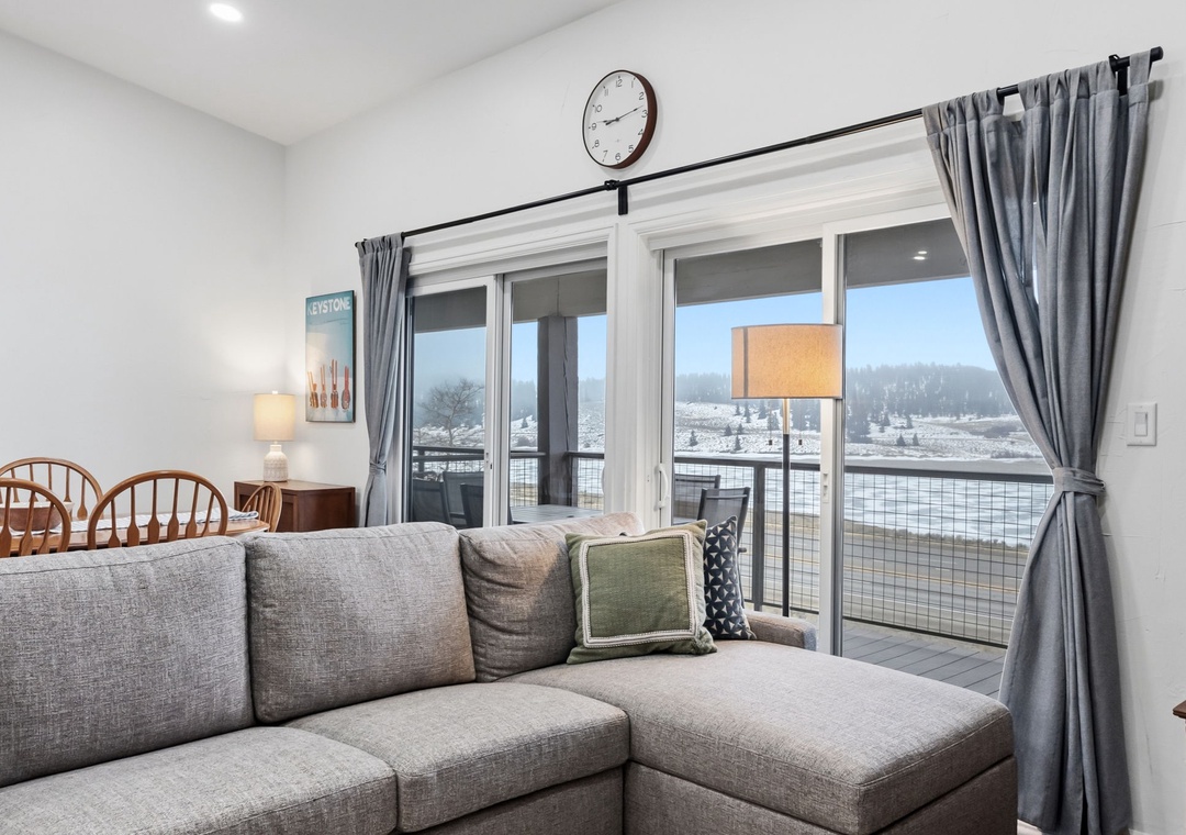Welcome to your mountain escape in Dillon, Colorado! This newly furnished and beautifully updated condo features a very open main living area with plenty of space to lounge, relax, and enjoy meals together. The large, fully stocked kitchen makes it easy to prepare anything from a quick breakfast before hitting the slopes to a family-style dinner after a full day of adventure. Floor-to-ceiling deck doors span the length of the main living space, allowing an incredible amount of natural light to pour in while showcasing sweeping mountain views from nearly every angle. The thoughtful layout comfortably accommodates multiple groups, offering room to gather while still giving everyone their own space to unwind. Cozy up by the gas fireplace on chilly mornings or after a day outdoors and settle into true mountain comfort.