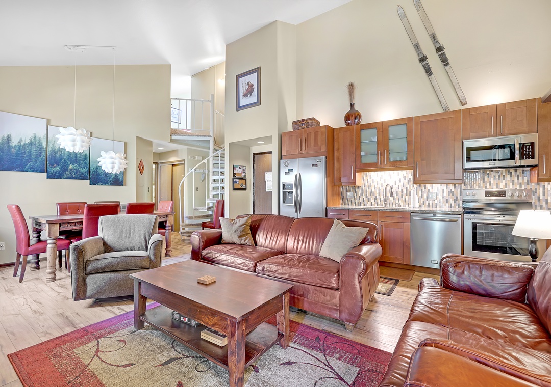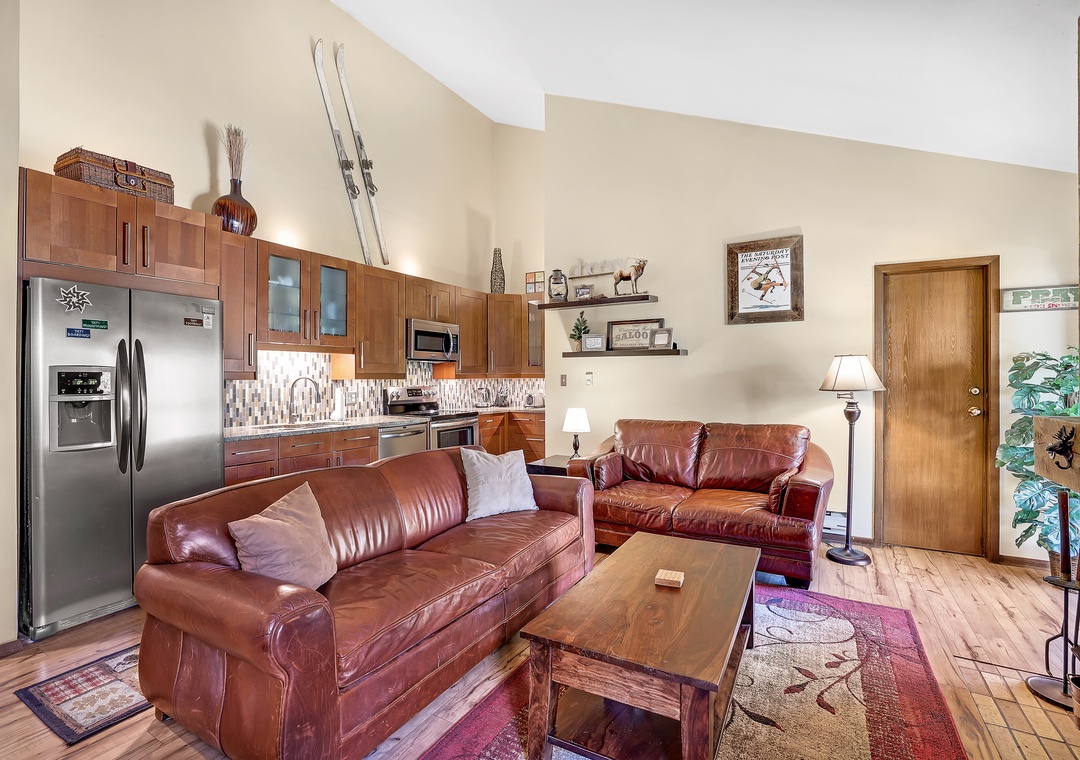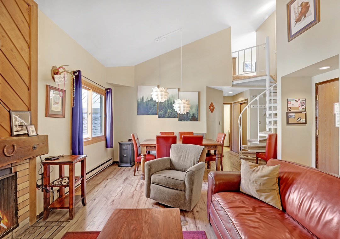 The living room boasts a wood-burning fireplace, plush seating, and high ceilings that allow natural light and a balcony perfect for your morning coffee.