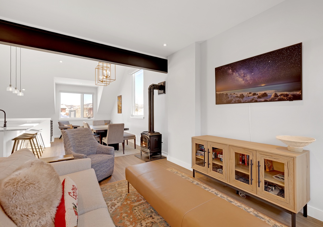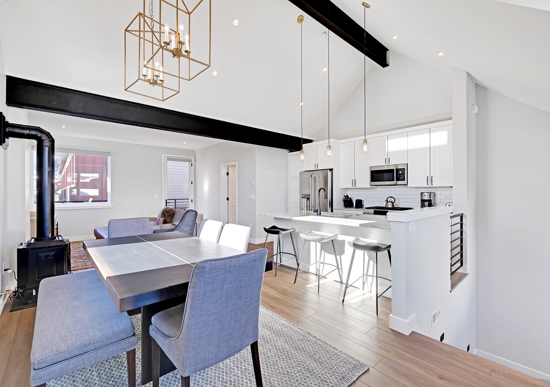 This charming townhouse features two bedrooms and three bathrooms, offering ample space for up to six guests. The 1,500 sq ft property includes a spacious living area with a cozy fireplace, a fully equipped kitchen perfect for preparing meals after a day of adventure, and a private outdoor patio with stunning mountain views. The master bedroom has a king-sized bed and an en-suite bathroom, while the additional bedroom includes a queen-sized bed. The living room also has a comfortable pull-out sofa.