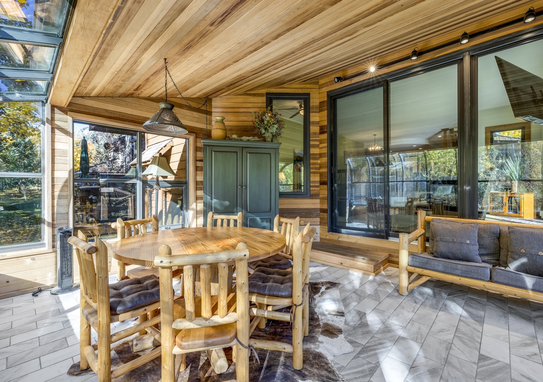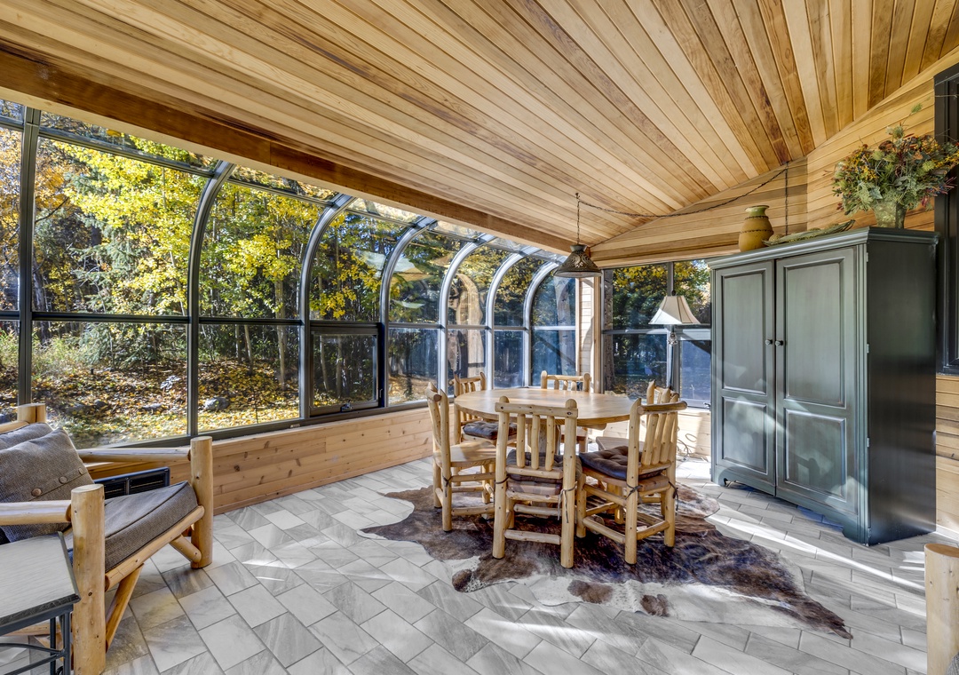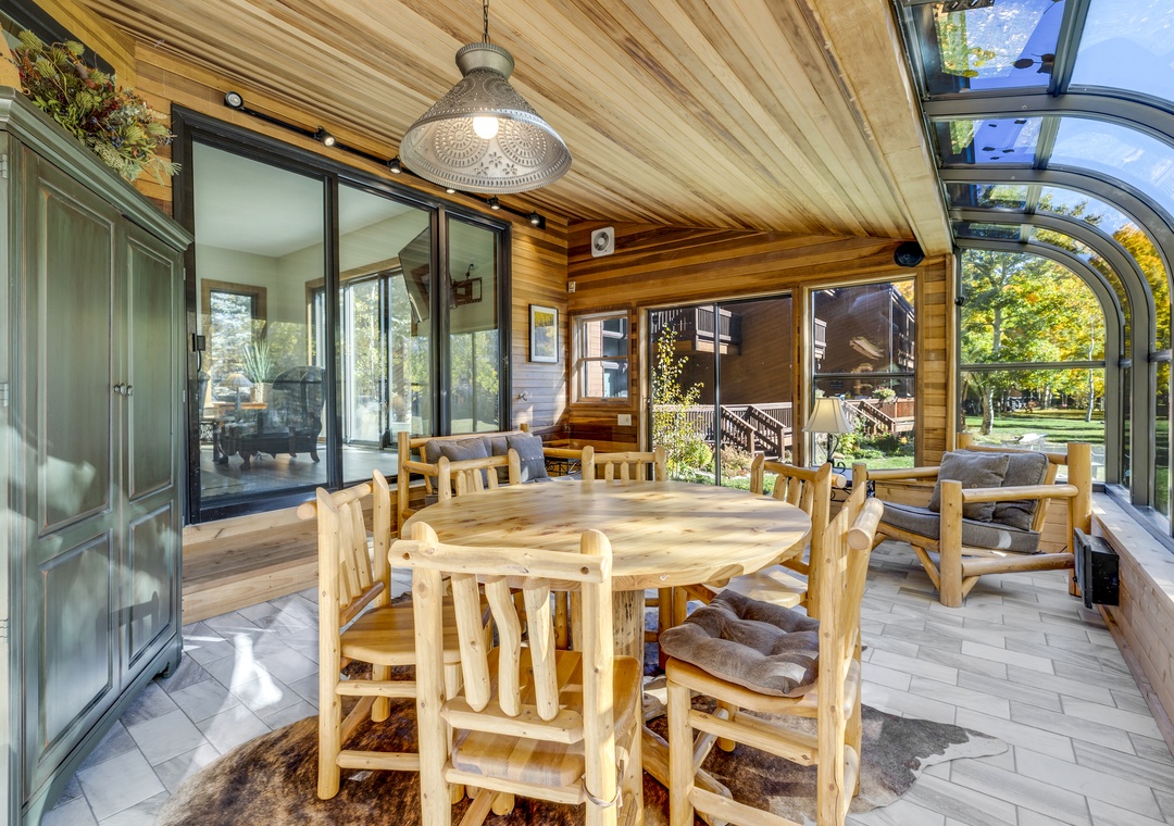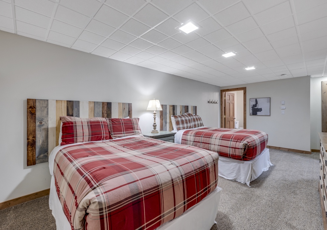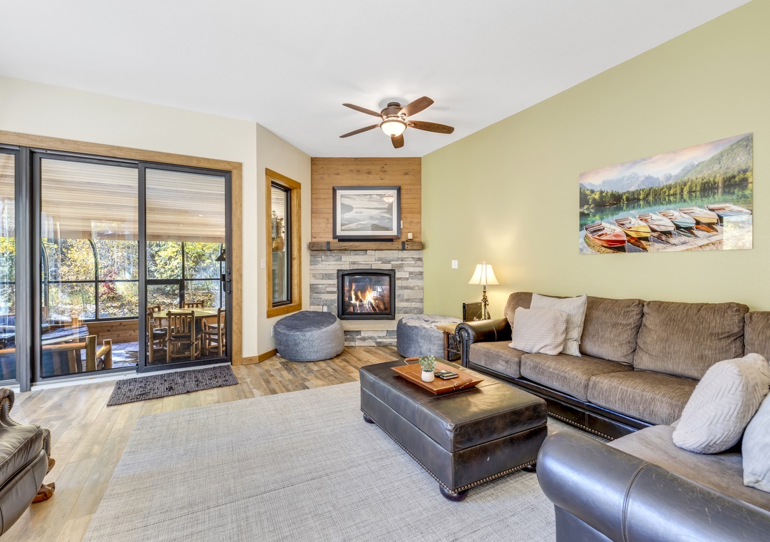 Step inside to discover a spacious, open concept living area with a fully equipped kitchen, perfect for preparing delicious meals. The living room features a cozy fireplace, ideal for chilly evenings plus a large light-filled sunroom that creates a beautiful bonus area for you and your group to enjoy. The chalet boasts four beautifully appointed bedrooms, each with its own unique charm. The primary bedroom includes a king bed plus a queen-sized sleeper sofa and an en suite bathroom, while the second bedroom offers a queen and is right next door to the second bathroom off the hallway. The third bedroom features a captain's bunk bed and two twin beds with another en suite bathroom, and the fourth bedroom has two double beds near the fourth bathroom in the home. All four bathrooms are full bathrooms, ensuring convenience and privacy.