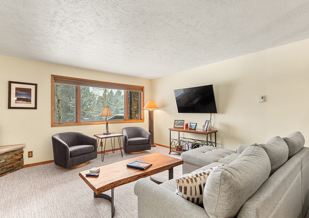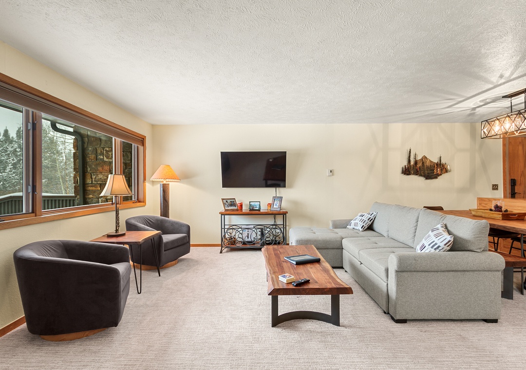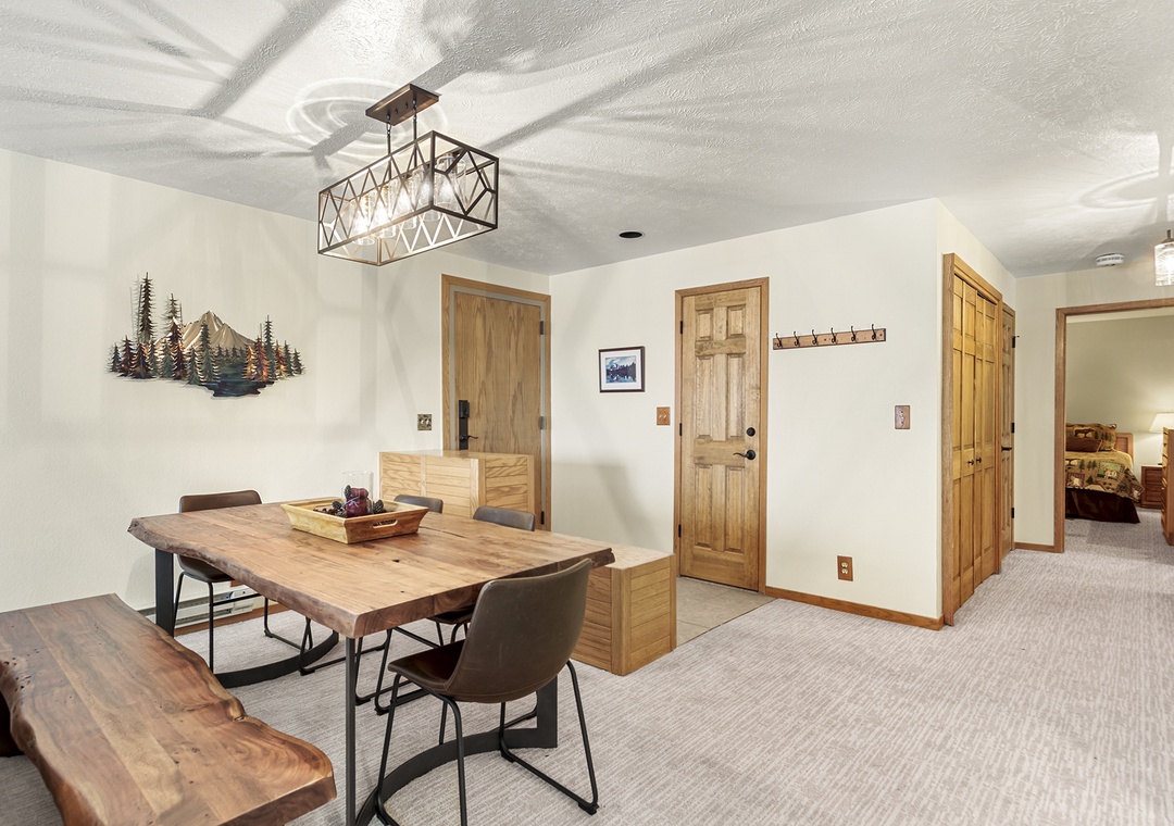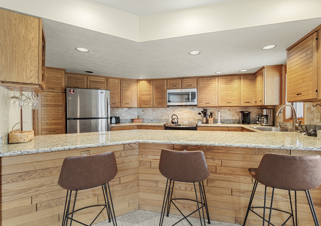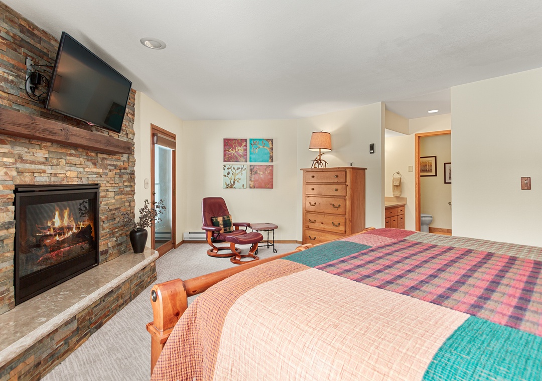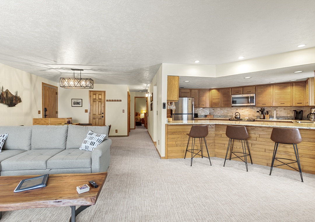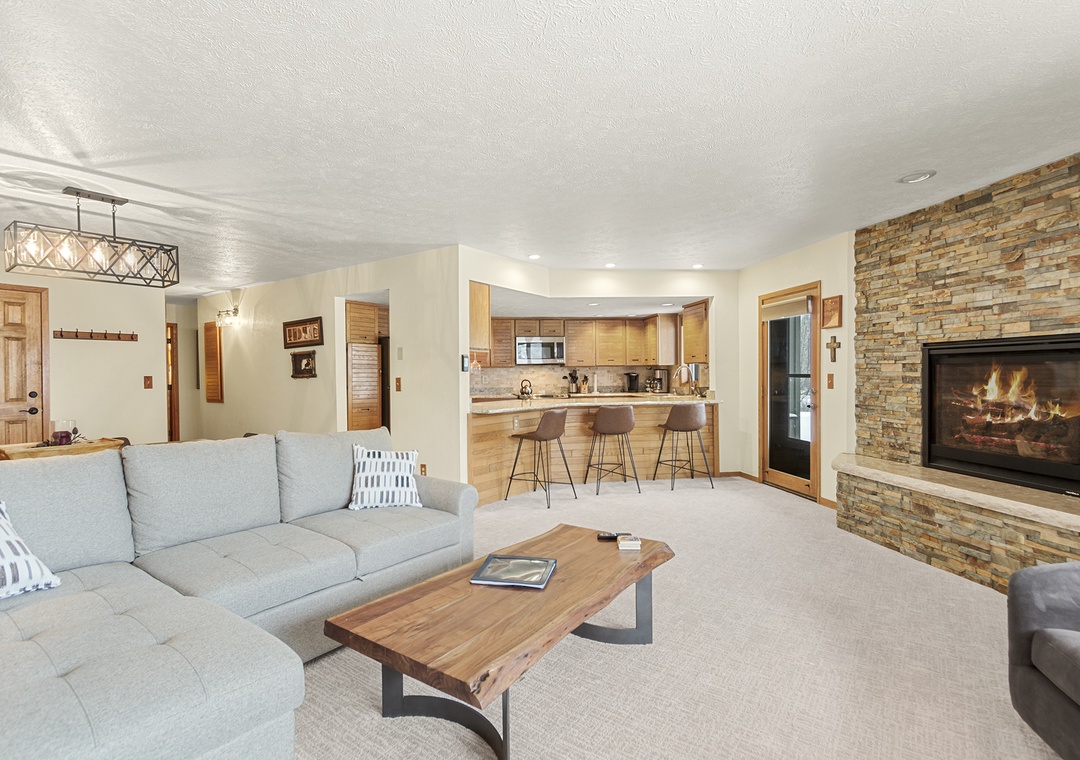 Upon entering the condo, you'll be greeted by a spacious living room with comfortable seating, a gas fireplace, and a flat-screen TV for your entertainment. The living room flows seamlessly into the fully-equipped kitchen, complete with stainless steel appliances, granite countertops, and a dining area that seats six.