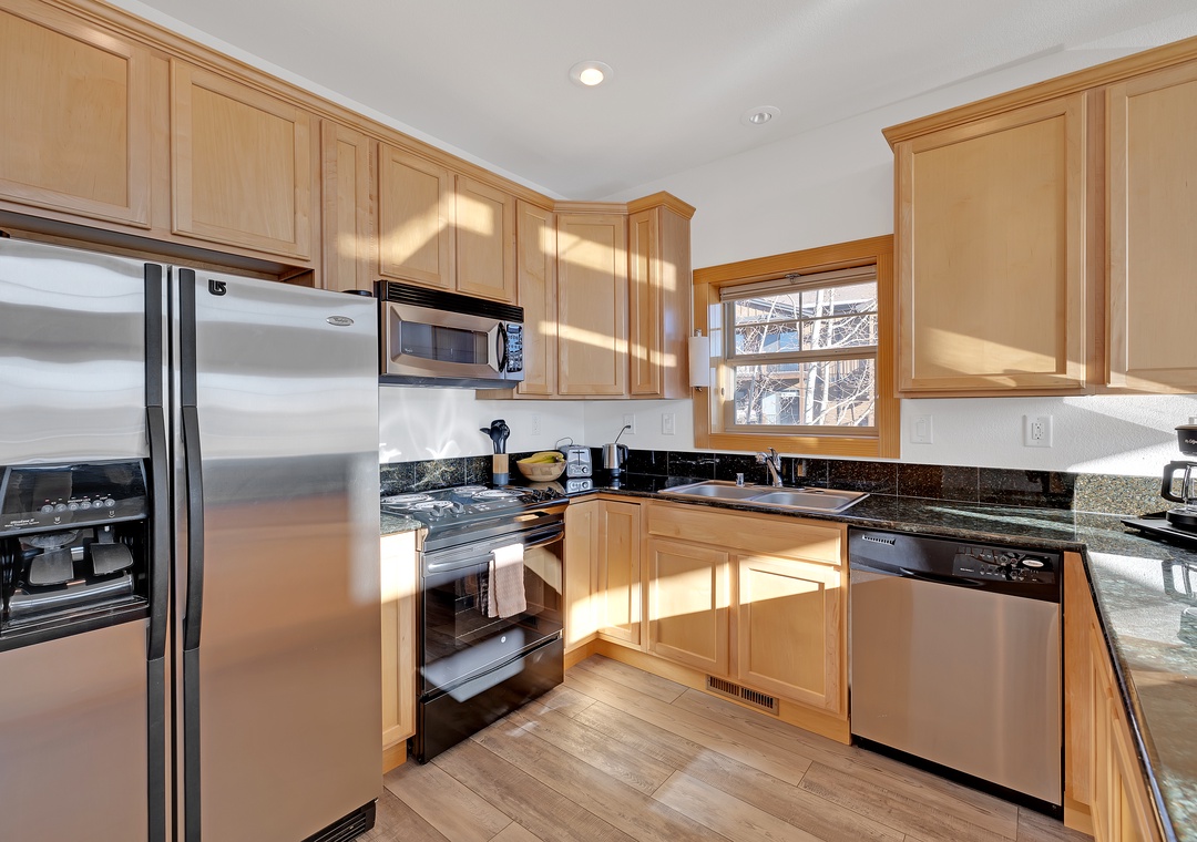 In the bright and inviting living room, with stunning mountain views, relax and unwind on the comfortable sofa, watch your favorite shows on the flat-screen TV, or cozy up by the fireplace during chilly mountain evenings. Large windows flood the space with natural light, highlighting stunning mountain views. The fully equipped kitchen, complete with stainless steel appliances and granite countertops, has everything you need to prepare meals, from casual breakfasts to gourmet dinners.