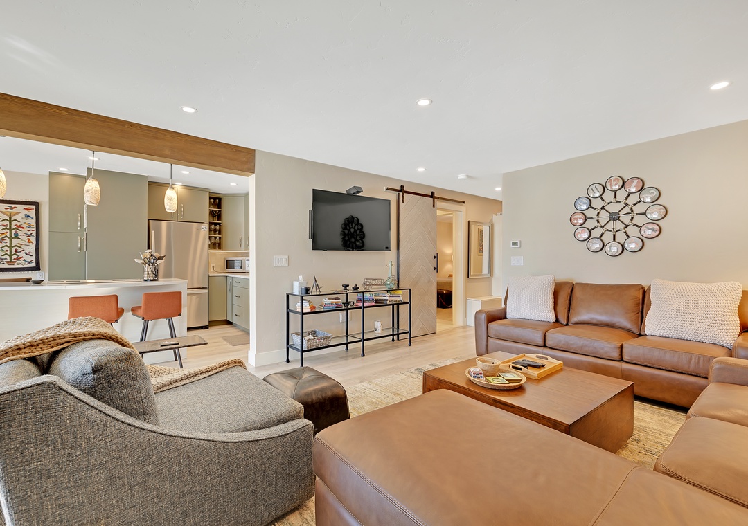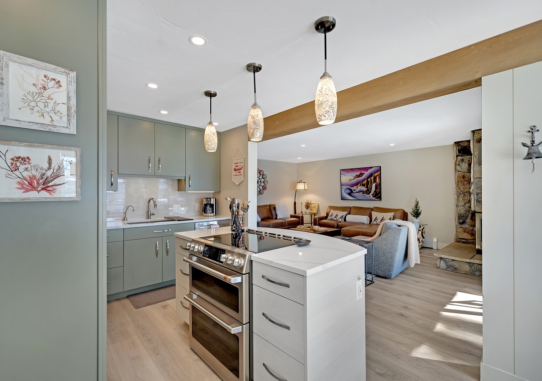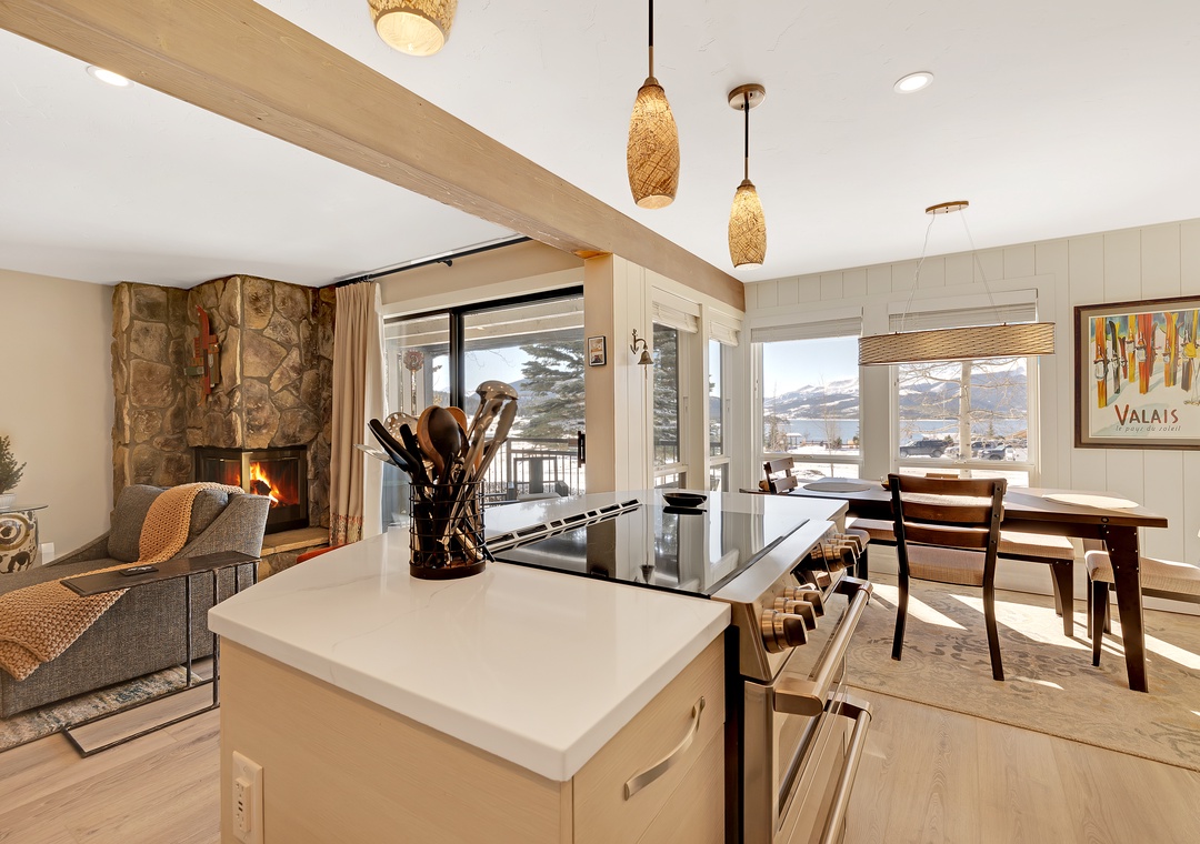 Step inside to discover a fresh, updated space with high-end finishes, contemporary décor, and an open-concept design that makes the most of the stunning views. The living area is bright and inviting, featuring a cozy fireplace, a large flat-screen TV, and comfortable seating, perfect for unwinding after a day on the slopes or trails. Large windows offer picturesque views of Lake Dillon and the surrounding mountains, bringing the outdoors in.