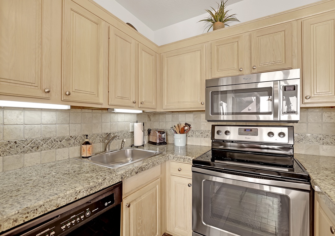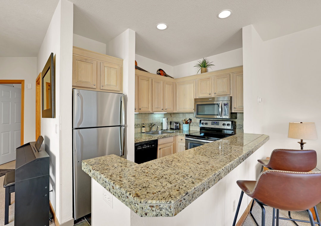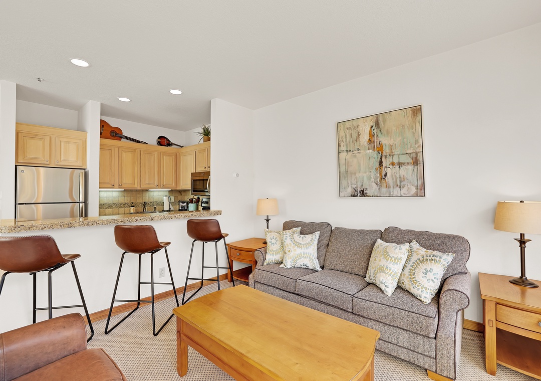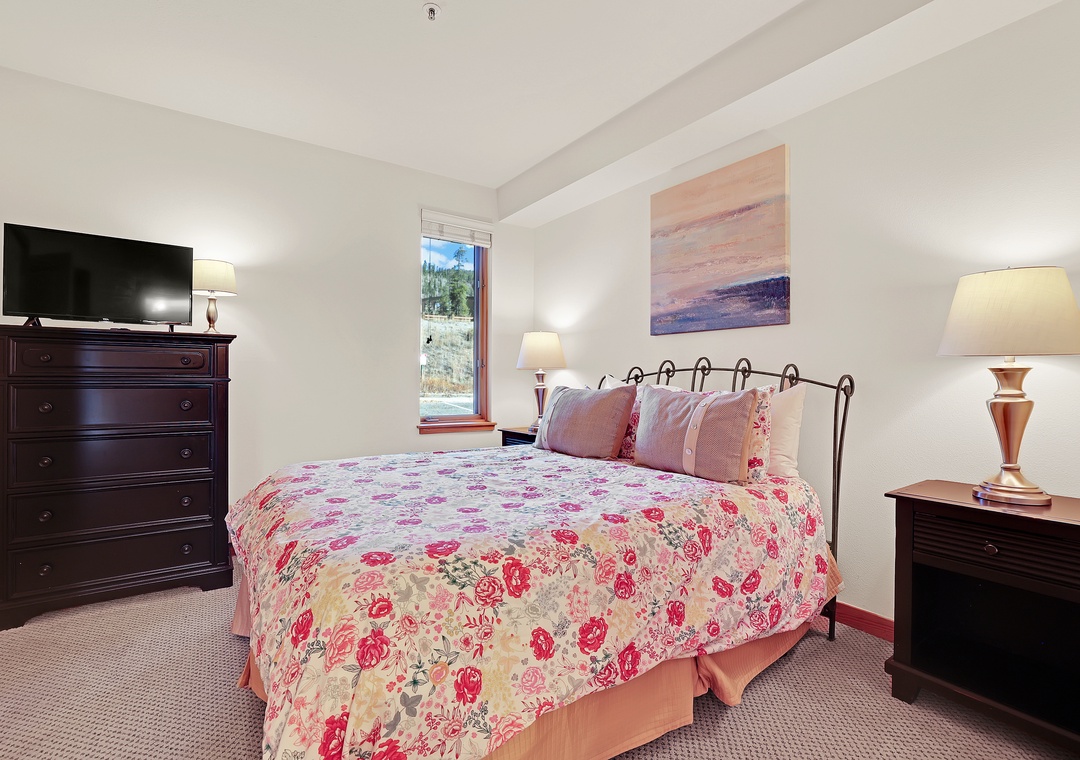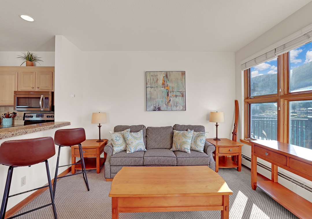 Unwind after a day of adventure in the open living space featuring a gas fireplace, comfortable seating, and a flat-screen TV. If you don’t feel like taking advantage of the amazing dining options in Keystone, the kitchen has the essentials to enjoy every meal in the comfort of your own space. Sip your morning coffee or enjoy the fresh mountain air from your own private balcony with stunning views of the surrounding peaks and lake. Comfortably sleeps 4 with a queen-size bed in the bedroom and a sleeper sofa in the living room.