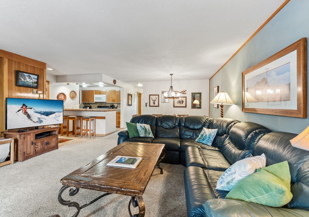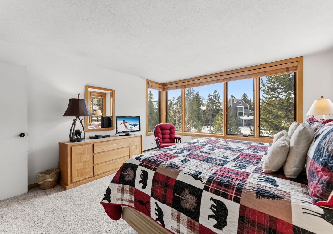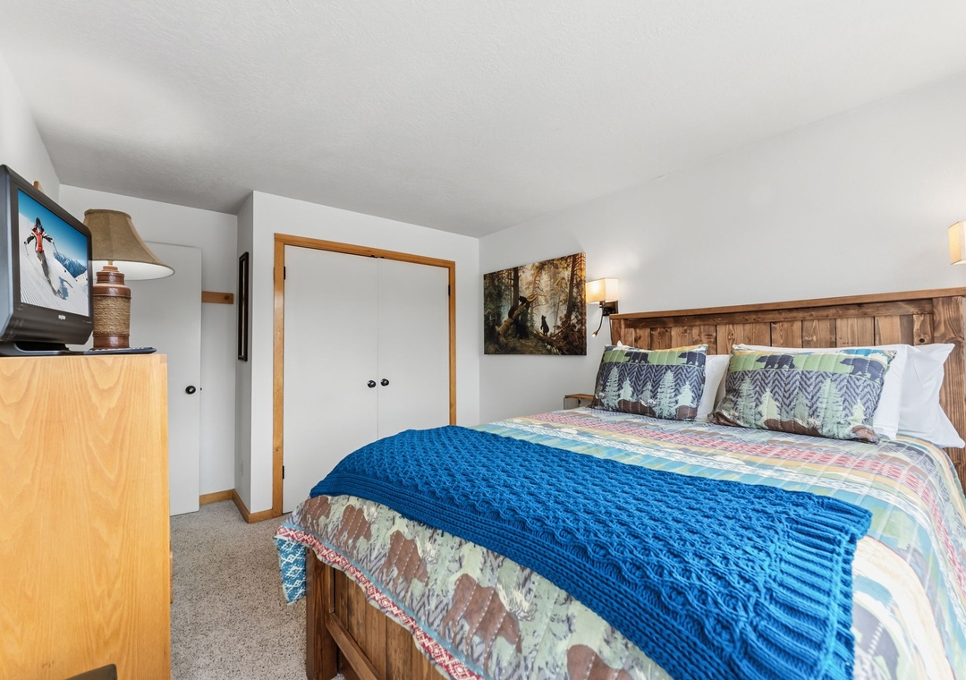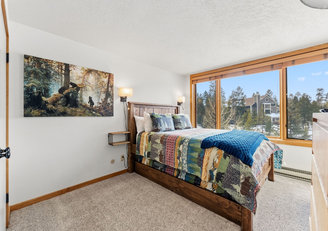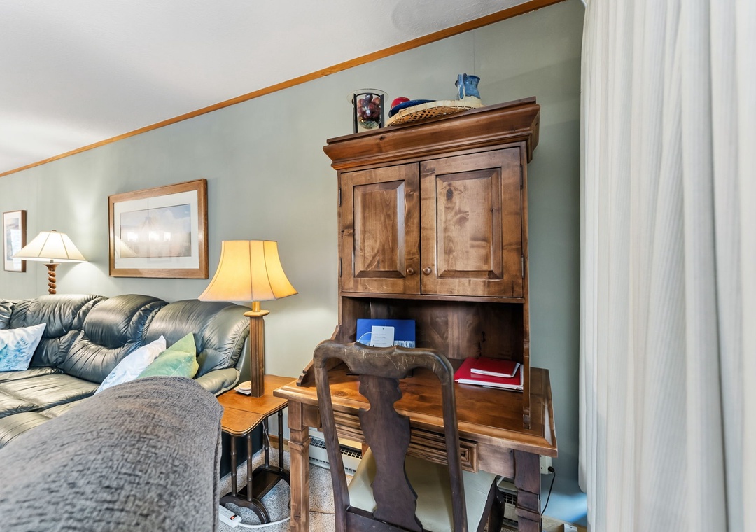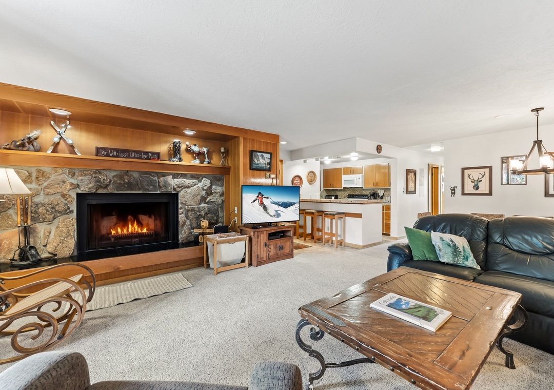 This inviting second-floor walk-up condo offers the perfect mountain retreat after a day of adventure. The living area features a flat-screen TV, a cozy wood-burning fireplace, and a queen sleeper sofa, along with extra sheets and blankets conveniently stored in the closet. A dedicated office space with a desk and chair makes it easy to work remotely while enjoying the mountains. Step out onto the spacious private balcony from the living room to take in peaceful treed and mountain views—ideal for morning coffee or evening relaxation.