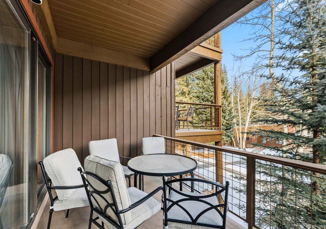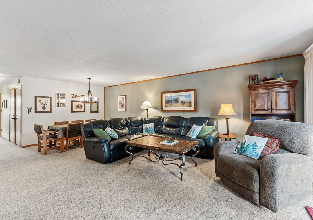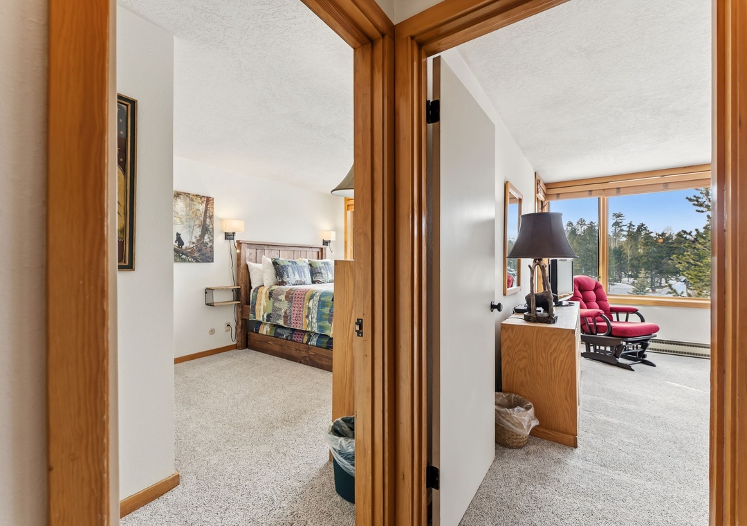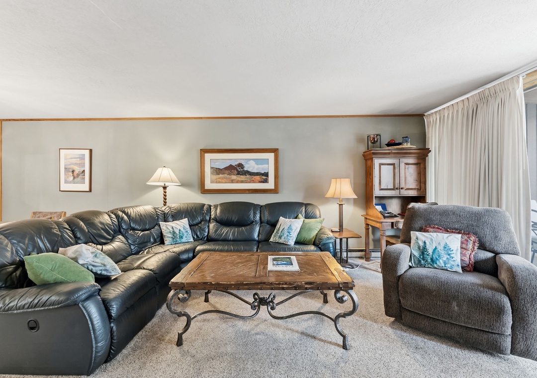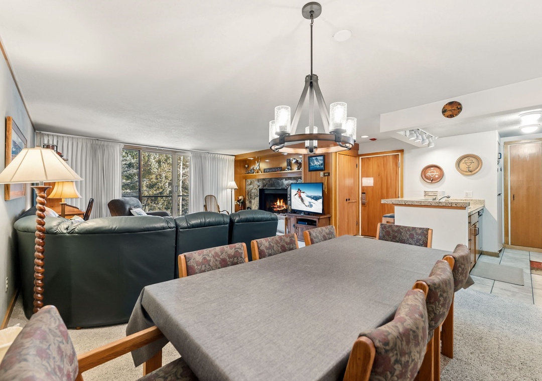 This inviting second-floor walk-up condo offers the perfect mountain retreat after a day of adventure. The living area features a flat-screen TV, a cozy wood-burning fireplace, and a queen sleeper sofa, along with extra sheets and blankets conveniently stored in the closet. A dedicated office space with a desk and chair makes it easy to work remotely while enjoying the mountains. Step out onto the spacious private balcony from the living room to take in peaceful treed and mountain views—ideal for morning coffee or evening relaxation.