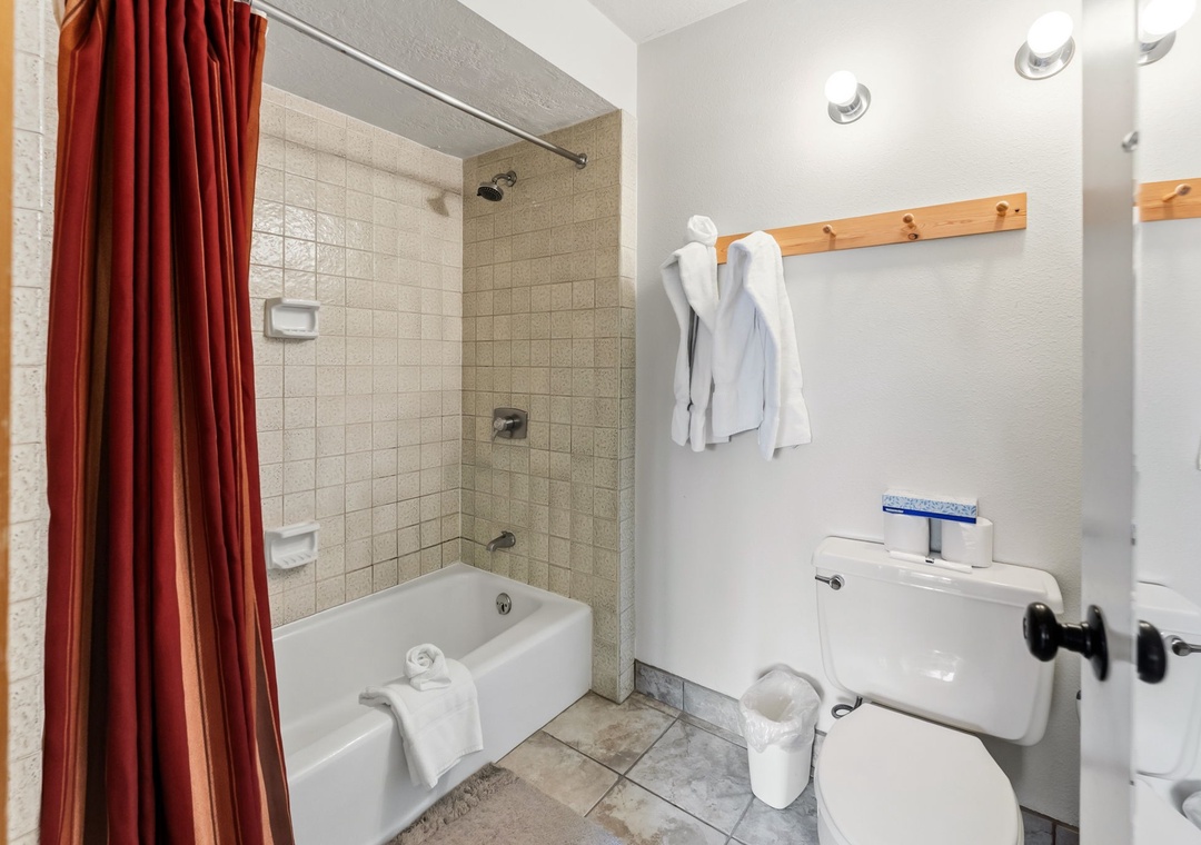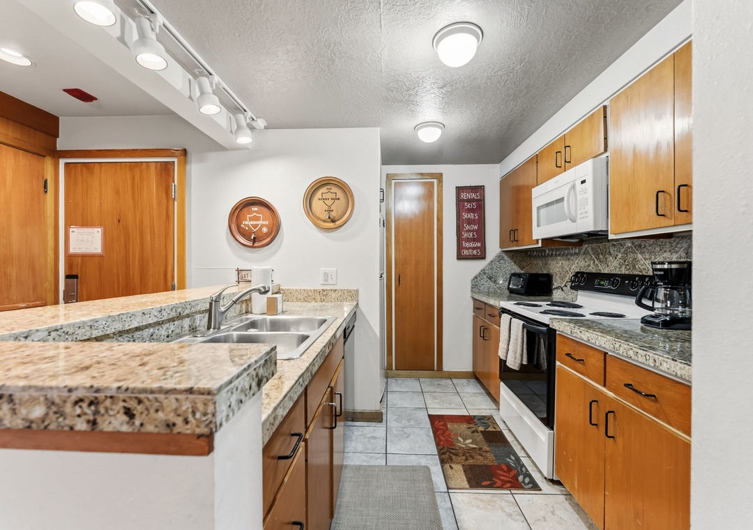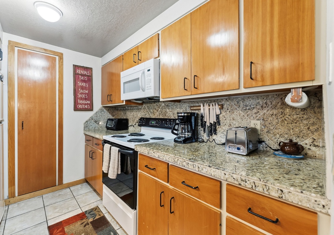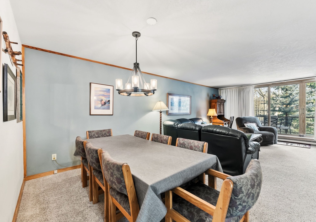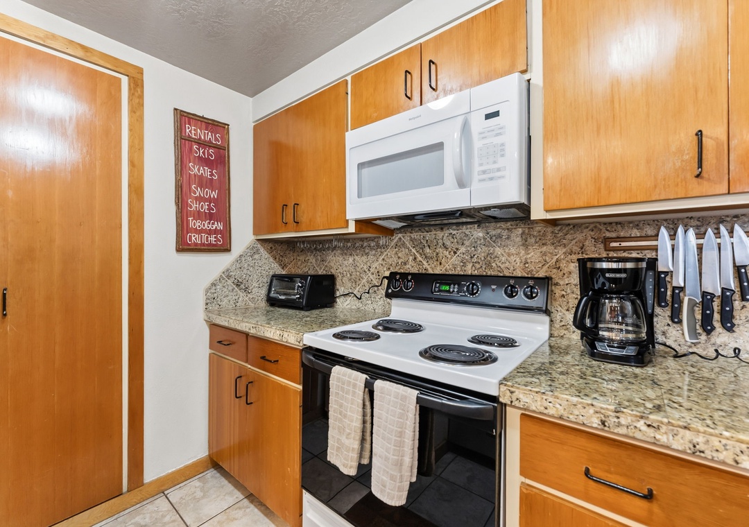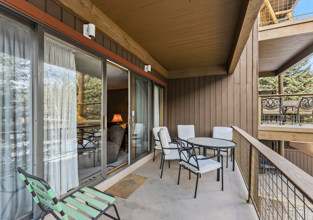 This inviting second-floor walk-up condo offers the perfect mountain retreat after a day of adventure. The living area features a flat-screen TV, a cozy wood-burning fireplace, and a queen sleeper sofa, along with extra sheets and blankets conveniently stored in the closet. A dedicated office space with a desk and chair makes it easy to work remotely while enjoying the mountains. Step out onto the spacious private balcony from the living room to take in peaceful treed and mountain views—ideal for morning coffee or evening relaxation.