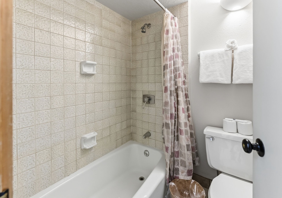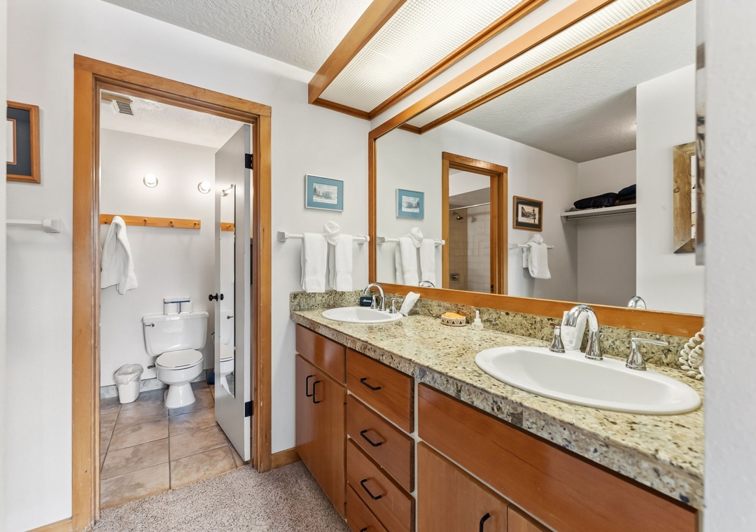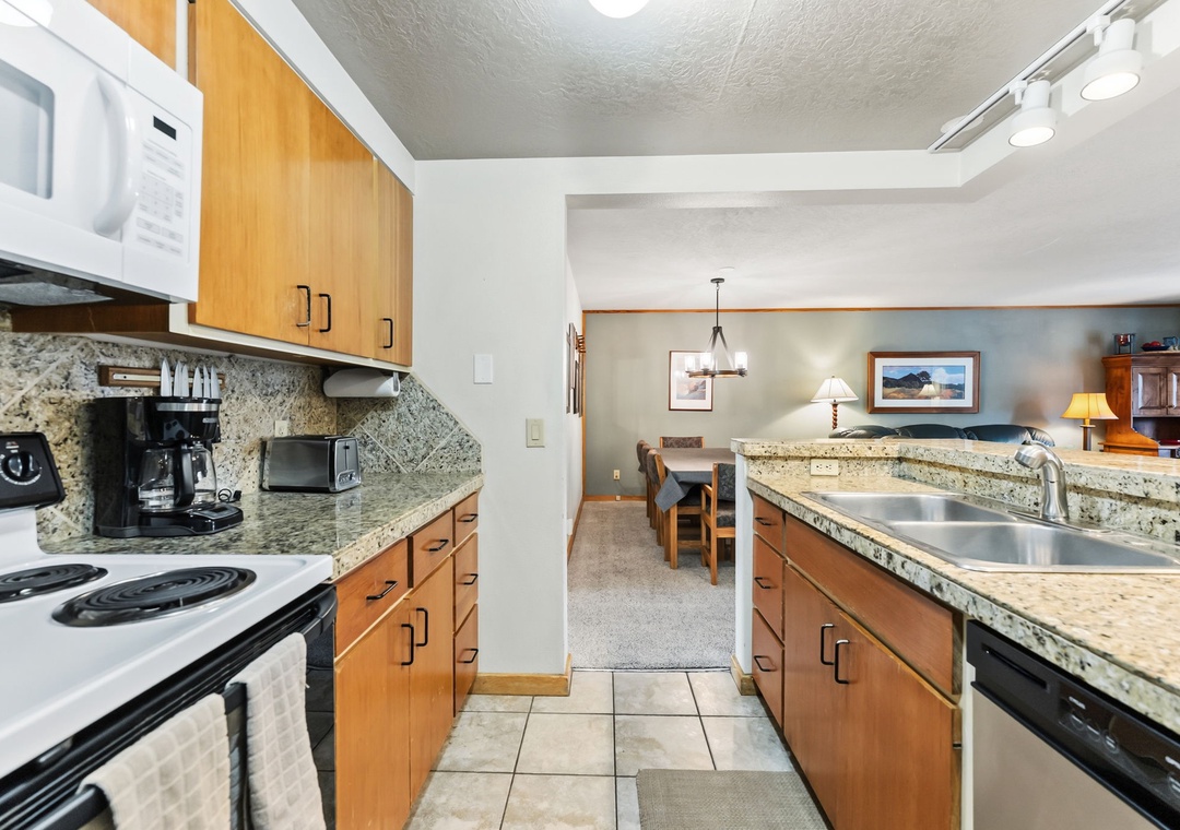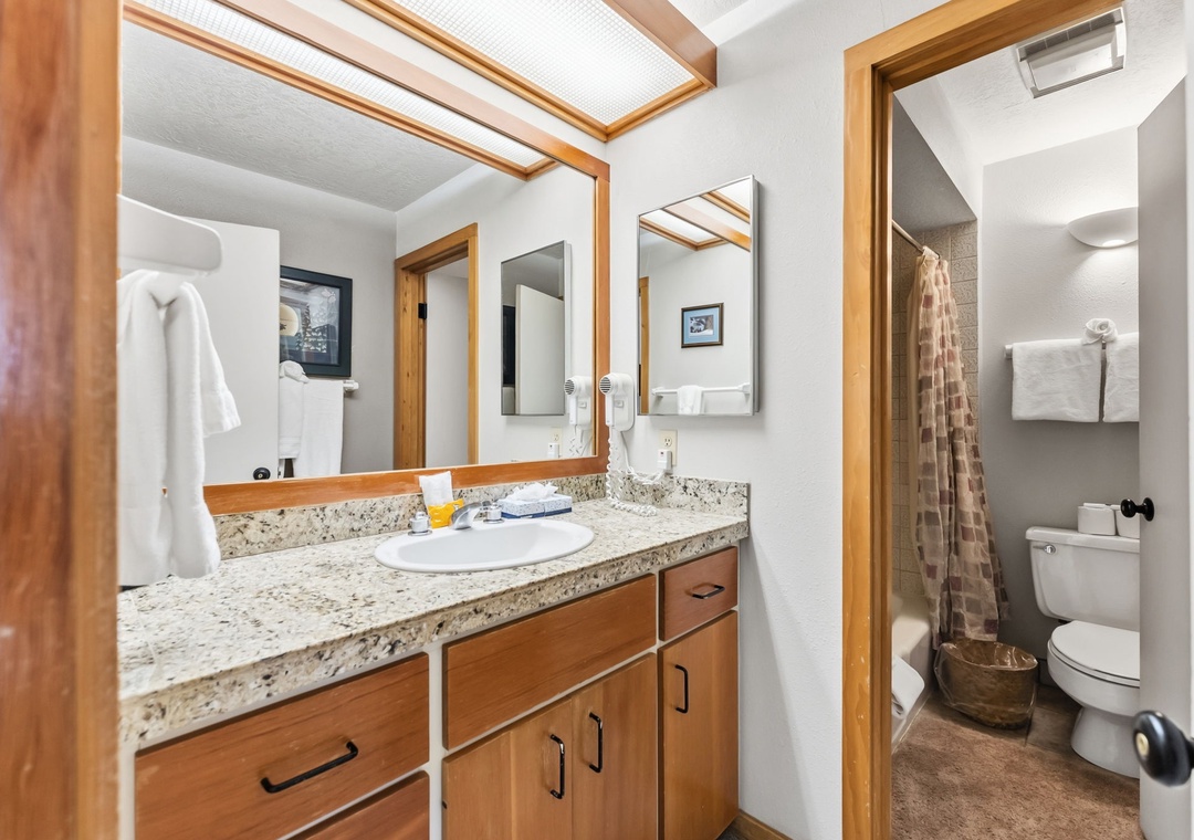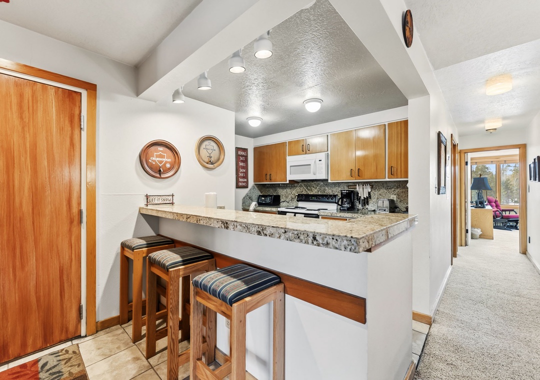 The full-size kitchen is well stocked with all essential cookware and tableware and features granite countertops, making it easy to prepare meals at home. The dining area comfortably seats eight, with three additional seats at the breakfast bar. A full bathroom is located just off the living area, and both bathrooms are stocked with towels and an initial supply of toiletries for your stay.