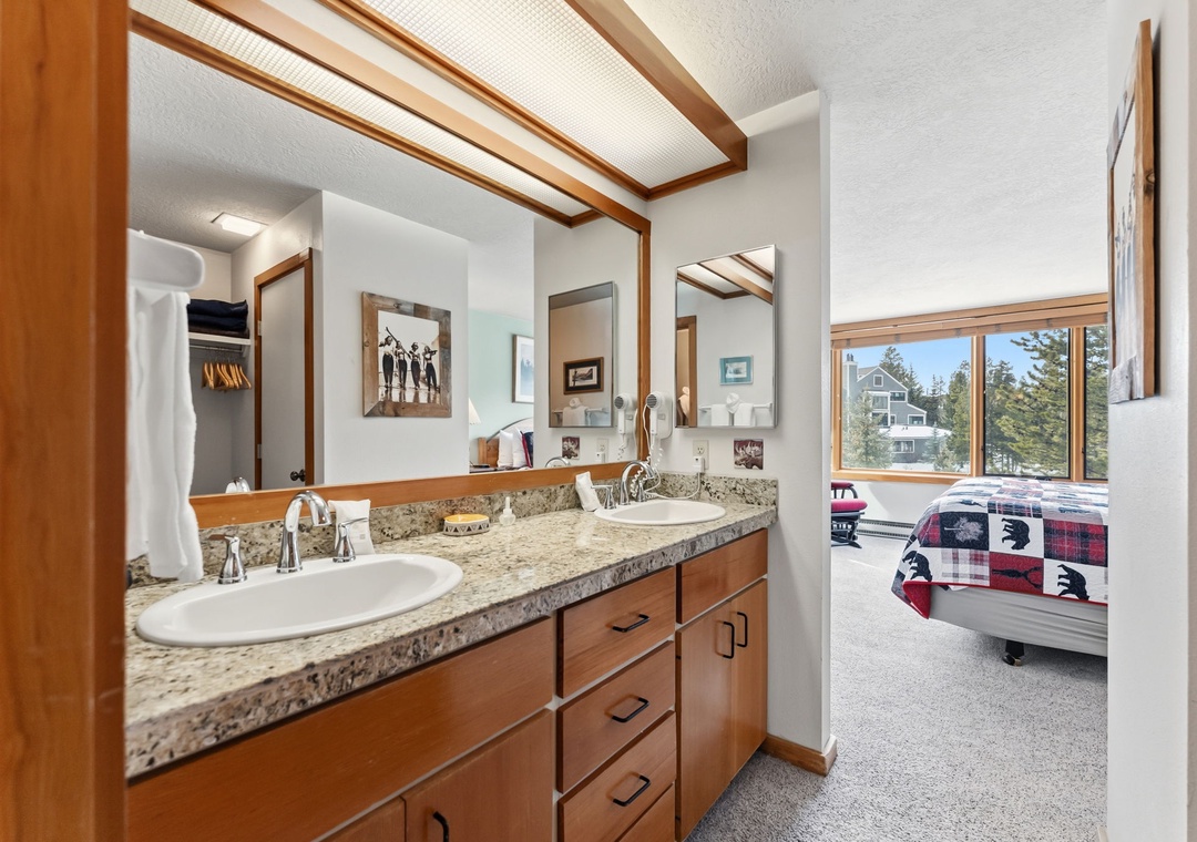 The primary bedroom features a king-sized bed, flat-screen TV, and a wall of picture-frame windows showcasing beautiful mountain views. The en suite bathroom includes double sinks with granite countertops, and the shower/tub and toilet area are separated by a door for added privacy. The second bedroom offers a queen bed with a double trundle pull-out, a flat-screen TV, and large picture-frame windows with equally stunning views.
