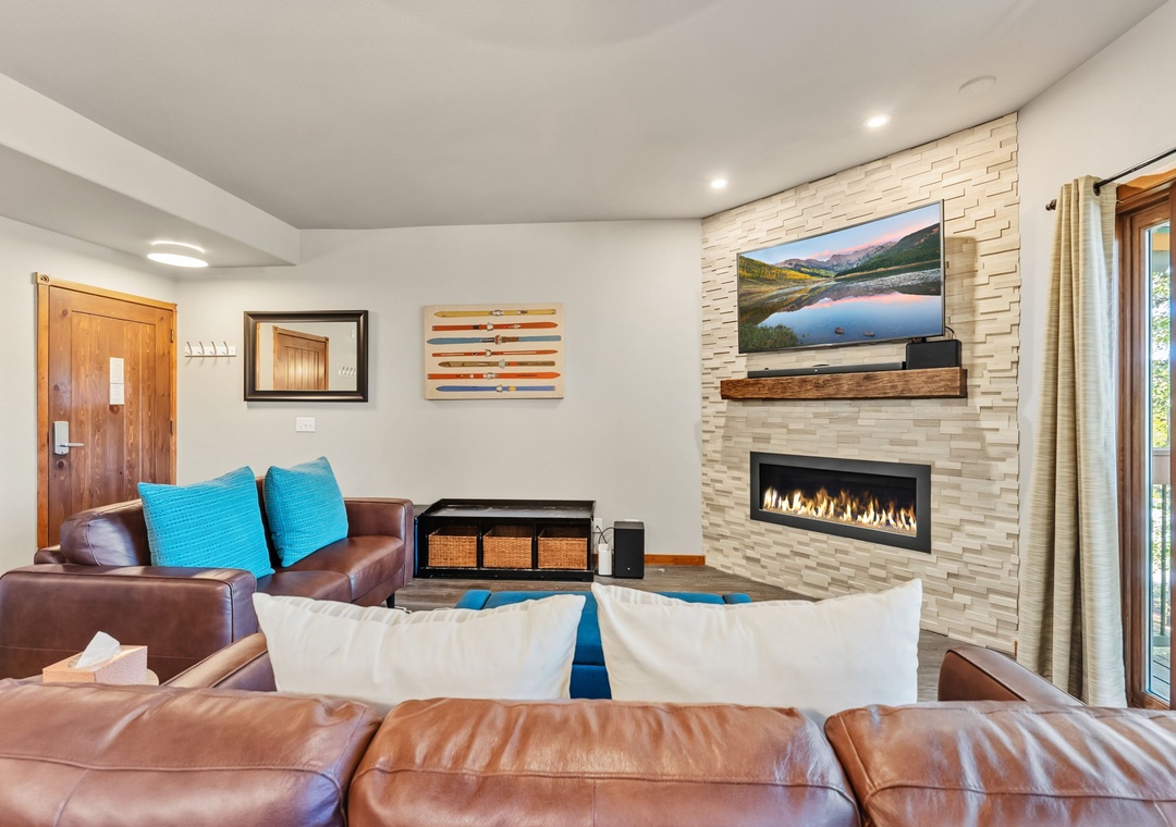 Inside, you’ll find a warm and comfortable living space with a gas fireplace, flat-screen TV, and plenty of seating for relaxing after a day in the mountains. The fully equipped kitchen features modern appliances and everything you need to prepare meals at home. Step out onto the private balcony to enjoy fresh mountain air and serene surroundings. The condo also includes an in-unit washer and dryer and heated garage parking for added convenience.