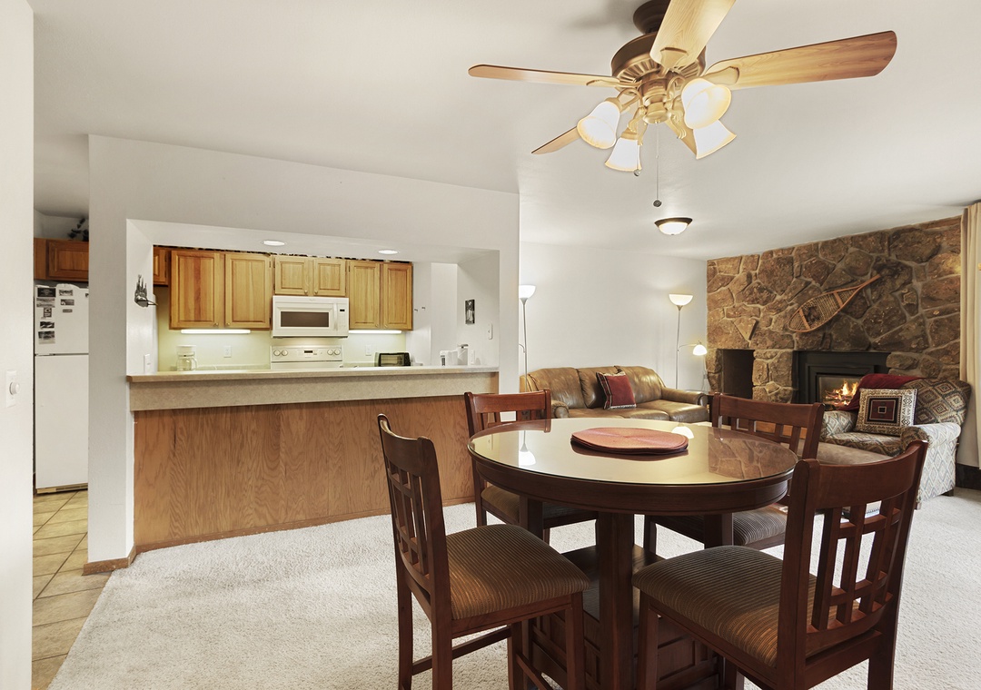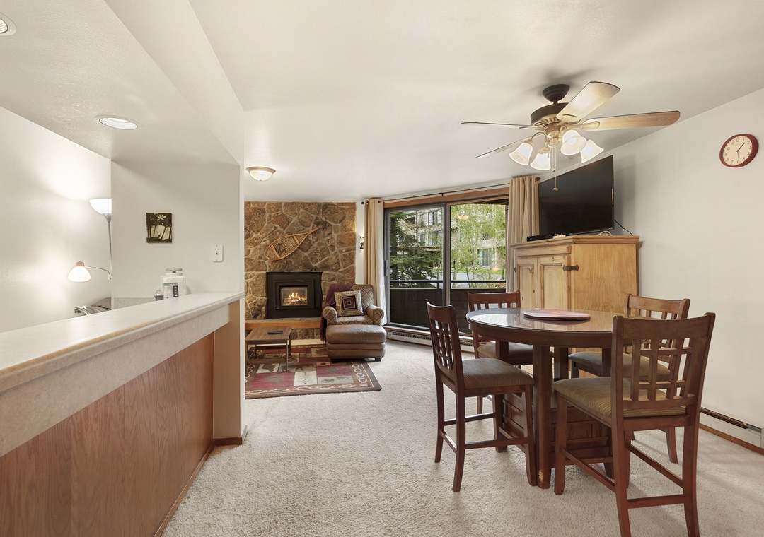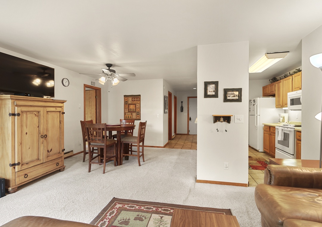 Upon entering the condo, you'll be greeted by an inviting open-concept living area, where natural light floods through large windows, showcasing the stunning mountain views. The living room features plush seating, a cozy fireplace, and a flat-screen TV, creating a relaxing atmosphere for unwinding after a day on the slopes or exploring the nearby trails.