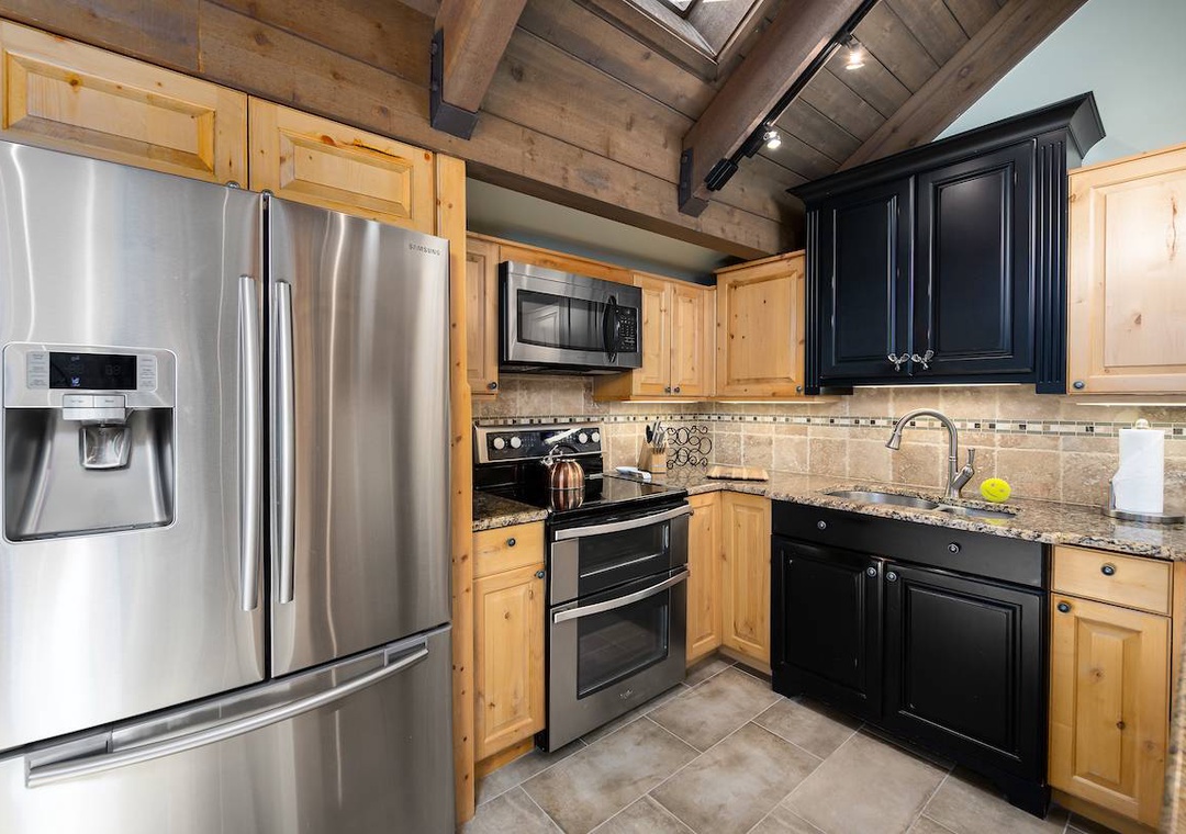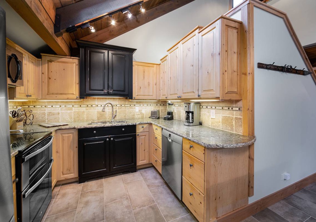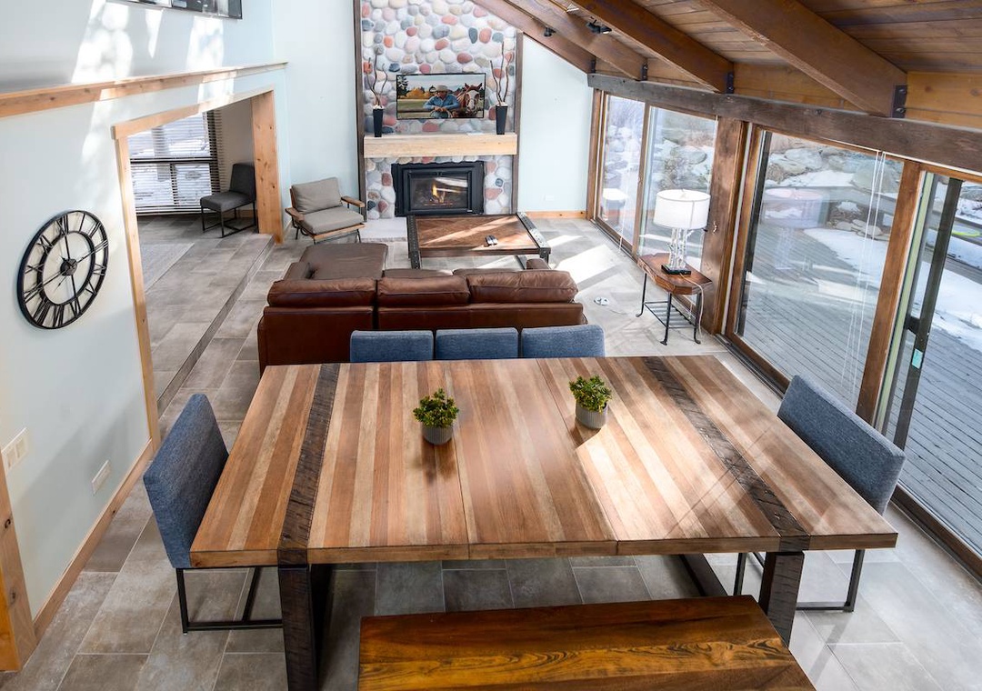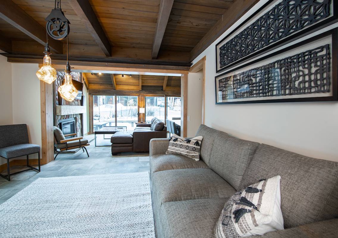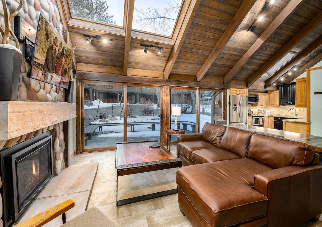 Step inside to find an inviting open concept living area complete with a stone fireplace, plush seating, and large windows that flood the space with natural light and views of the surrounding pines. The fully equipped kitchen features modern appliances and everything you need to whip up meals after a day on the slopes or exploring the nearby trails.