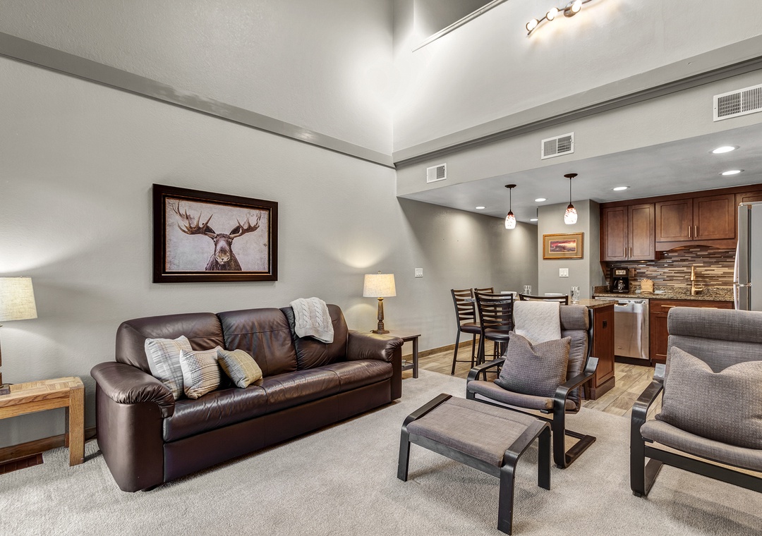 The kitchen captures extra sunshine and warmth from inviting sun light over the living room. Plus, the double story vaulted ceiling makes this cozy home feel even more spacious. The living room opens up to a private balcony with mountain views. Mountain View Getaway is your perfect spot to unwind after a long day of adventures.