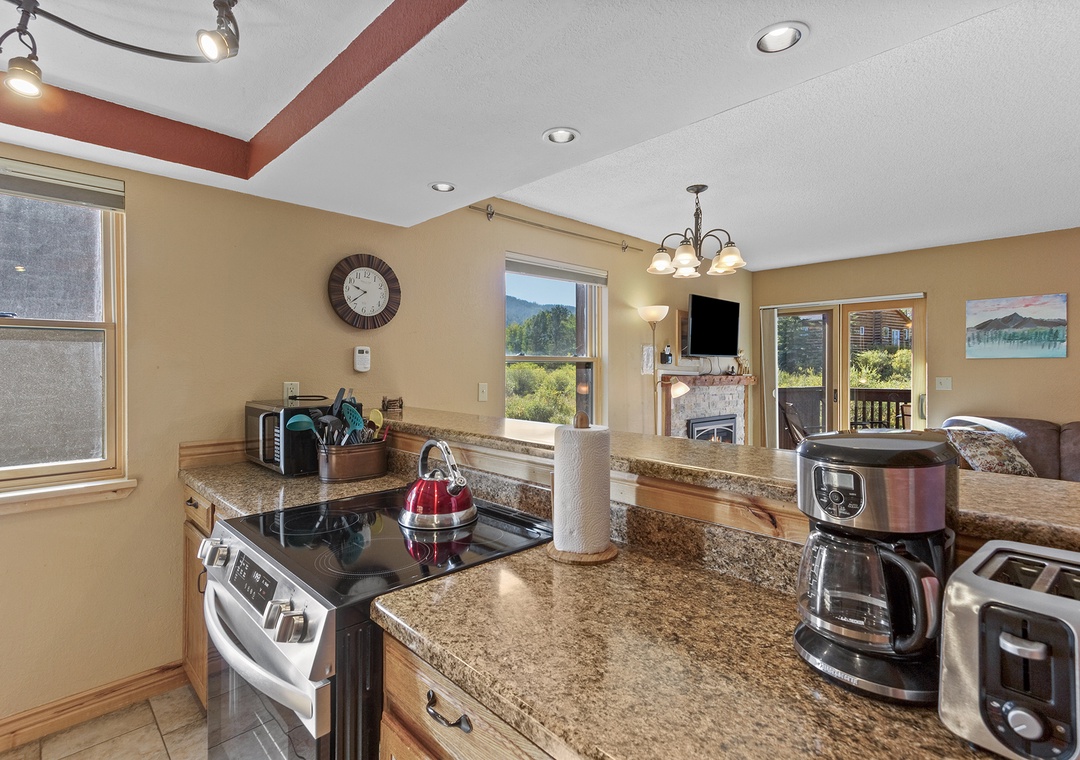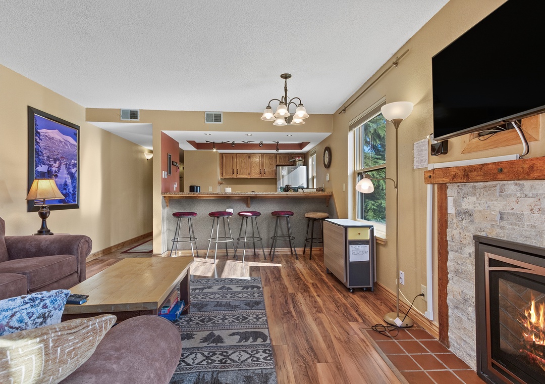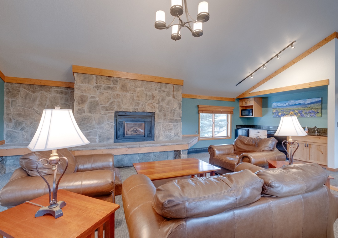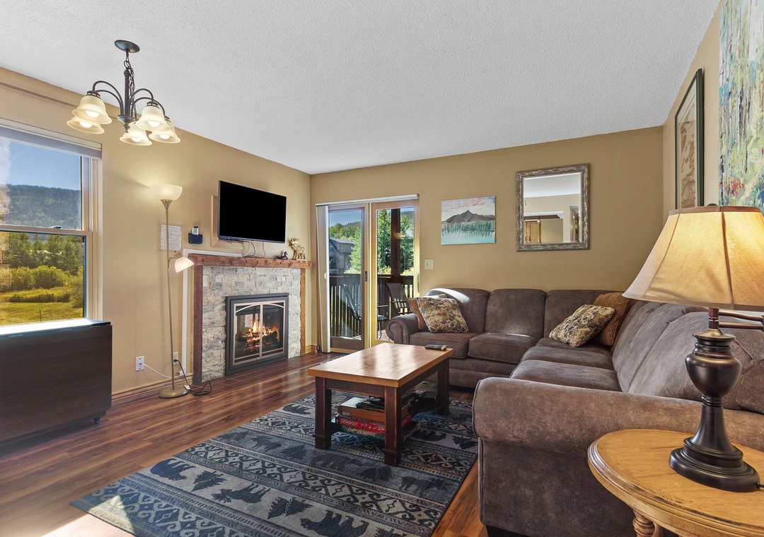 Step inside and be greeted by a warm and inviting living area, complete with comfortable furnishings, a fireplace to cozy up during the winter evenings, and large windows that offer breathtaking views of the surrounding mountains. You can then step out onto your private balcony and take in the crisp mountain air.