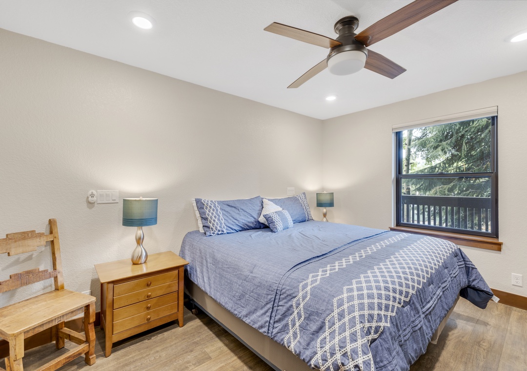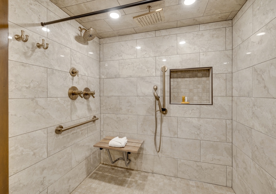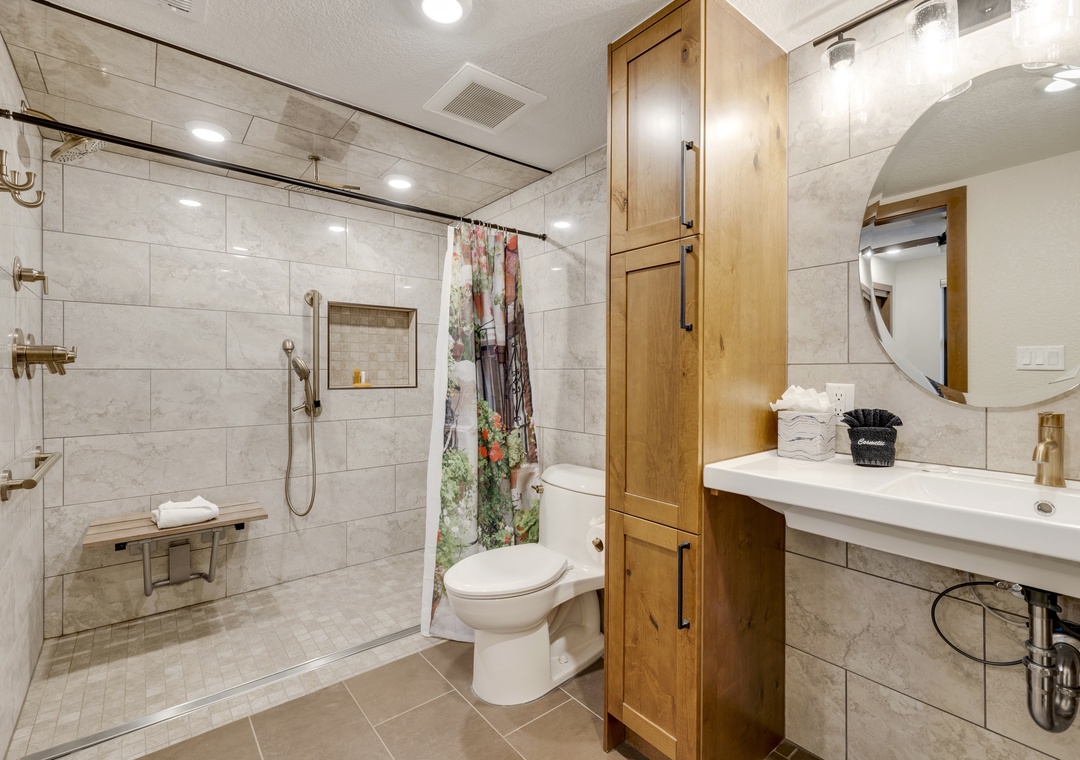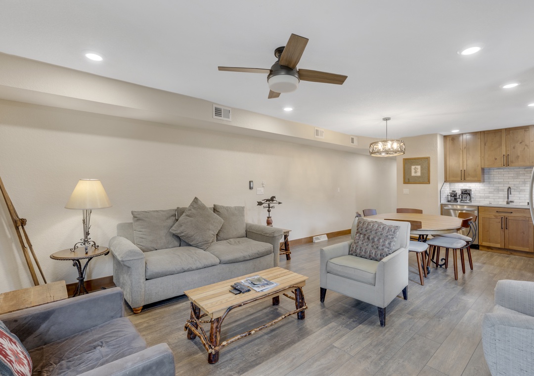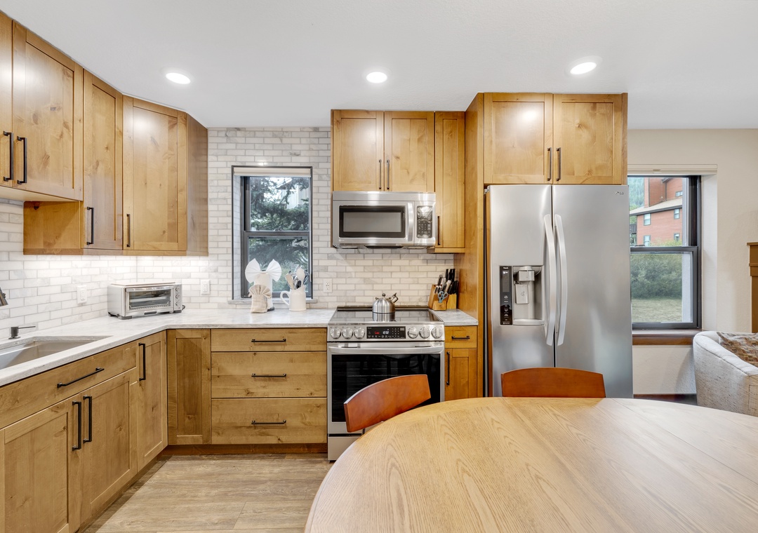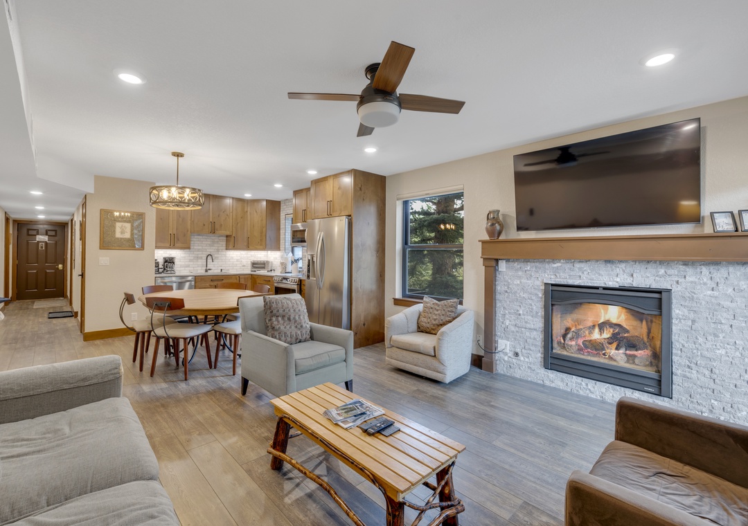 Inside, you’ll find a bright, open-concept layout with cozy mountain-inspired finishes. The living area centers around a newly converted gas fireplace, while the fully equipped kitchen and dining space provide everything you need to enjoy meals together after a day outdoors. Bedrooms are designed with comfort in mind to ensure a restful stay. Additionally, the Master Bathroom boasts a wheelchair accessible shower.