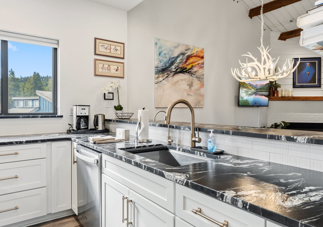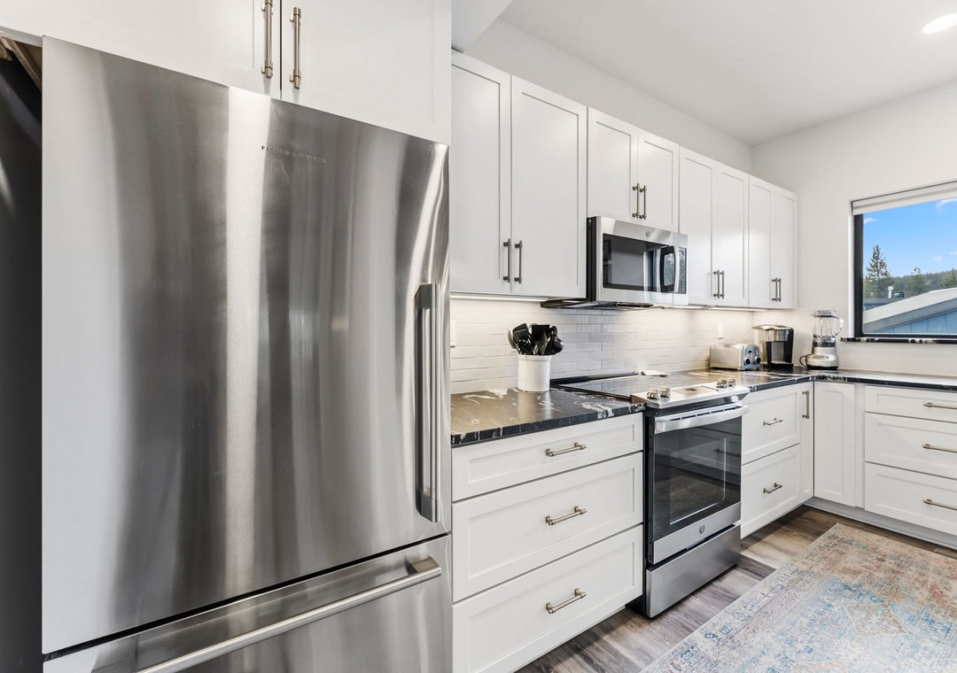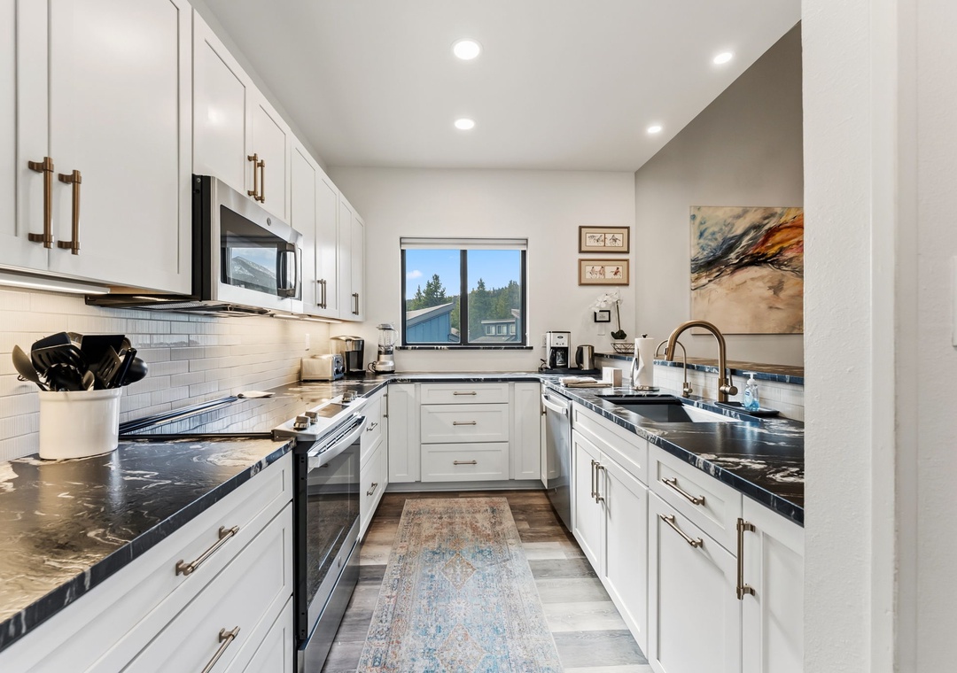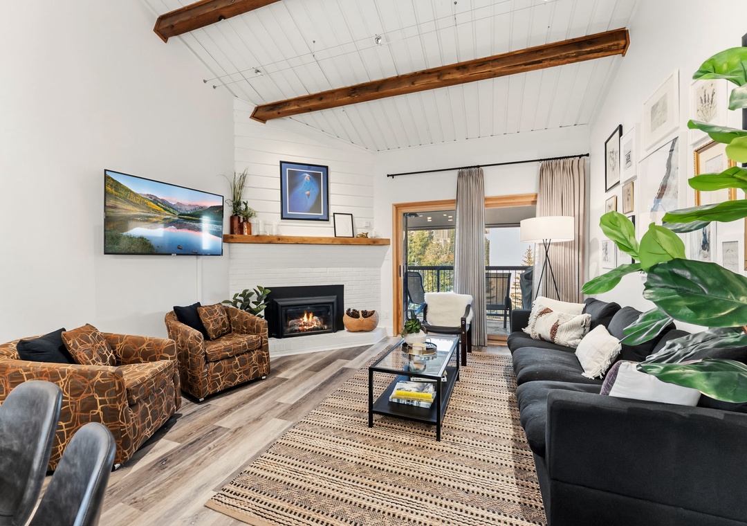 The newly remodeled kitchen (2023) is a chef's dream, equipped with brand-new appliances and drawers stocked with pots, pans, and gadgets, making it easy to whip up a gourmet feast. Step out onto the deck, where you'll find a propane grill facing the mountain, perfect for enjoying easy dinners while soaking in the breathtaking views. The dining table seats 8, providing ample space for everyone to gather and share stories from the day. The unit also features 28-foot ceilings, a gas fireplace, newly installed baseboard heaters (2022), and ceiling fans in the bedrooms for year-round comfort.