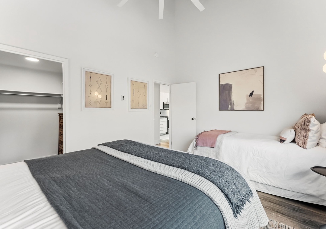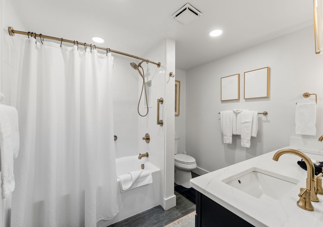 The guest room includes a twin and a queen bed, both with new mattresses (2021), blackout shades (2022) for a restful sleep, and a detached bathroom that doubles as a powder room for all guests.