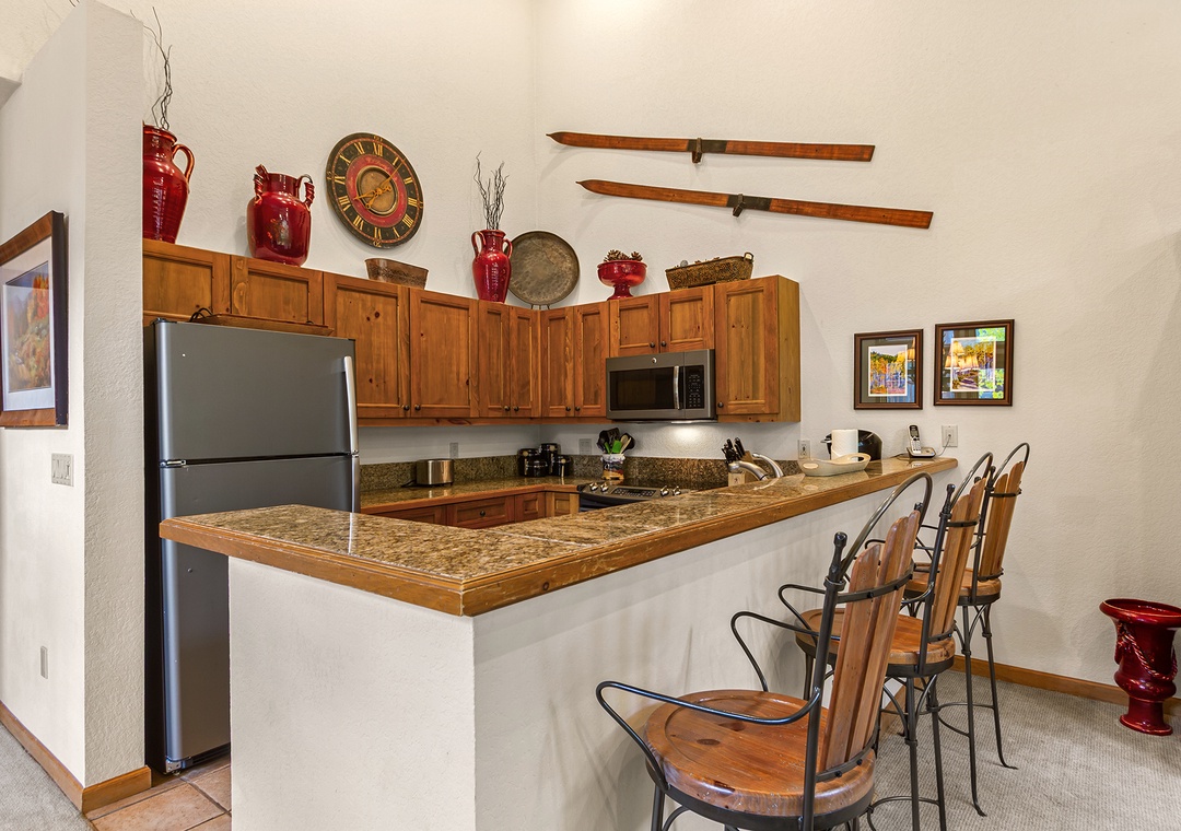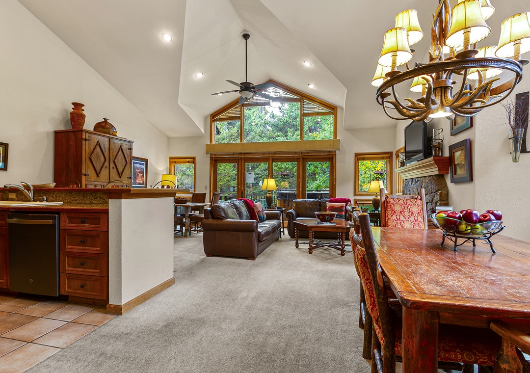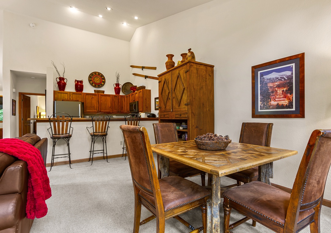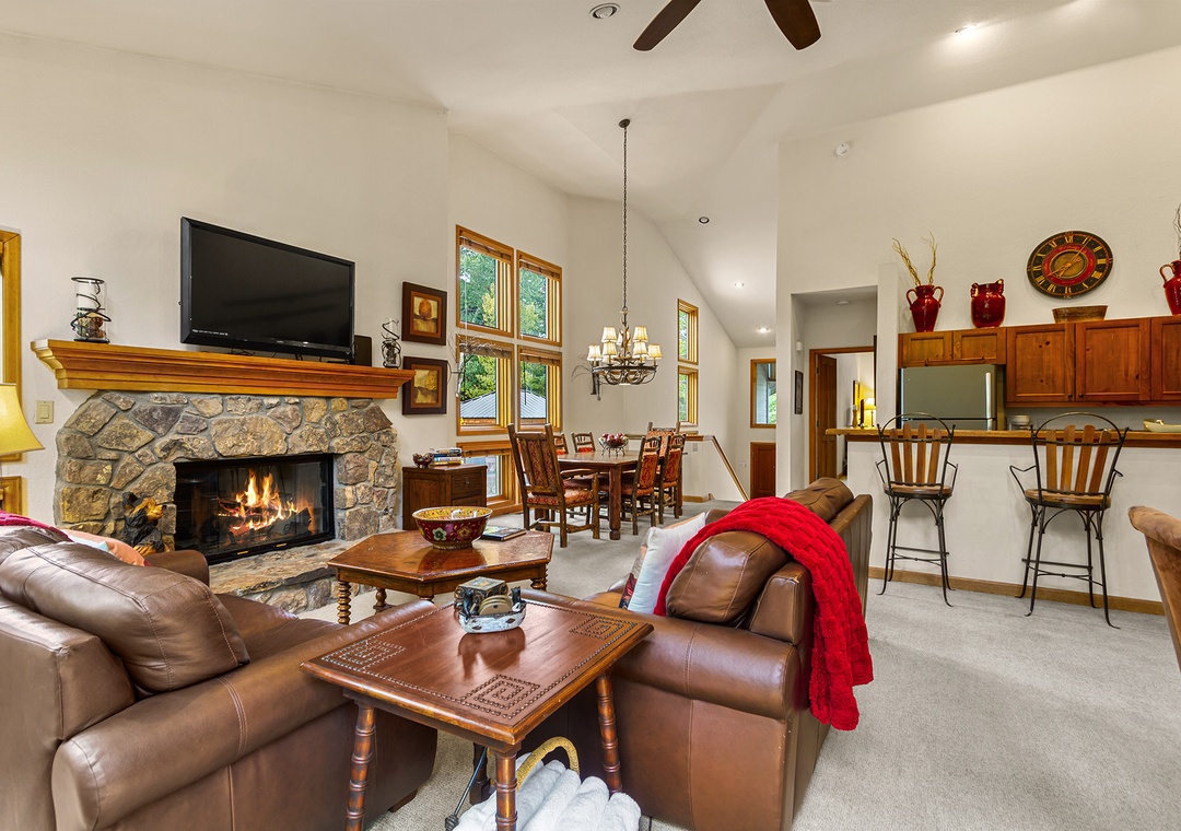 Inside, the space is warm and inviting, with classic ski-town character. The living area features a cozy gas fireplace, comfortable seating, and a flat-screen TV—perfect for unwinding after a day on the mountain. The kitchen is fully equipped with everything you need to cook at home, and the dining area is ideal for meals or game nights with friends and family.