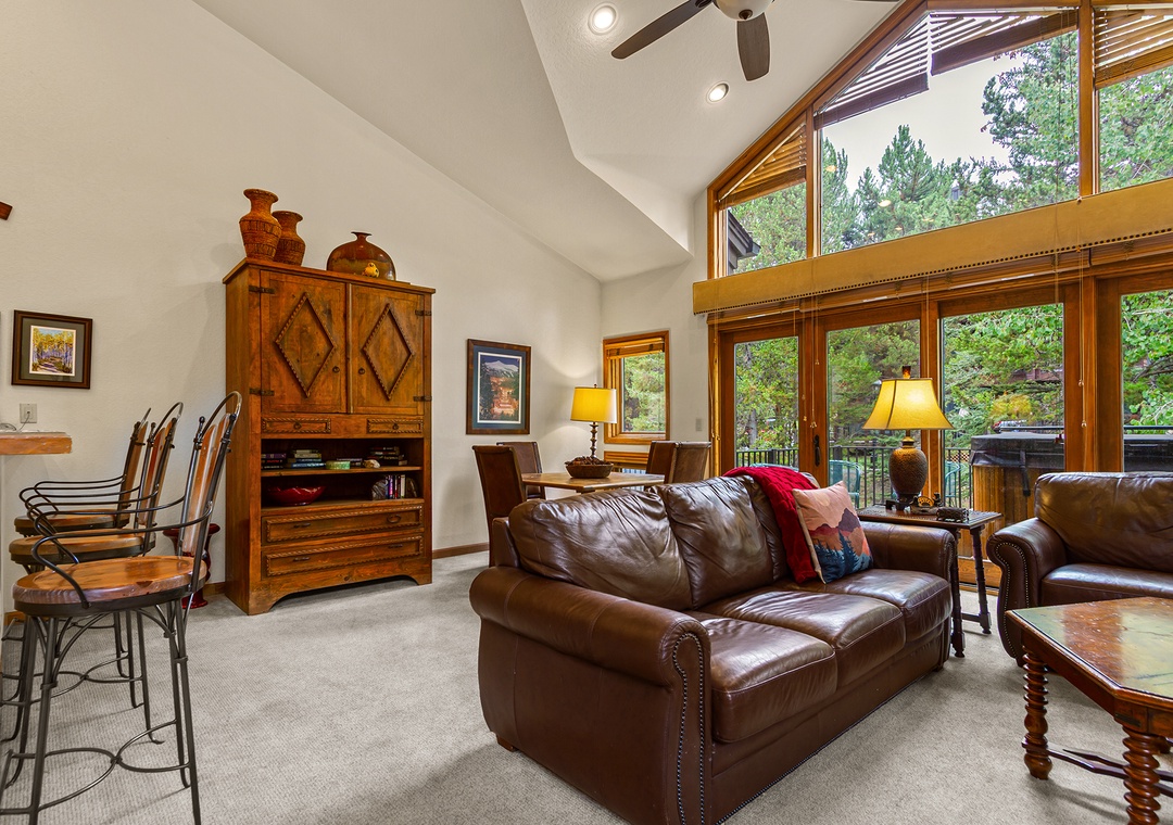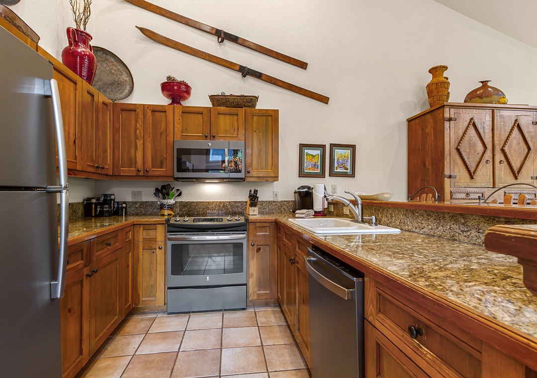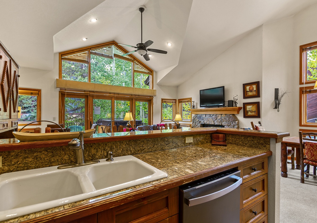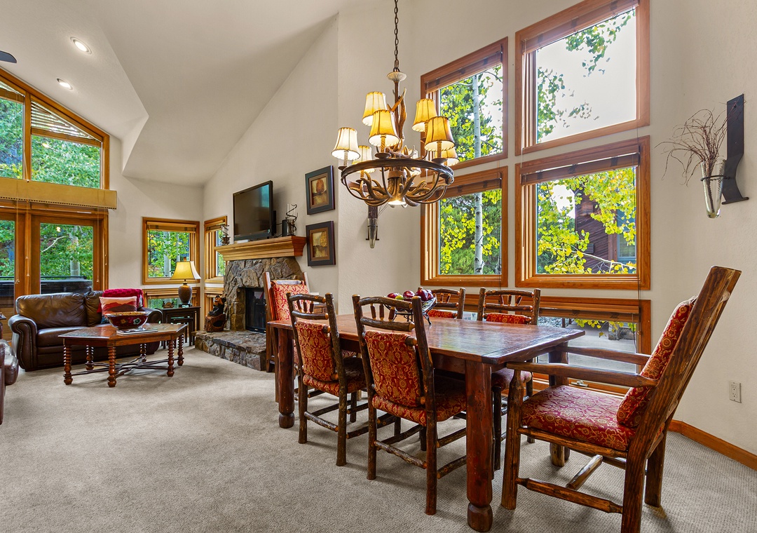 Inside, the space is warm and inviting, with classic ski-town character. The living area features a cozy gas fireplace, comfortable seating, and a flat-screen TV—perfect for unwinding after a day on the mountain. The kitchen is fully equipped with everything you need to cook at home, and the dining area is ideal for meals or game nights with friends and family.