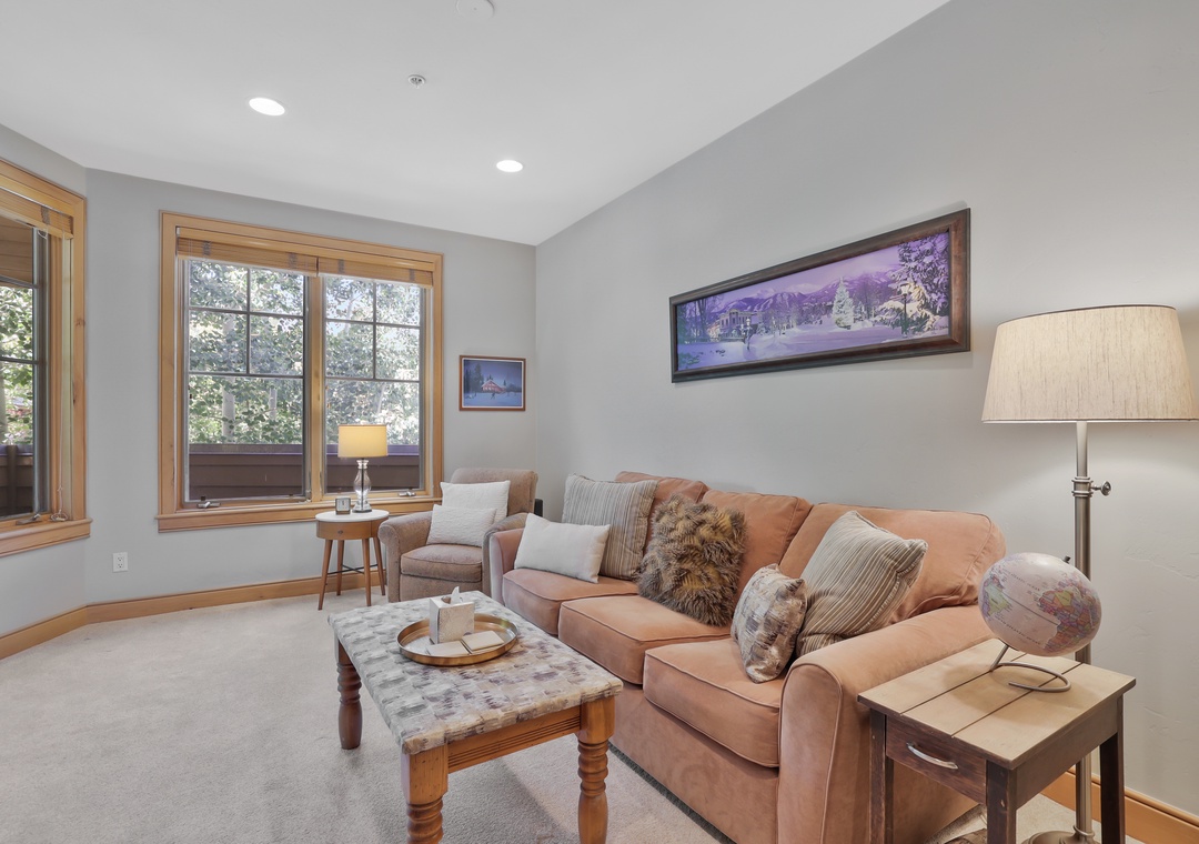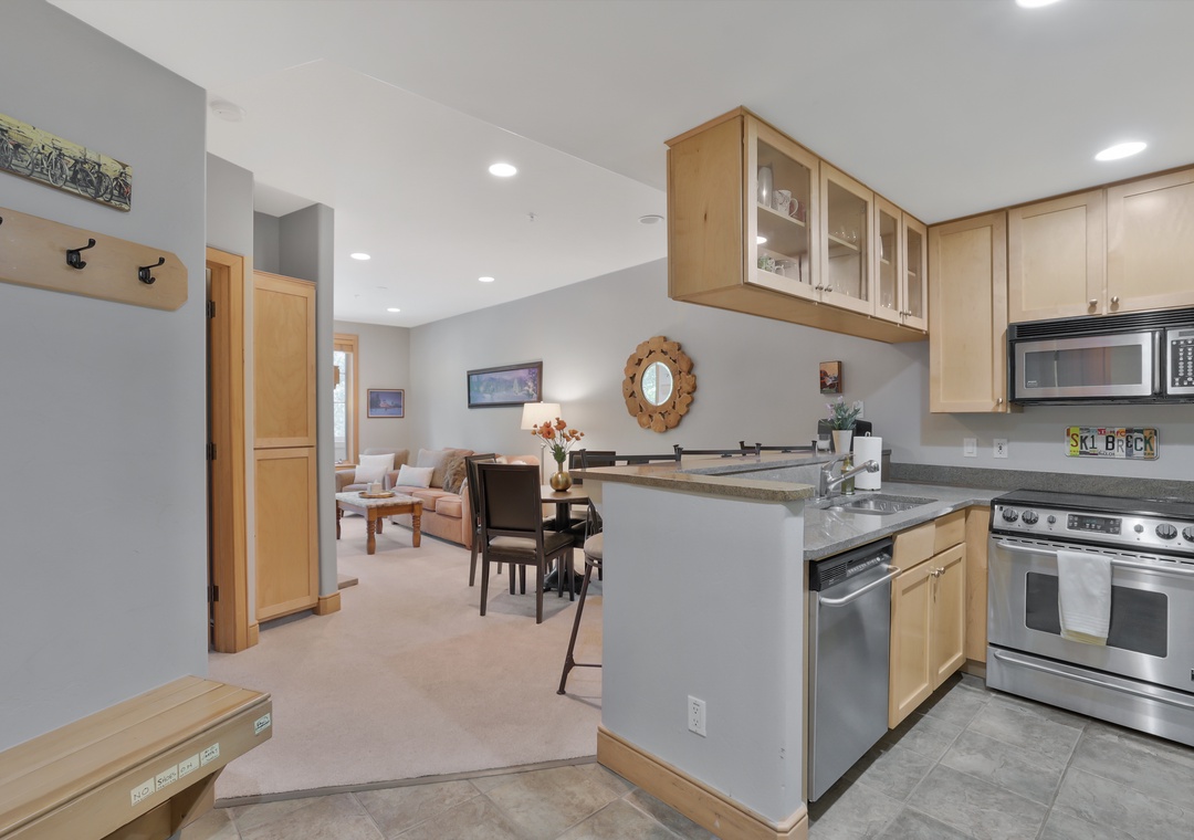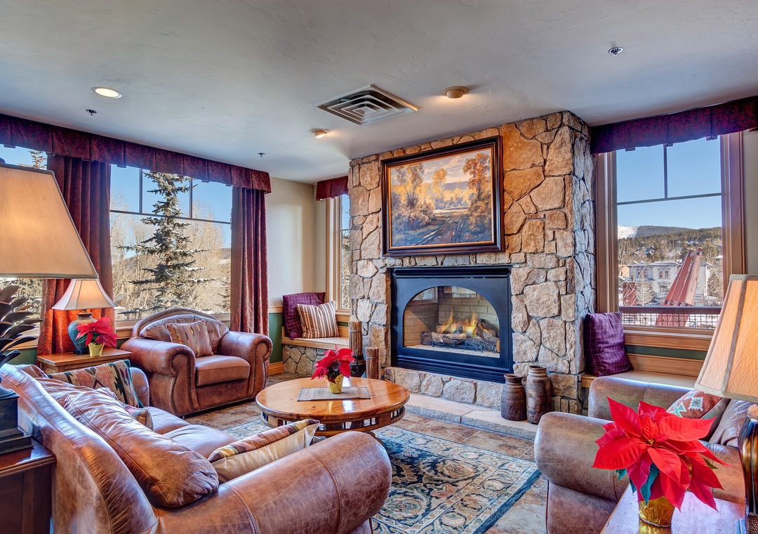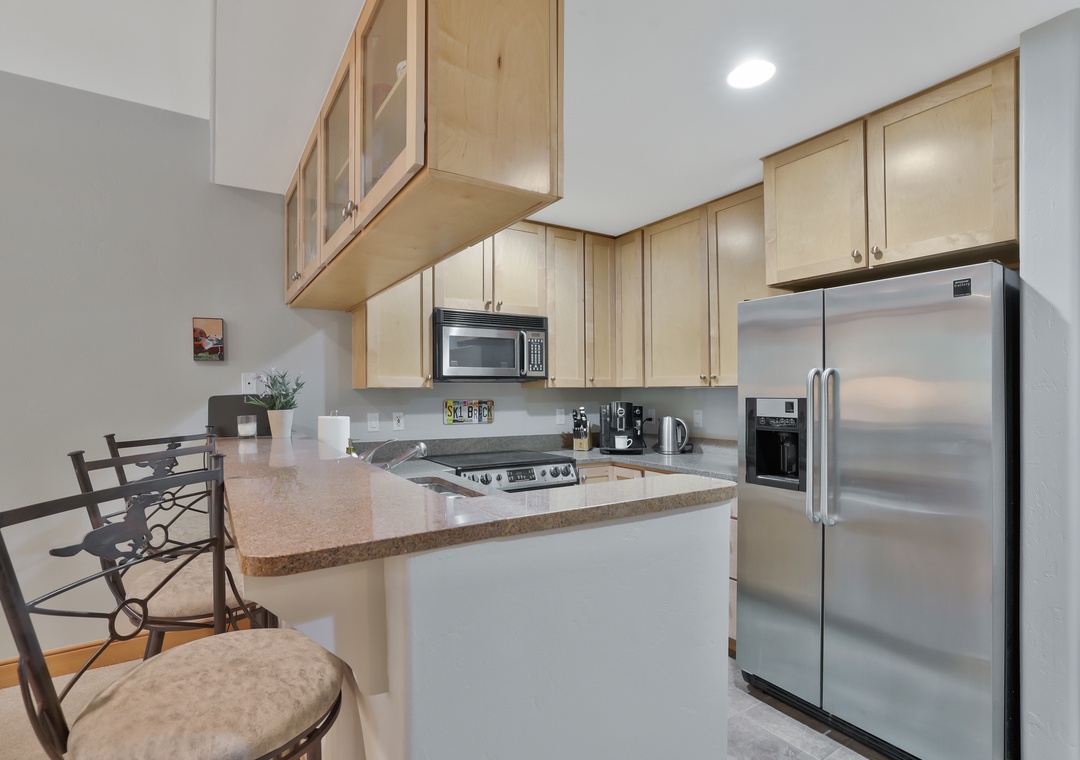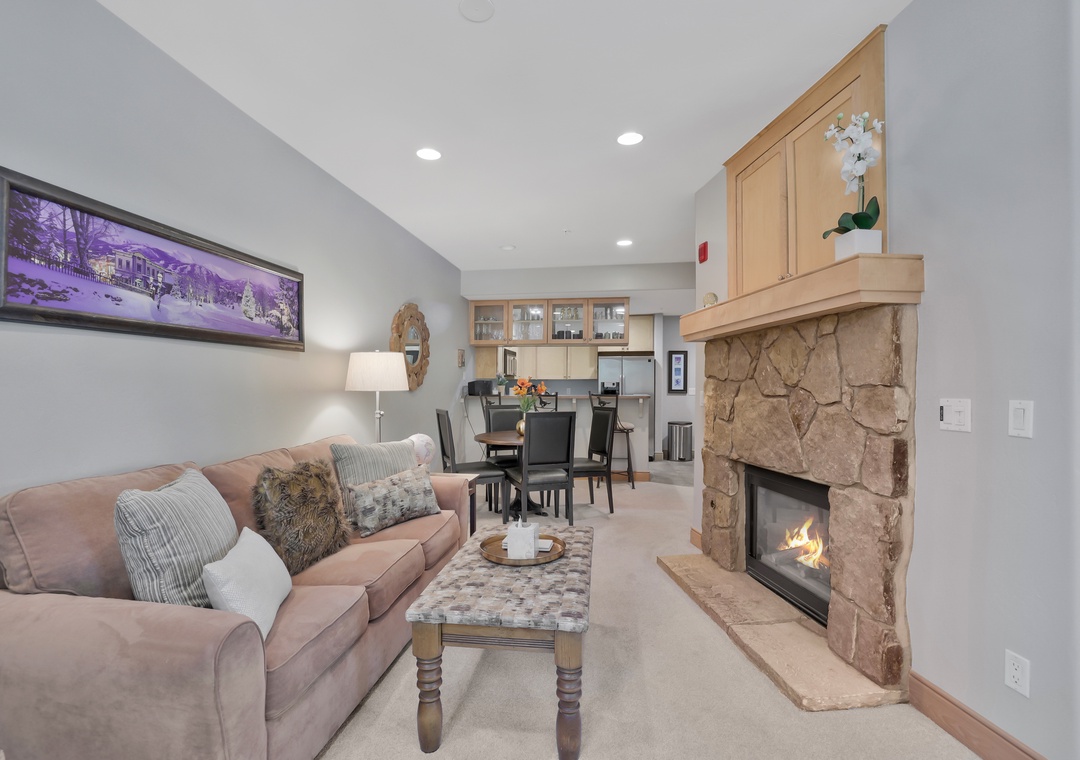 This beautiful one-bedroom condo is located right on Park Avenue, across the street from the ski lifts and 1/2 block to Main Street. Step into a cozy living area designed for relaxation, where a plush sleeper sofa invites you to unwind by the warmth of a gas fireplace. The space is accented by a flat-screen TV and large windows that fill the room with natural light, offering glimpses of the beautiful mountain scenery outside. The well-equipped kitchen boasts modern appliances and all the essentials needed to prepare a delightful meal, with a convenient breakfast bar that seats two.