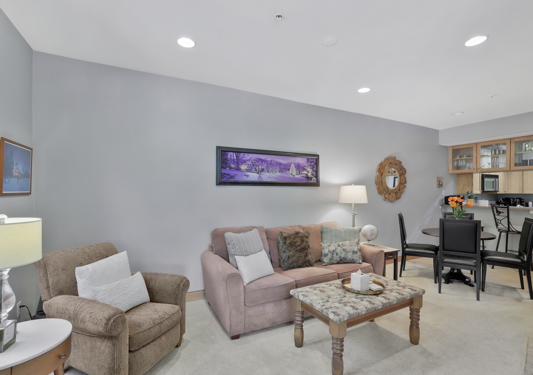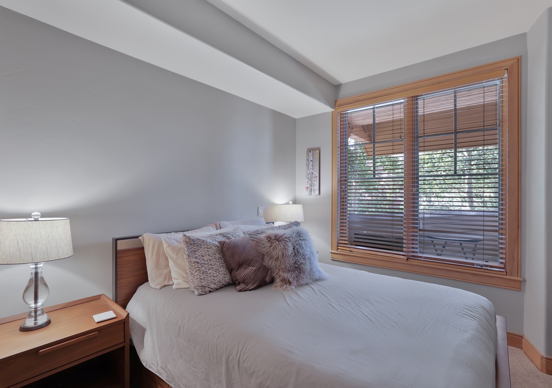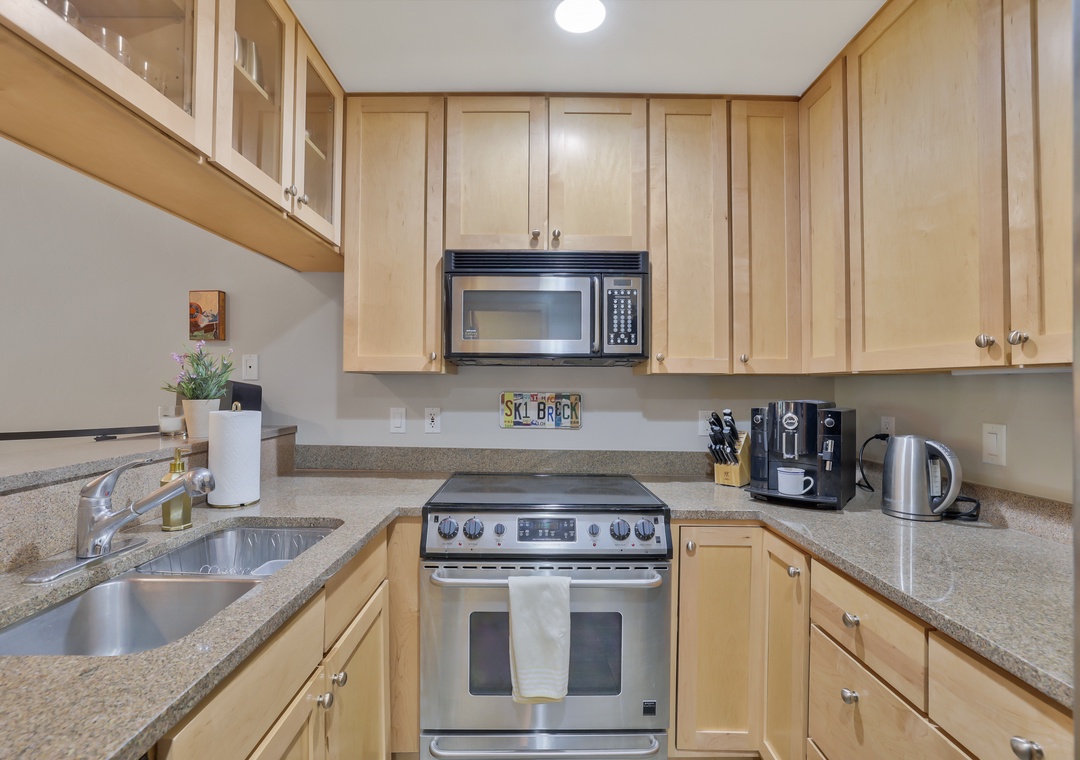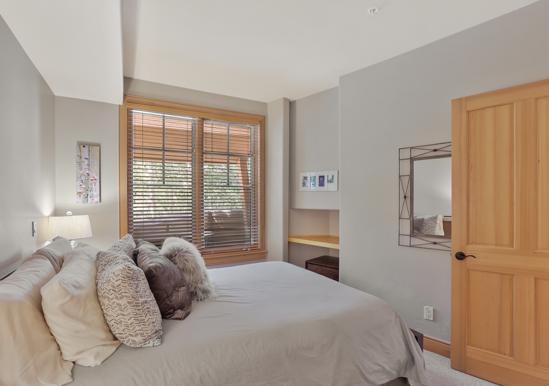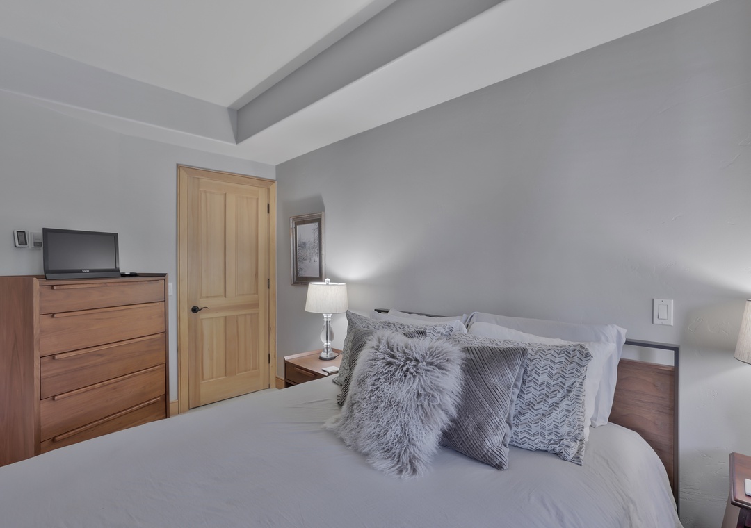 This beautiful one-bedroom condo is located right on Park Avenue, across the street from the ski lifts and 1/2 block to Main Street. Step into a cozy living area designed for relaxation, where a plush sleeper sofa invites you to unwind by the warmth of a gas fireplace. The space is accented by a flat-screen TV and large windows that fill the room with natural light, offering glimpses of the beautiful mountain scenery outside. The well-equipped kitchen boasts modern appliances and all the essentials needed to prepare a delightful meal, with a convenient breakfast bar that seats two.