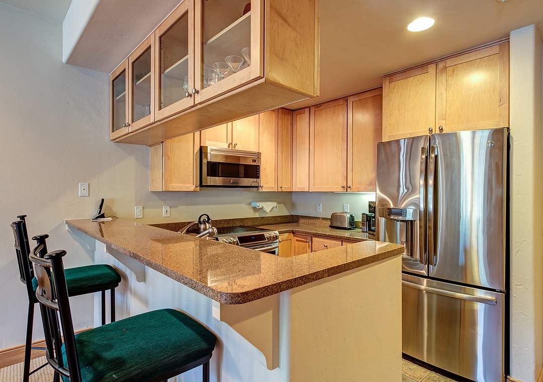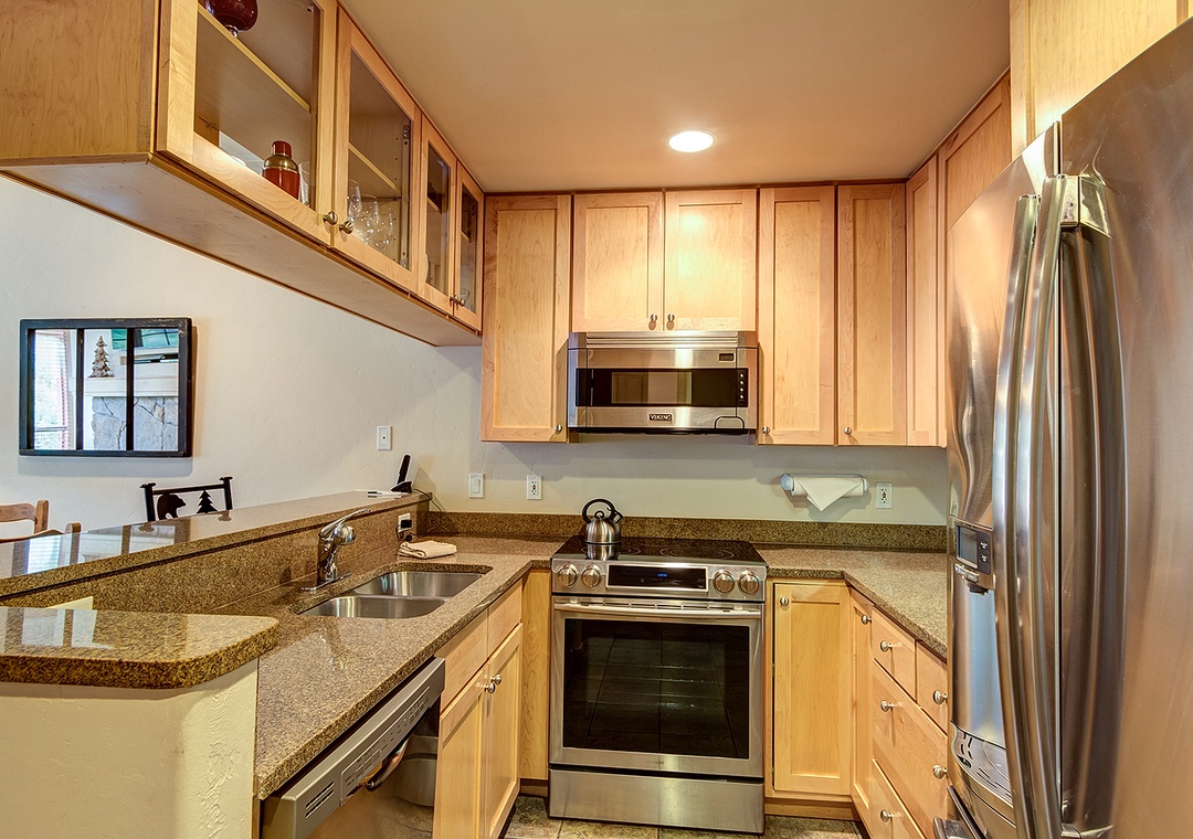 The large windows bring in natural light and mountain views. The sleek kitchen features granite countertops and stainless steel appliances, making it easy to cook and entertain. Step out onto your private balcony to breathe in the crisp alpine air or enjoy your morning coffee with views of the slopes.