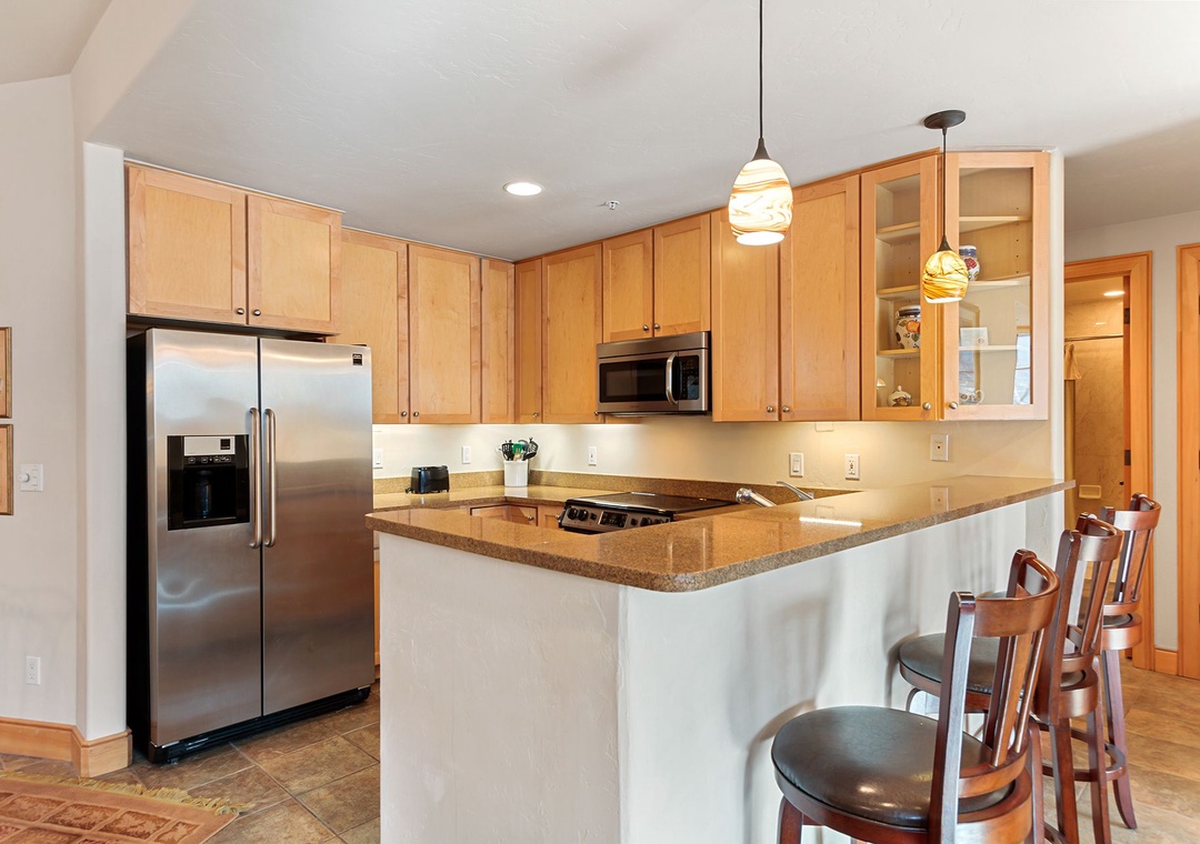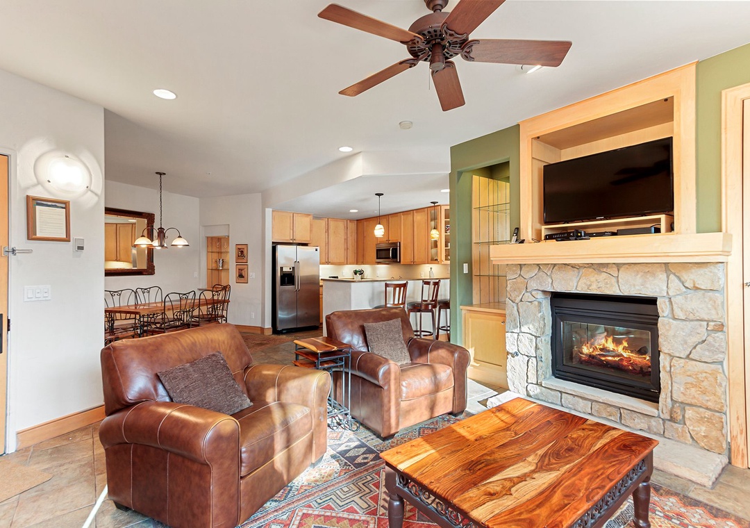 This two bedroom corner unit is our largest unit in the entire building, featuring 1288 square feet of living area. The floor plan offers tiled flooring, a cozy two-sided gas fireplace in the living area & master bedroom, nice dining area, and a mountain view from the balcony. The property provides a large master bedroom with a king-sized bed, and stays cozy with the fireplace. Other property features include a washer/dryer, stainless steel appliances and one underground parking space. The building also offers a fitness room, free ski concierge service and a lobby with a fireplace and couches. All of the attractions of Main Street are just a short 1/2 block walk, and the Quicksilver Chairlift and the base of Peak 9 are right across the street.