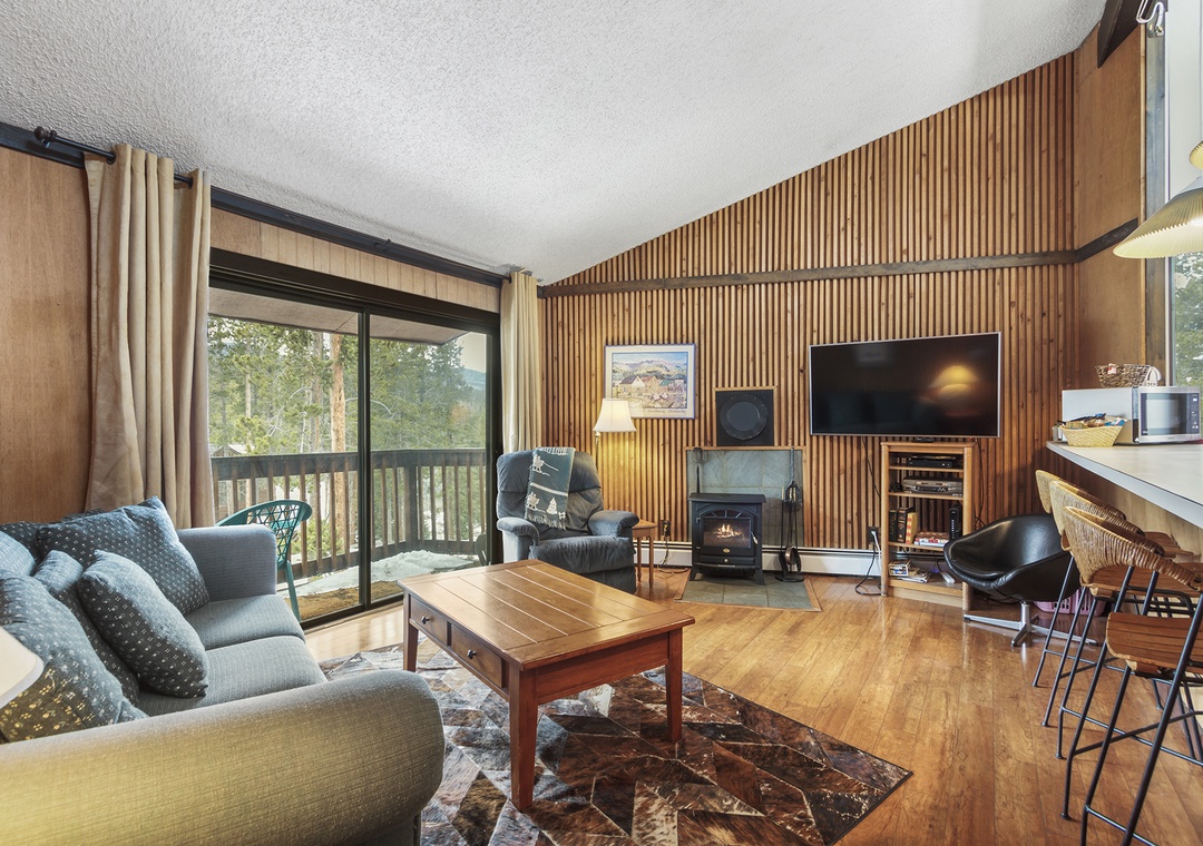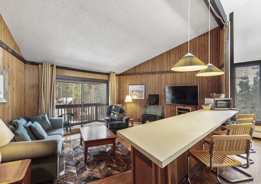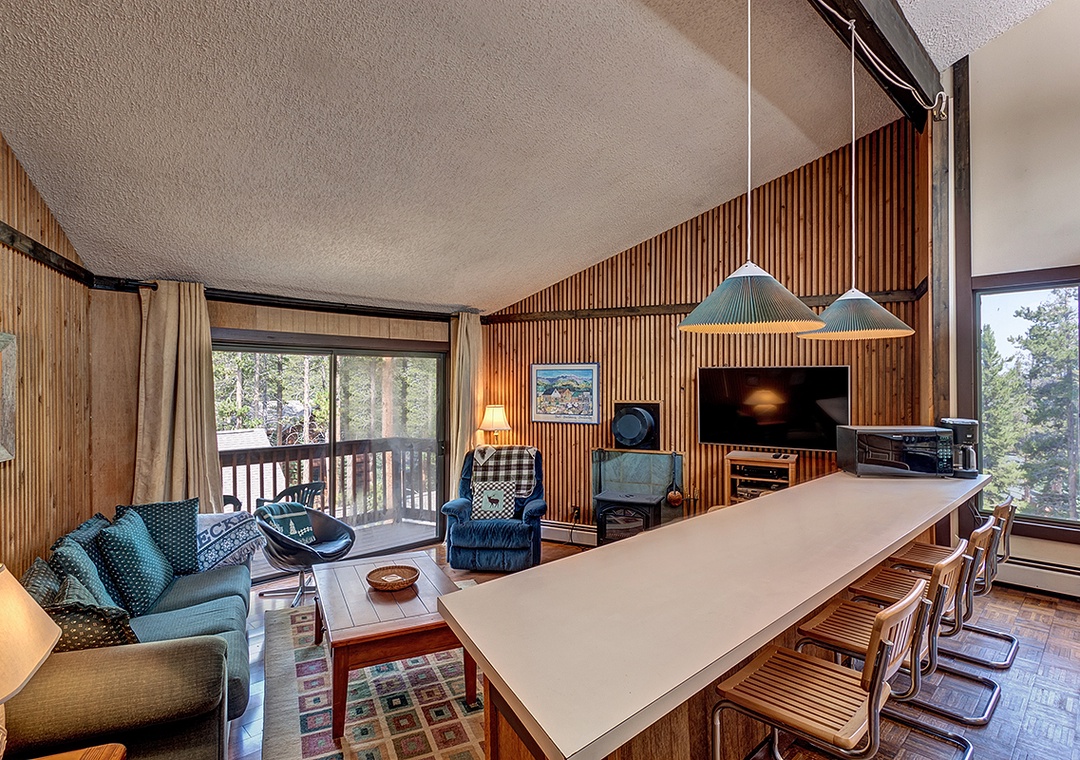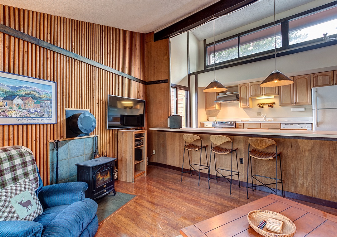 Condo itself is a 2 bedroom, 1 bath top floor unit. Very quiet, with great mountain feel. Step out onto your deck and enjoy the views of the forest and mountains. Kitchen, dining and living room are in great room style, making your vacation condo a roomy area to relax after skiing or enjoying the town of Breckenridge. The long kitchen counter doubles as a dining table, allowing you to serve home cooked meals for the family. Living area has a couch, recliner, TV, cable, DVD player, and cozy stove. Full kitchen was recently remodeled and boasts skylights across the entire east wall, providing a lot of light and warmth into the kitchen and living room areas.