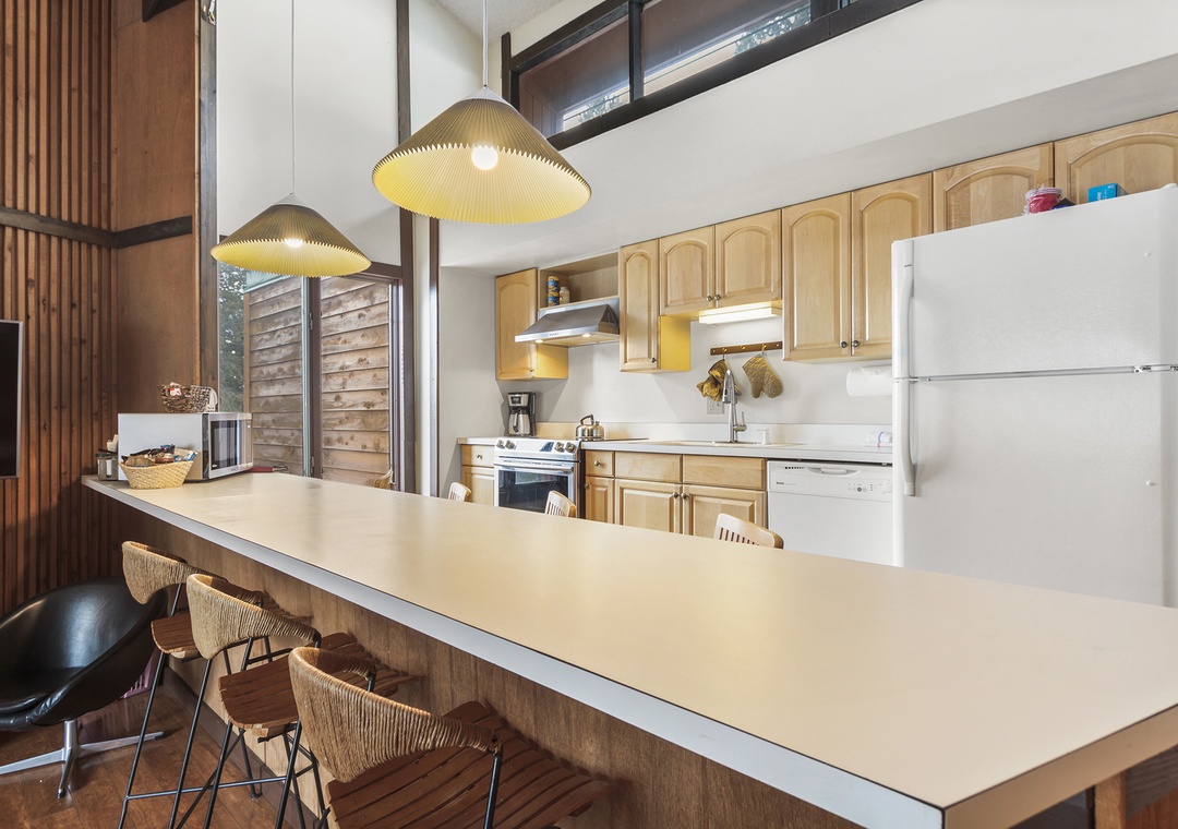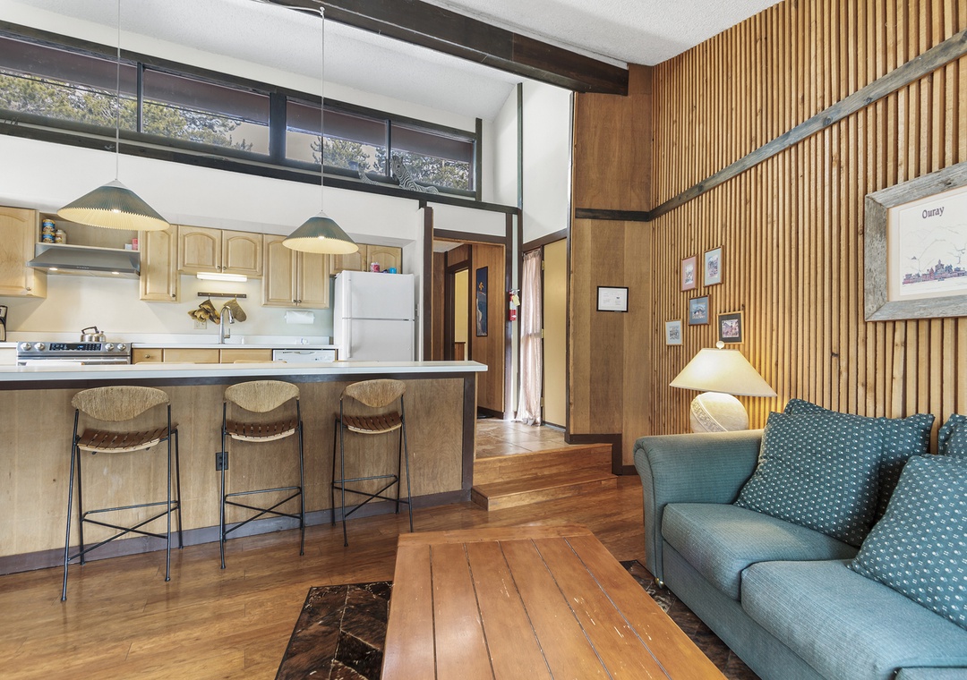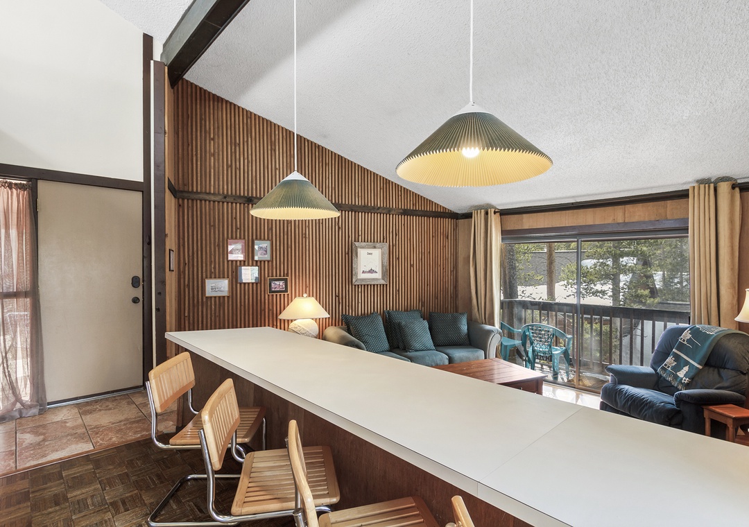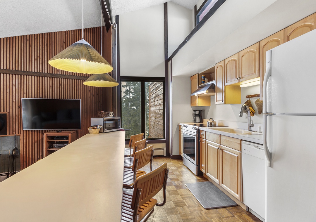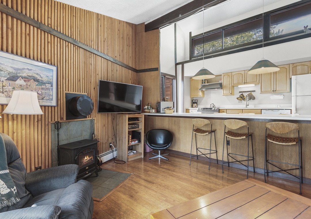 Condo itself is a 2 bedroom, 1 bath top floor unit. Very quiet, with great mountain feel. Step out onto your deck and enjoy the views of the forest and mountains. Kitchen, dining and living room are in great room style, making your vacation condo a roomy area to relax after skiing or enjoying the town of Breckenridge. The long kitchen counter doubles as a dining table, allowing you to serve home cooked meals for the family. Living area has a couch, recliner, TV, cable, DVD player, and cozy stove. Full kitchen was recently remodeled and boasts skylights across the entire east wall, providing a lot of light and warmth into the kitchen and living room areas.