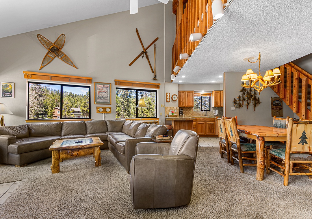 This spacious condo comfortably accommodates families and groups. The living area invites you to gather around a wood-burning fireplace, enjoy the oversized sofa, and unwind with a movie on the large TV. The fully equipped kitchen features stainless steel appliances, gleaming countertops, and a breakfast bar, perfect for cooking and dining together. Meals feel extra special under the glow of the rustic antler chandelier.