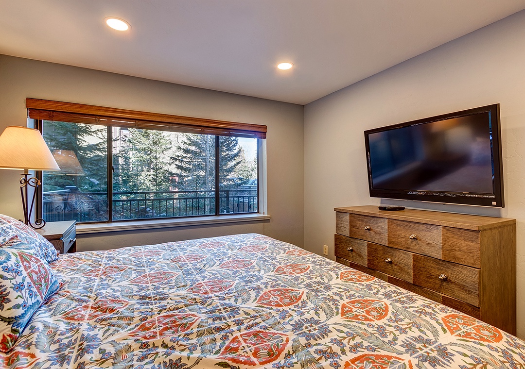 This two bedroom condominium is one of our best values in-town, and it's close to everything. Only 200 yards from the 6-person Quicksilver chair lift, it is an easy 3-4 minute walk to the lift each day. When you're not skiing, it's just two blocks from the heart of downtown Breckenridge. This condo is highlighted with contemporary furnishings and an open living area and dining room. It has been recently updated with flat screen TVs in the living room and master bedroom. Guests really love the serenity of the quiet wooded backdrop and the nearby mountain stream in the summer. Also, stay connected with recently updated, free high-speed wireless internet.