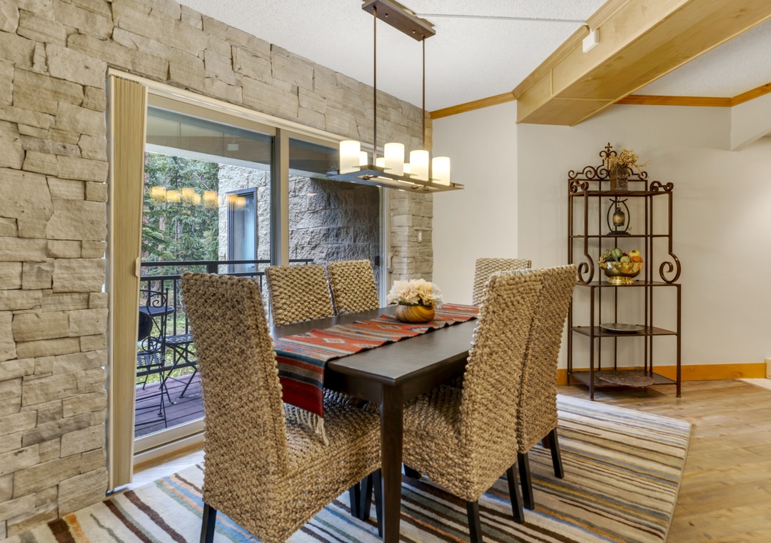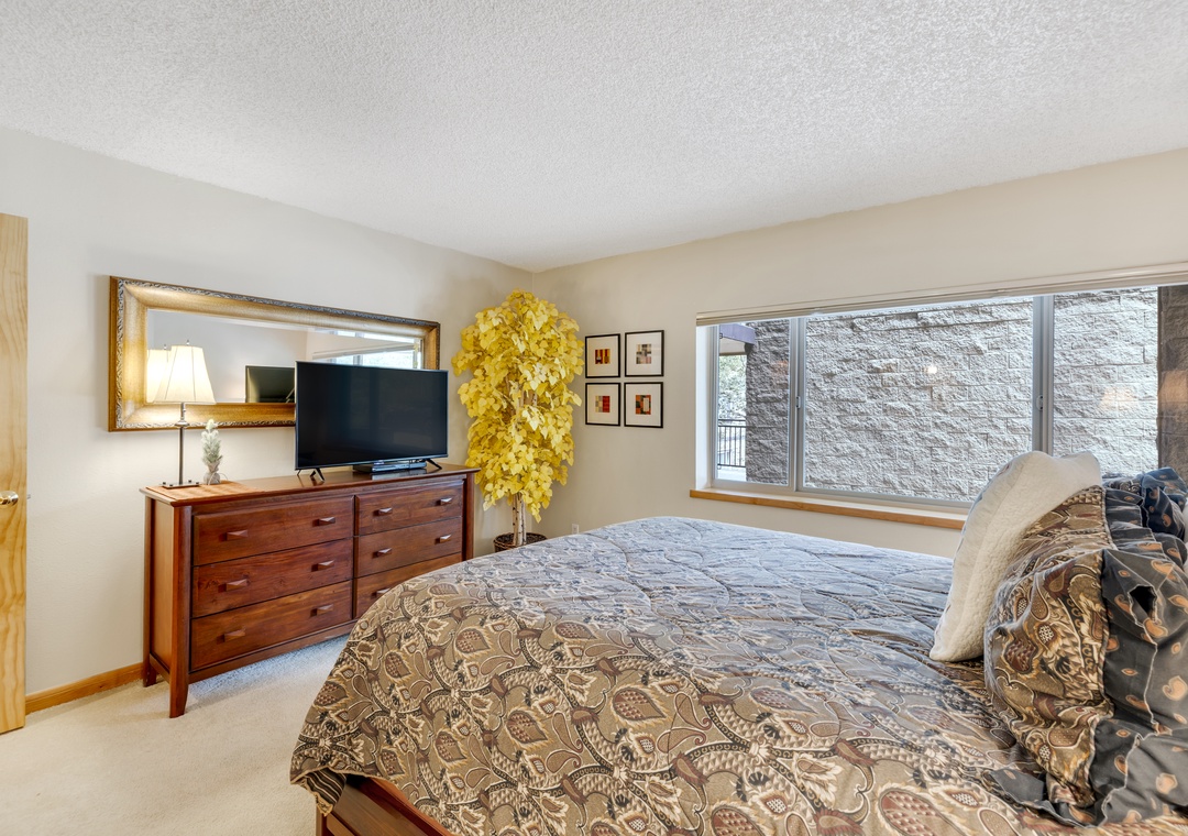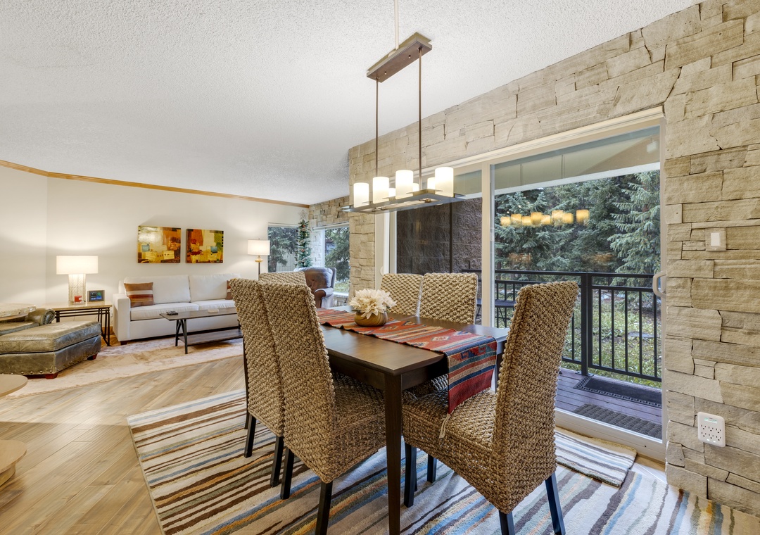 Inside, the condo offers a spacious, open-concept living area with a cozy stone fireplace, a fully equipped kitchen. After a day on the slopes or trails, relax on the private patio with peaceful wooded views. The primary bedroom features a comfortable queen bed and a private en-suite bath. There’s also a queen sleeper sofa in the living room for extra guests.