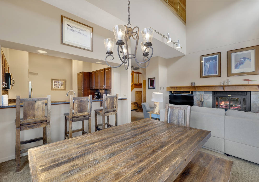 Step inside to discover an open-concept great room with soaring vaulted ceilings and expansive windows that flood the space with natural light and stunning mountain views. After a day on the slopes or trails, cozy up by the warmth of the cozy fireplace that anchors the living space in rustic comfort and charm.
